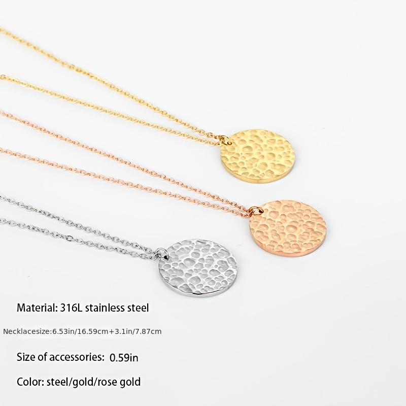 Elegant and stylish pendant necklace featuring a round plate design with embossed details. Made of stainless steel with 18K gold plating, this necklace is perfect for her everyday wear.