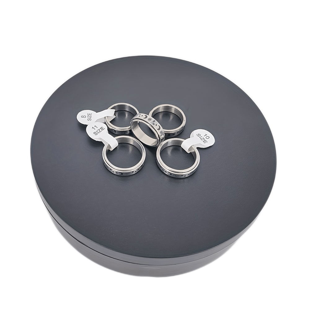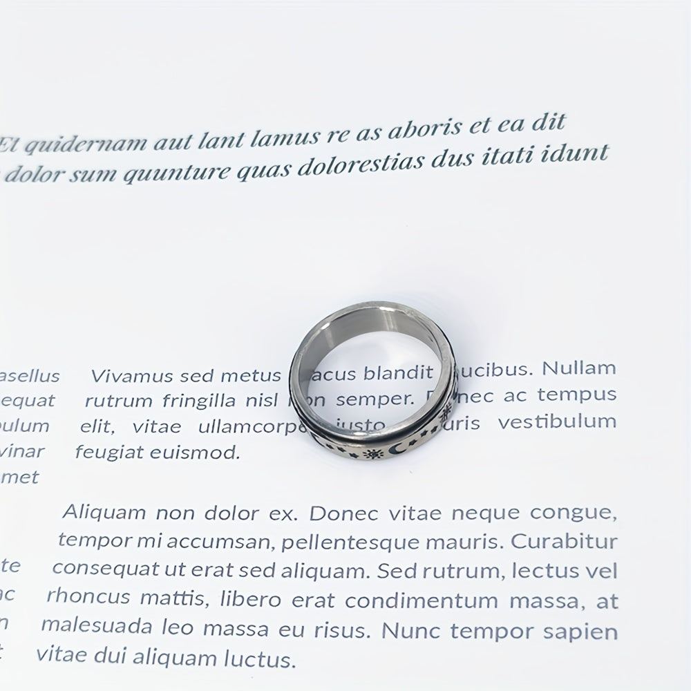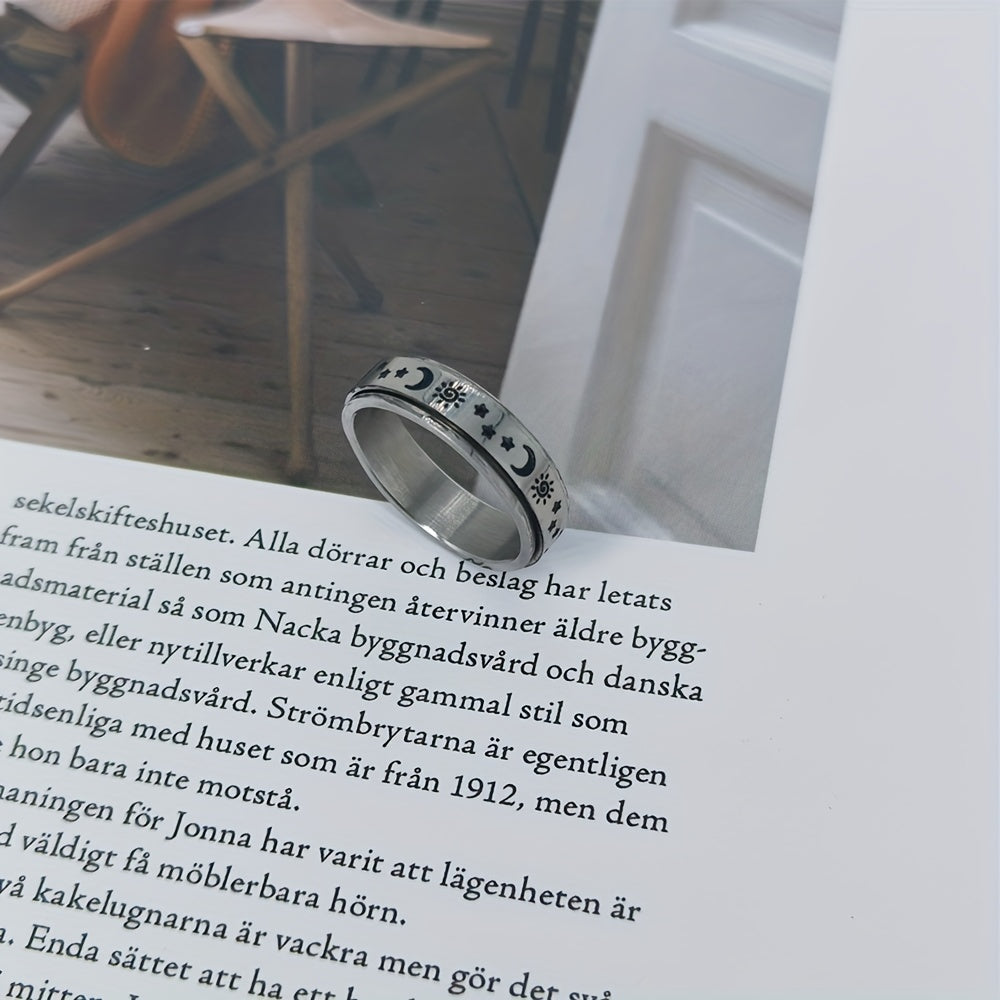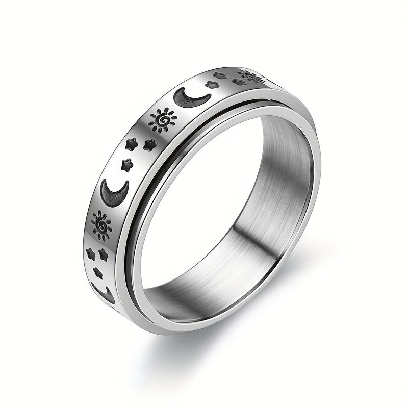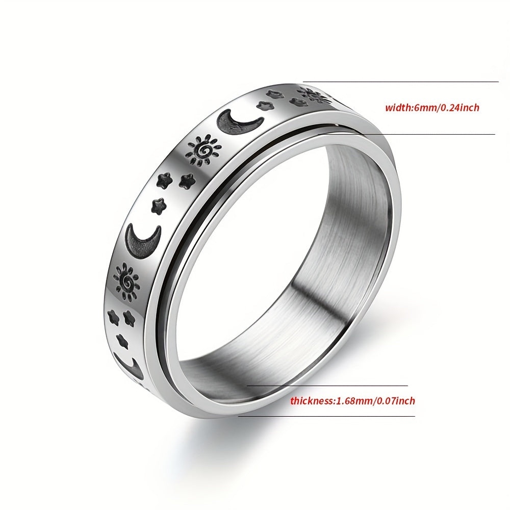 This stylish stainless steel ring features a unique design with a sun, moon, and star motif. The outer ring is rotatable for added interest. The ring is 6mm wide and made of durable stainless steel.