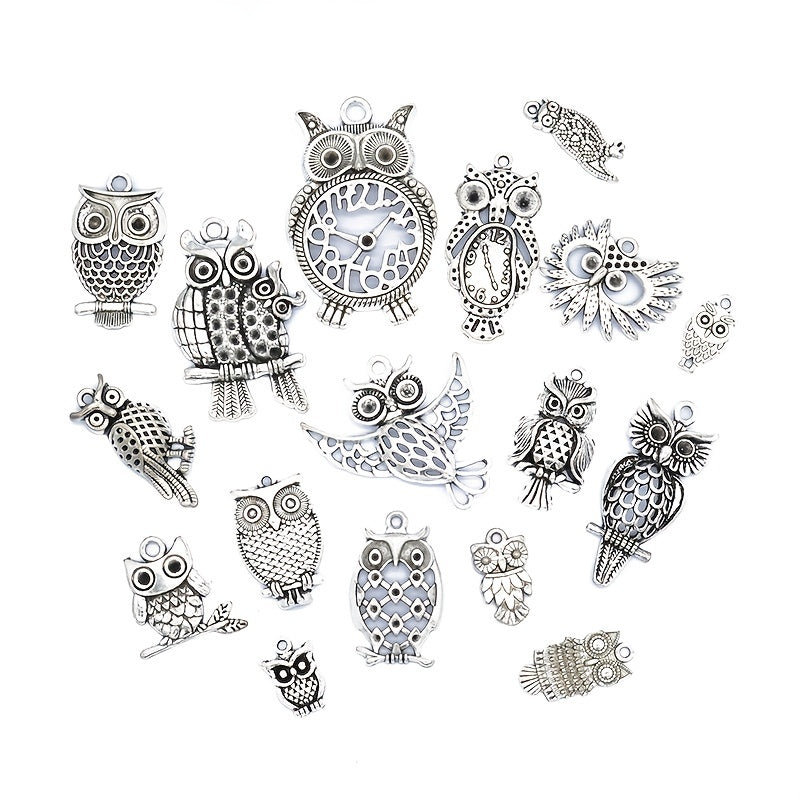 Create unique jewelry pieces with this set of mixed Tibetan silver owl and elephant charms. Perfect for crafting your own necklaces, bracelets, and earrings.