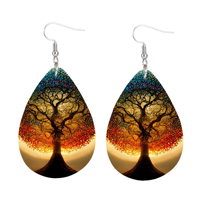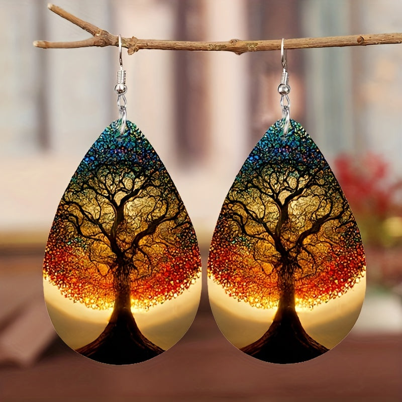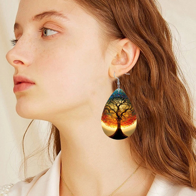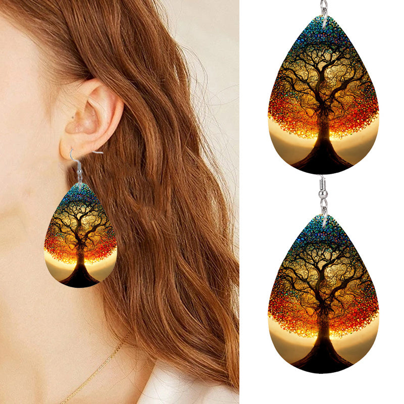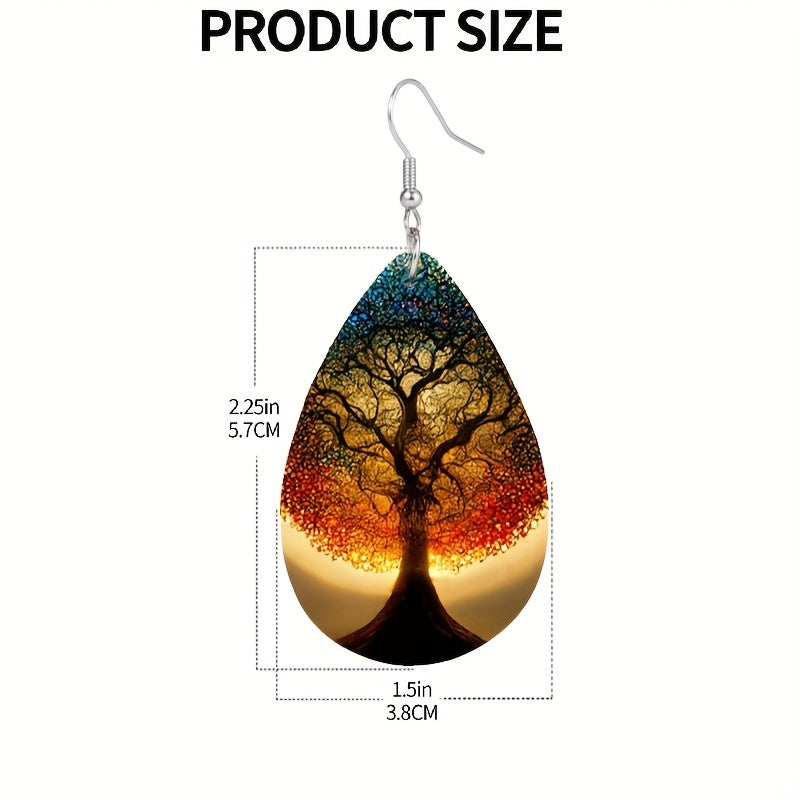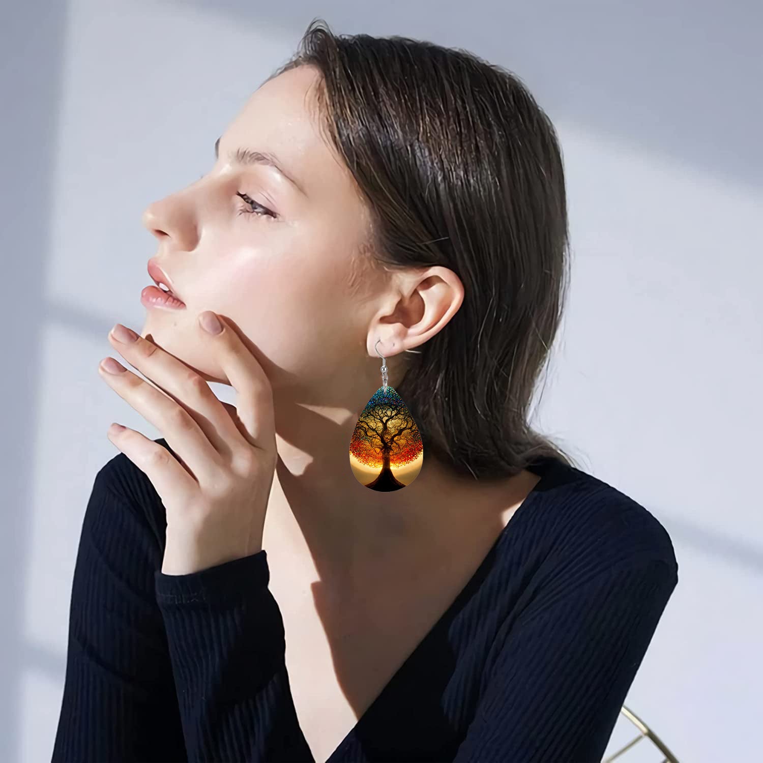 Retro-inspired dangle earrings featuring a tree of life print. Made of high-quality PU leather, perfect for daily casual wear. An ideal gift for women and girls.