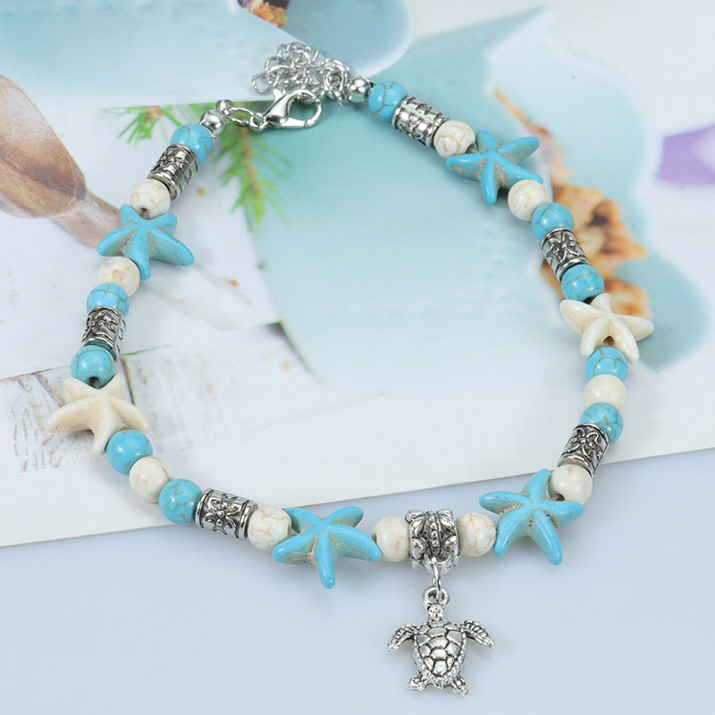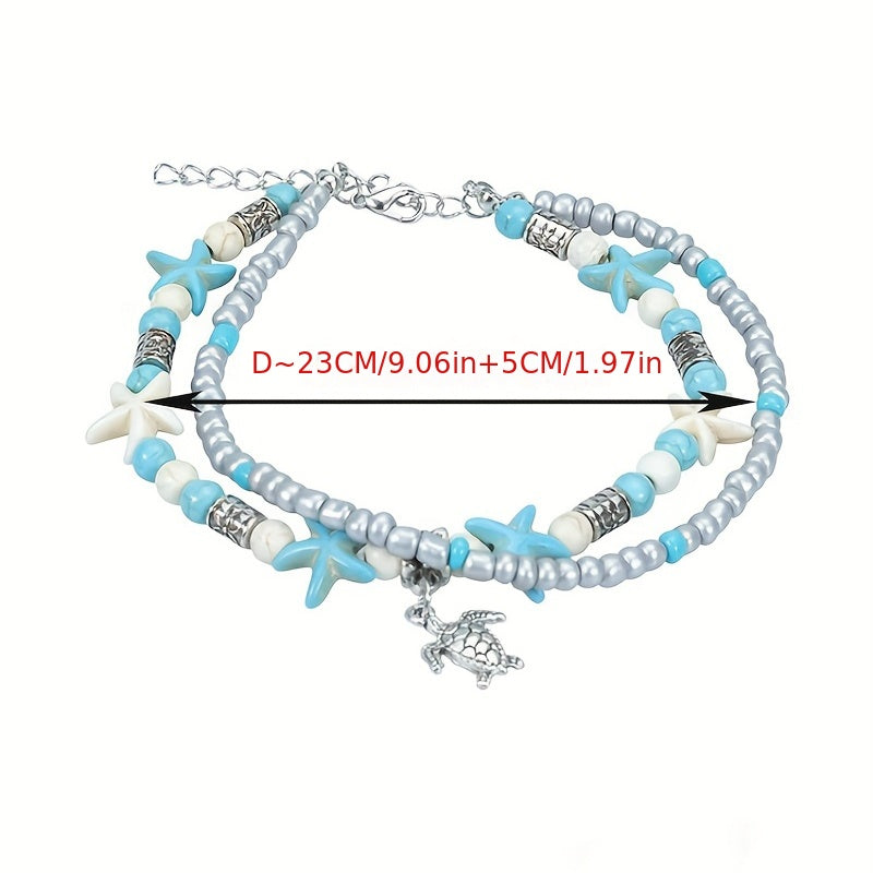 This anklet set features a turtle, shell, and starfish design with braided beads. Perfect for couples who love the beach and surfing.
