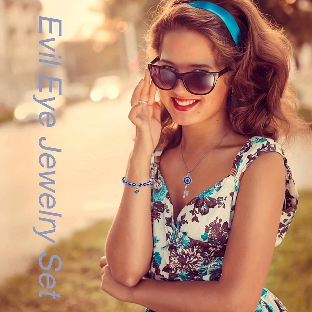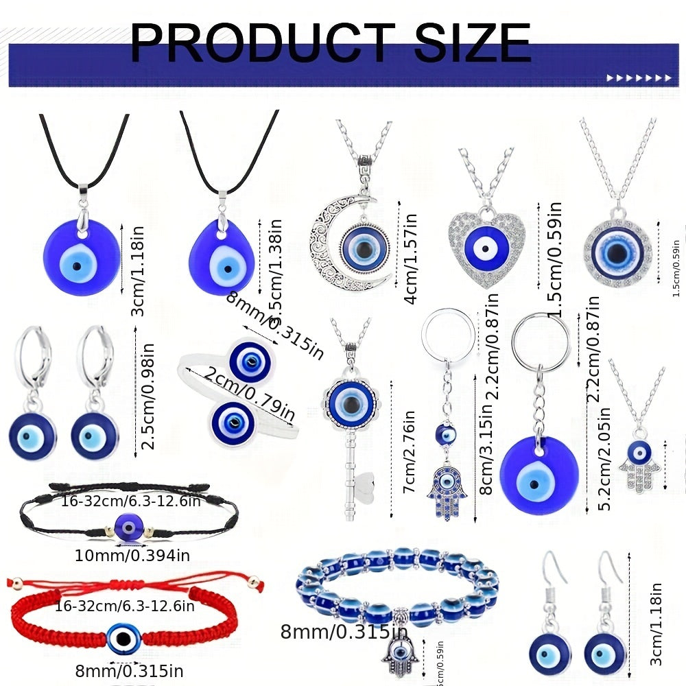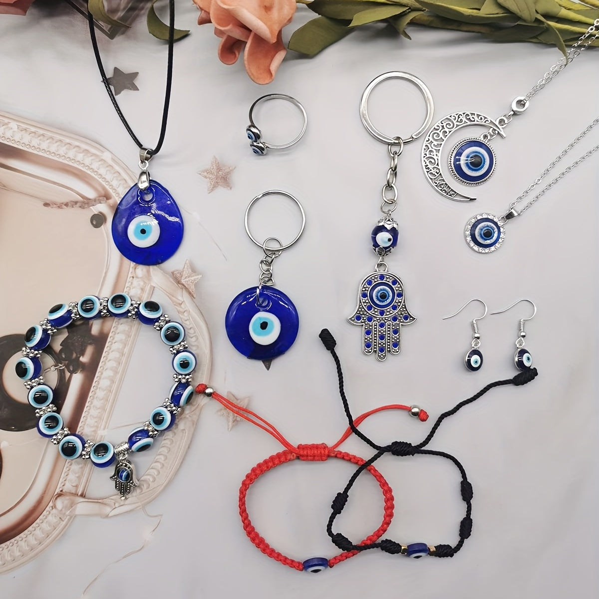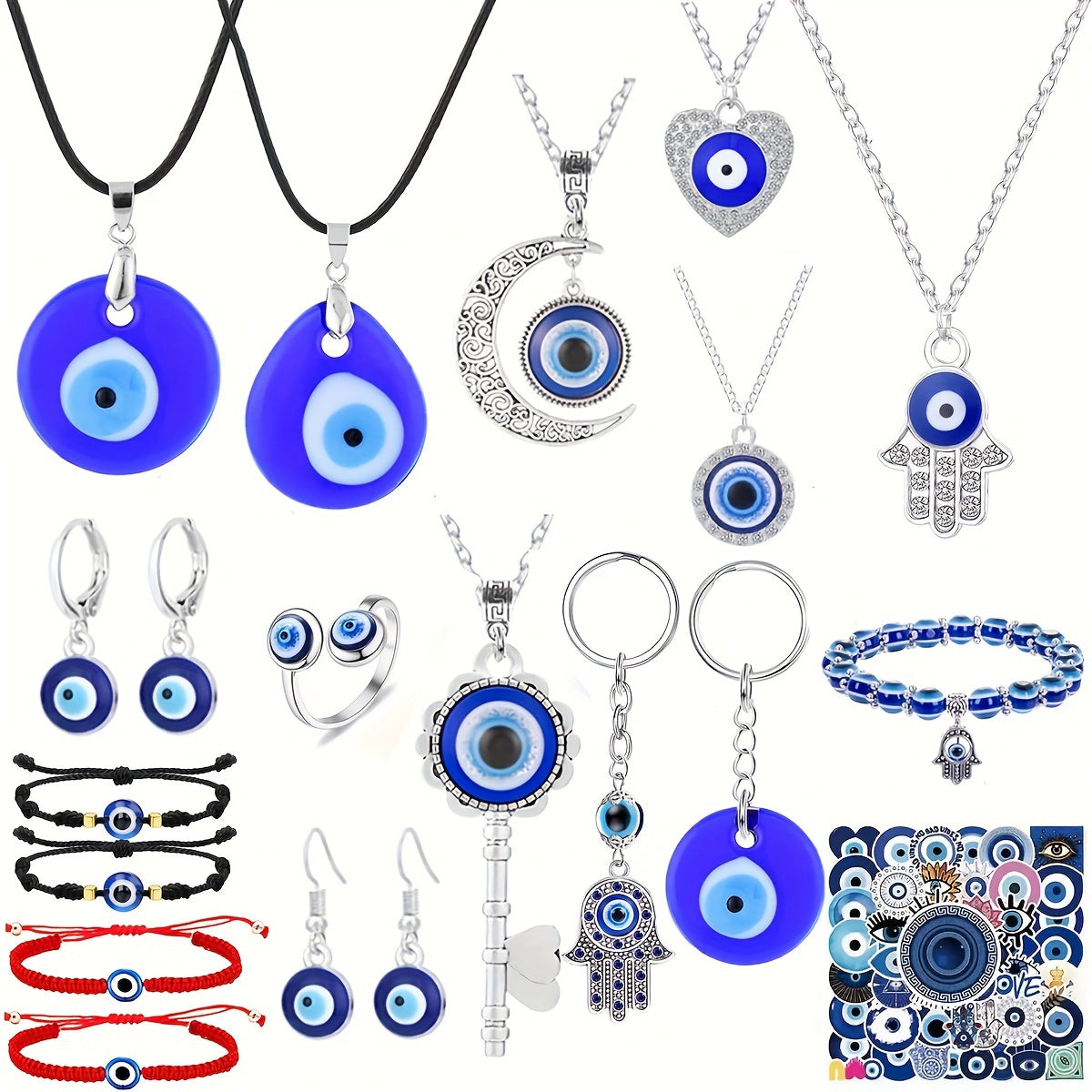 This 18-piece jewelry set includes a necklace, bracelet, earrings, and keychain all featuring evil eye and hamsa hand designs. The set also comes with 52 evil eye stick-on decorations for extra protection.