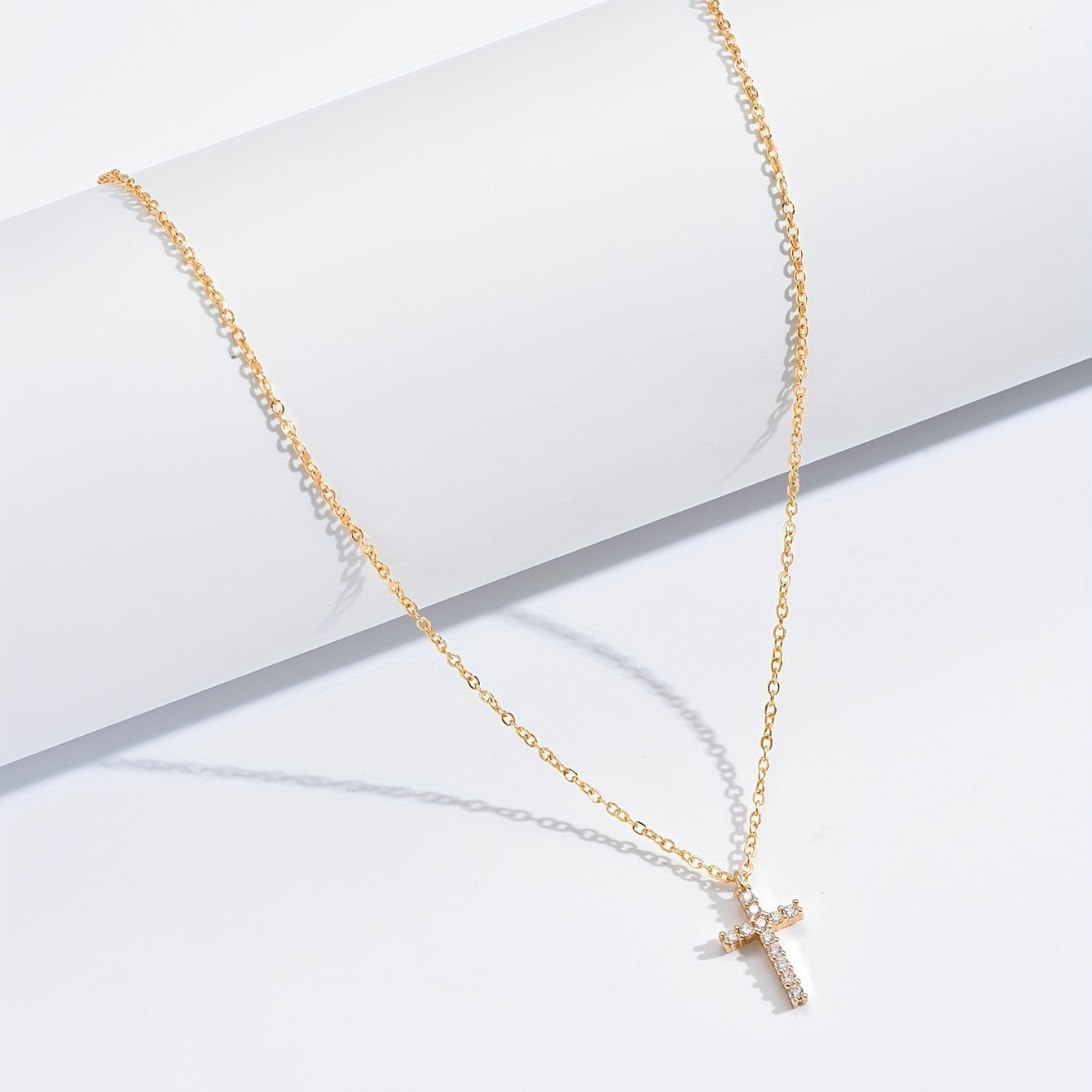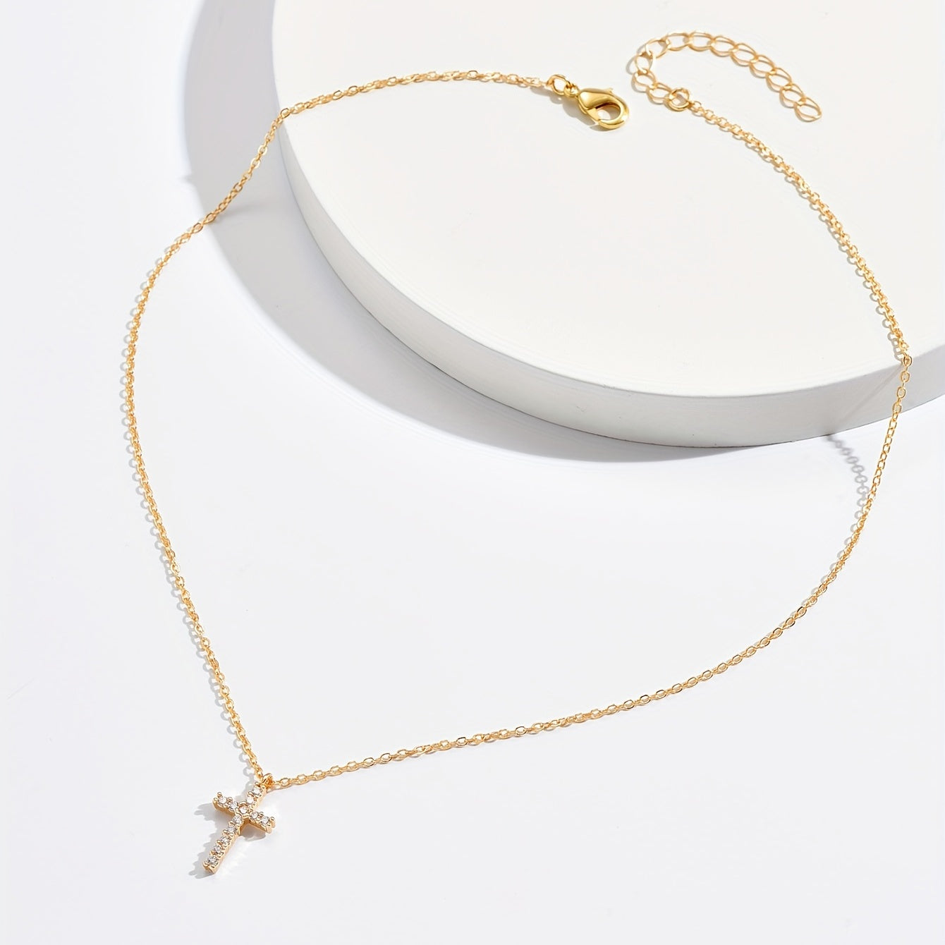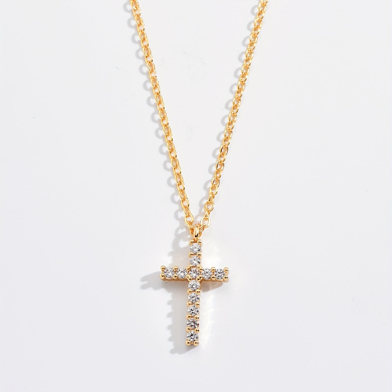 This elegant pendant necklace features a cross shape design with zircon stones, perfect for showcasing your faith. It is plated with 14K gold for a luxurious finish.