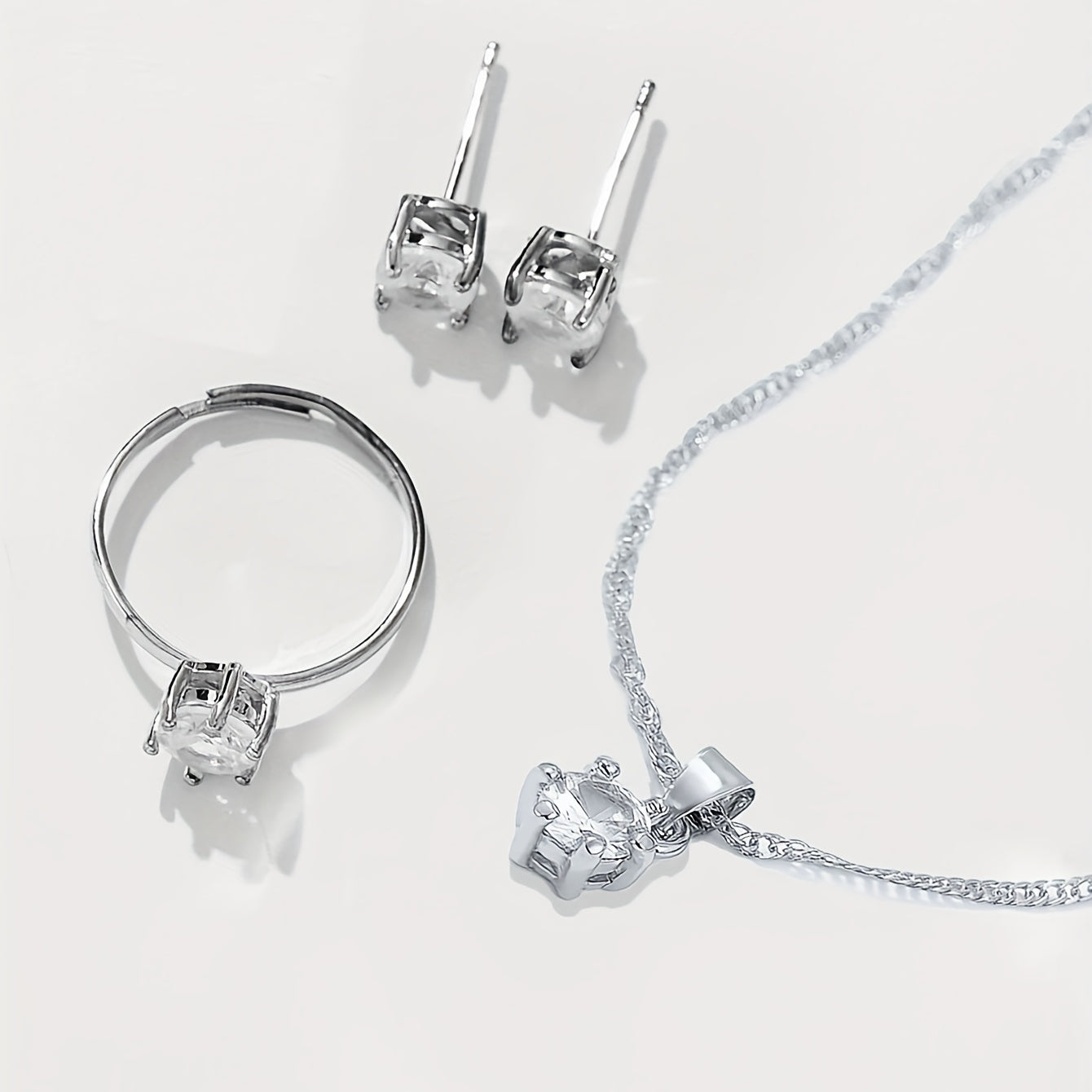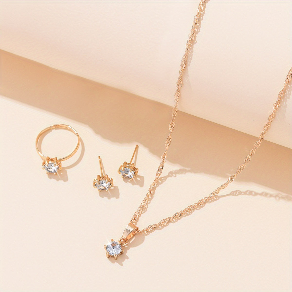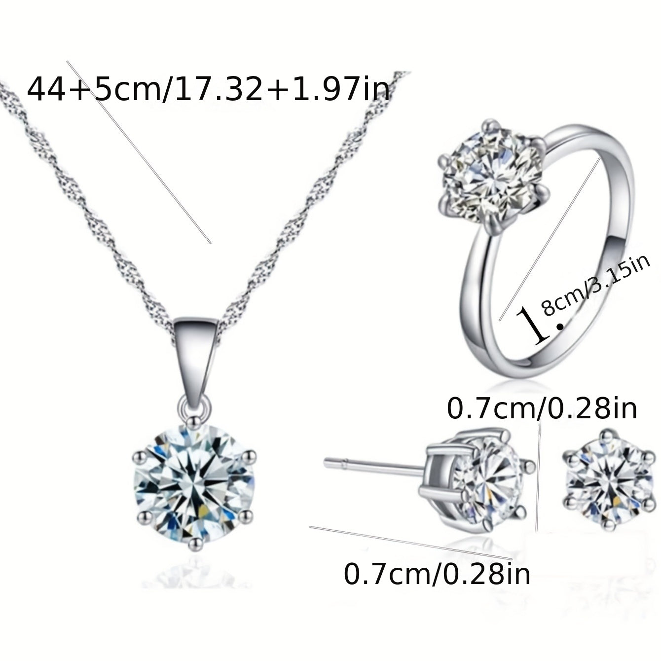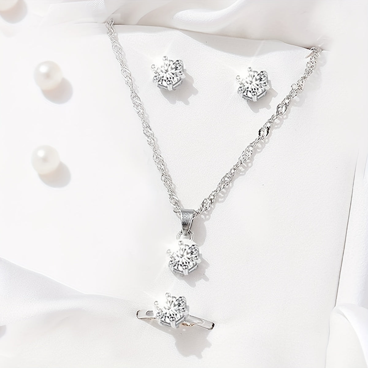 This charming jewelry set features 4 pieces: earrings, necklace, and ring, all inlaid with large zircon. Dainty and elegant, perfect for evening and cocktail parties. Ideal Christmas gift for your loved one.