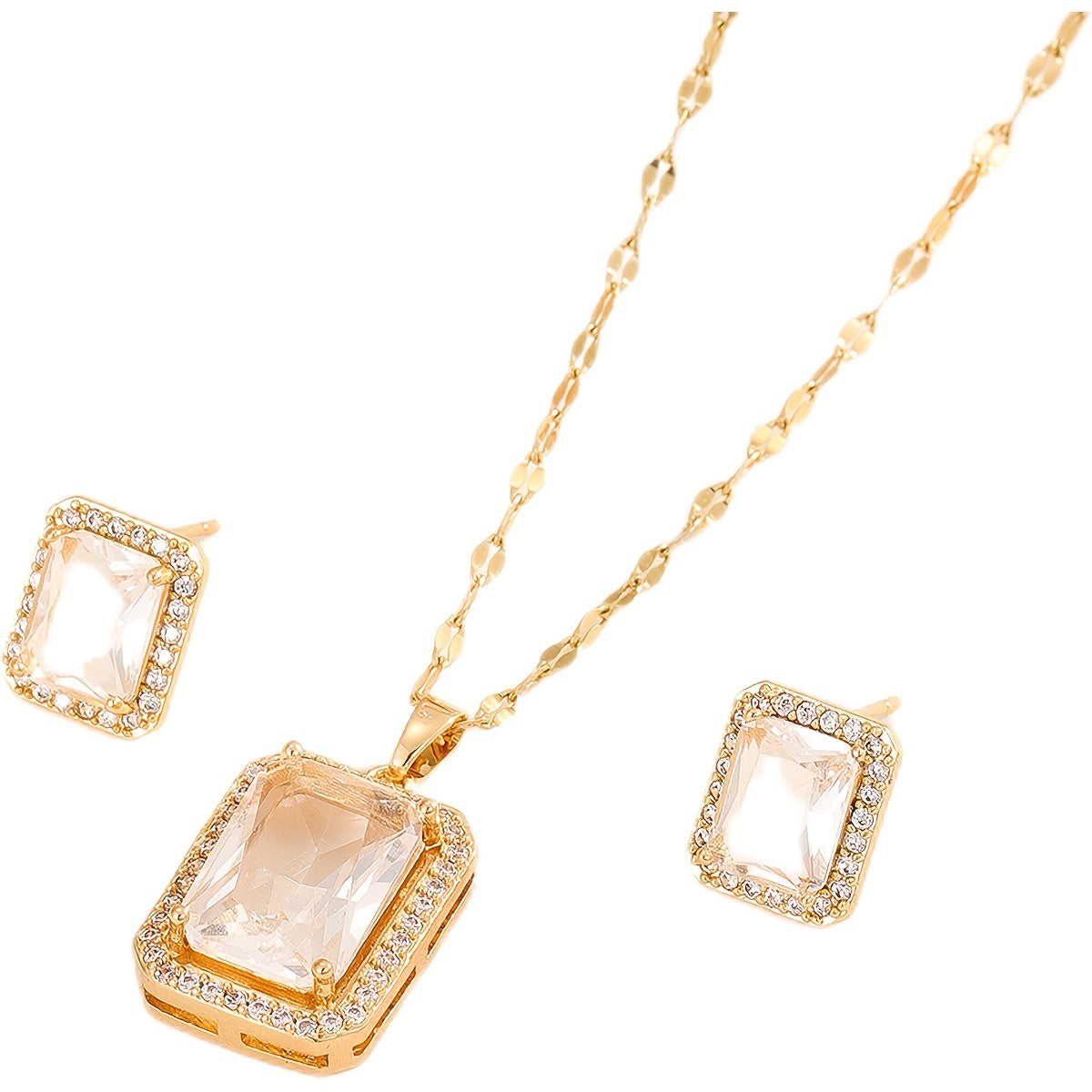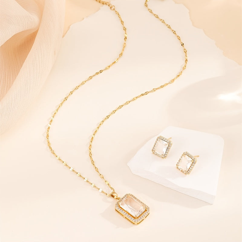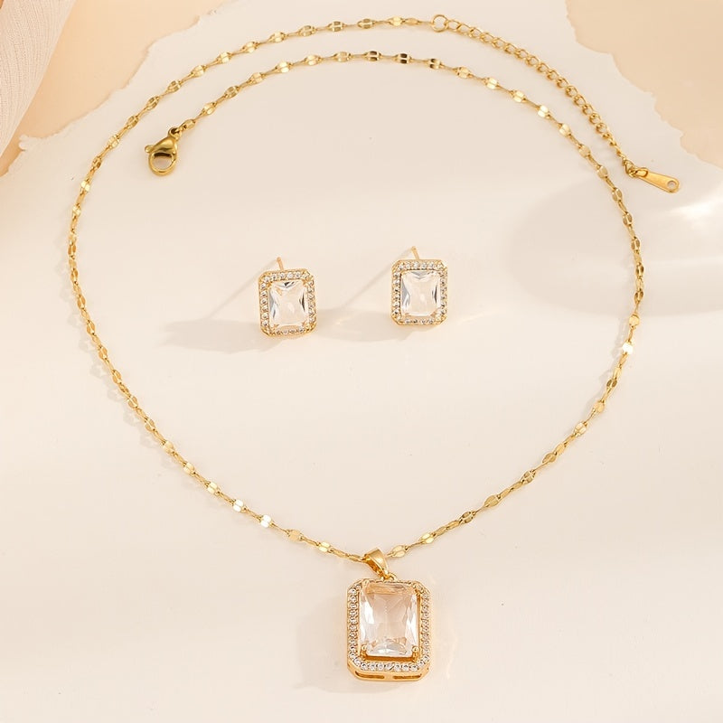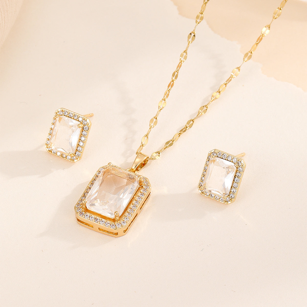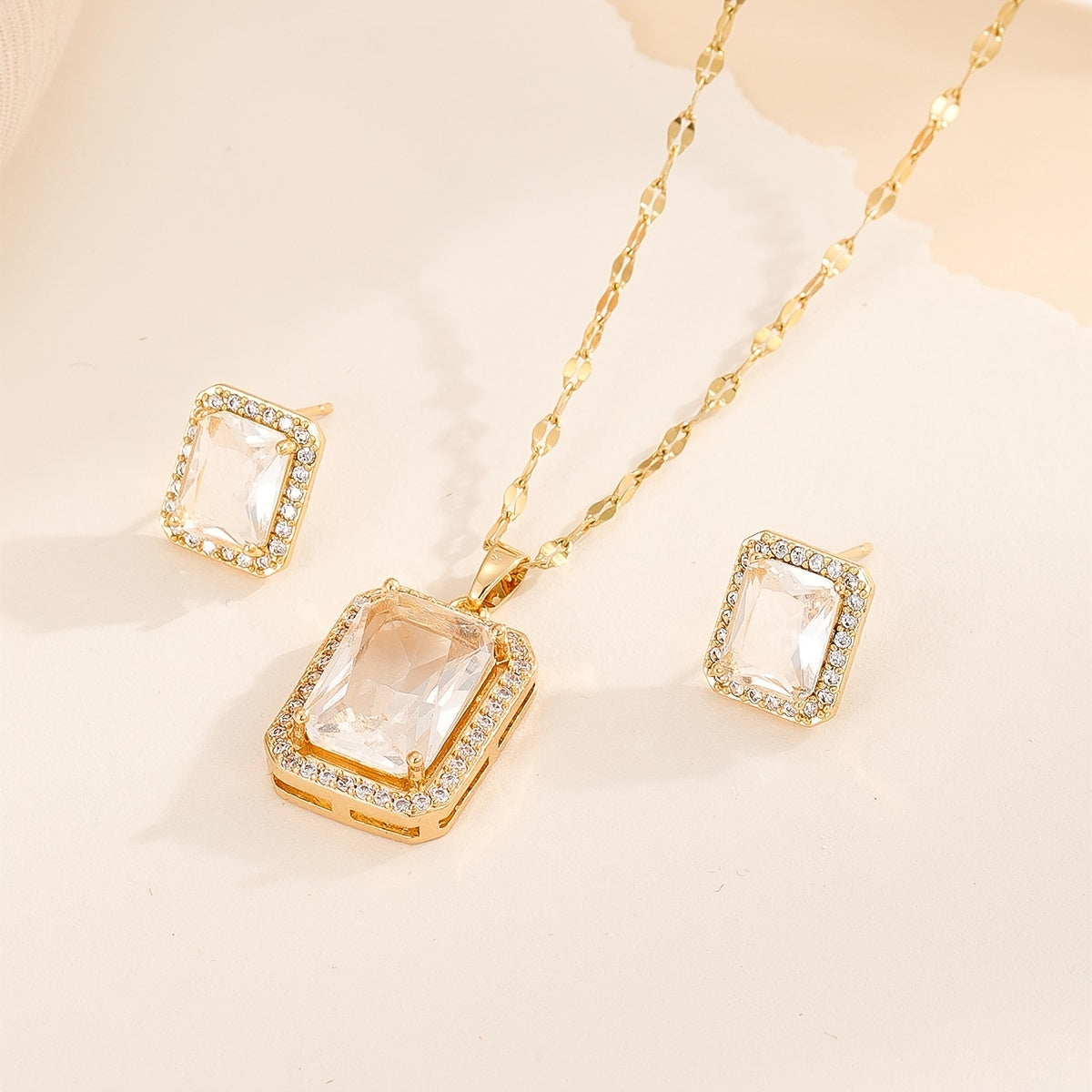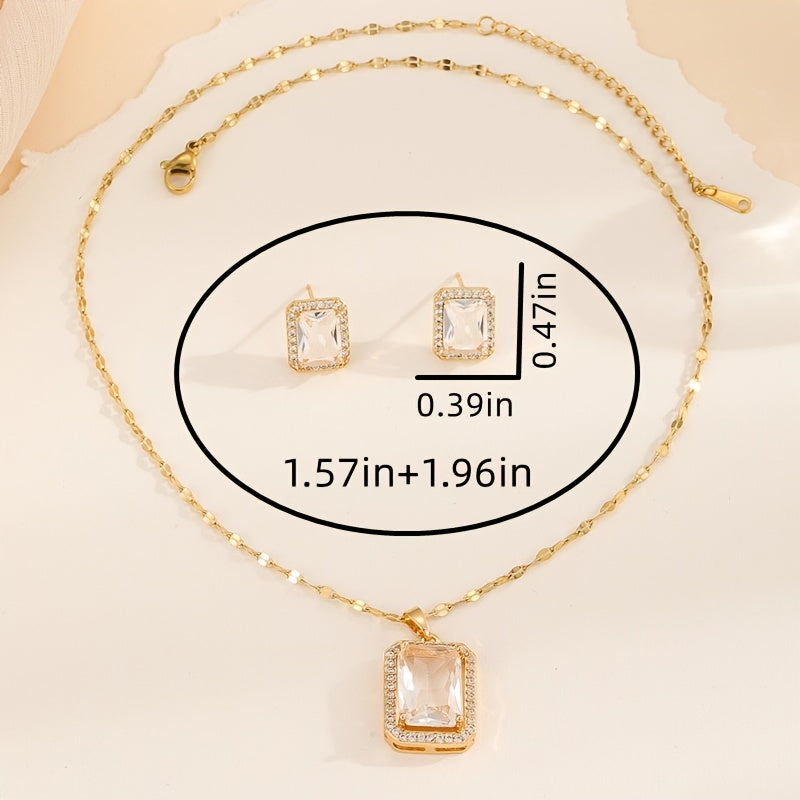 Upgrade your jewelry collection with this stunning square shape zircon pendant necklace and stud earrings set. Made with 18K plated copper, this set is perfect for women and girls.