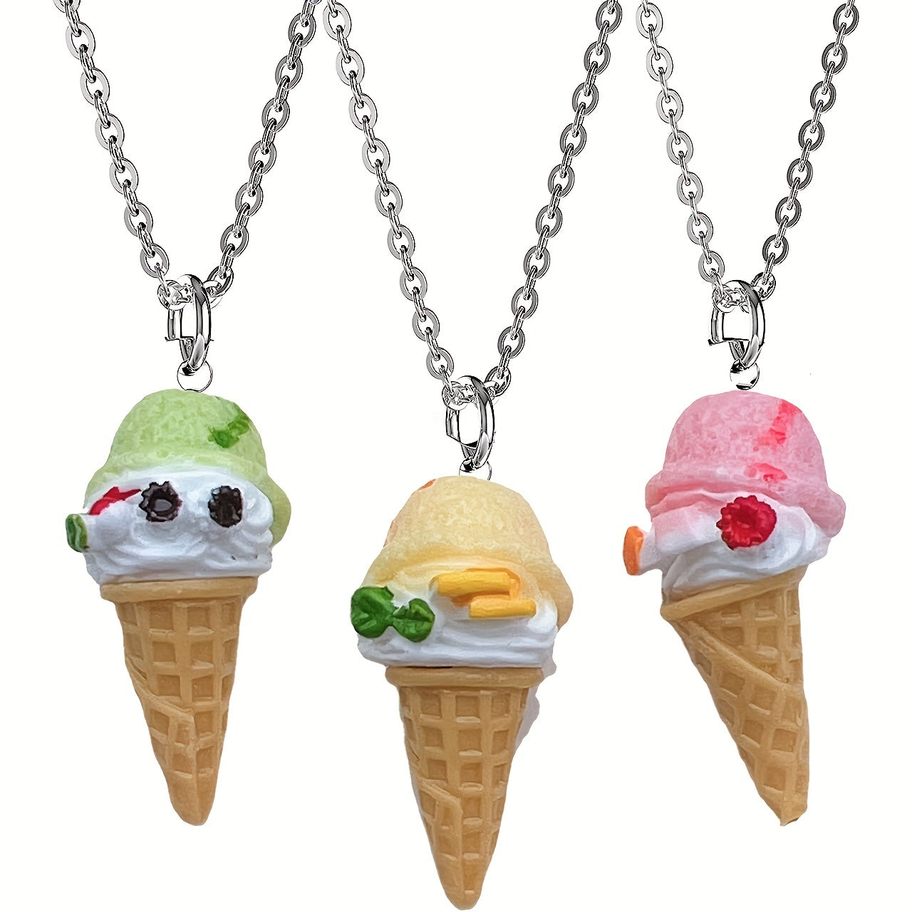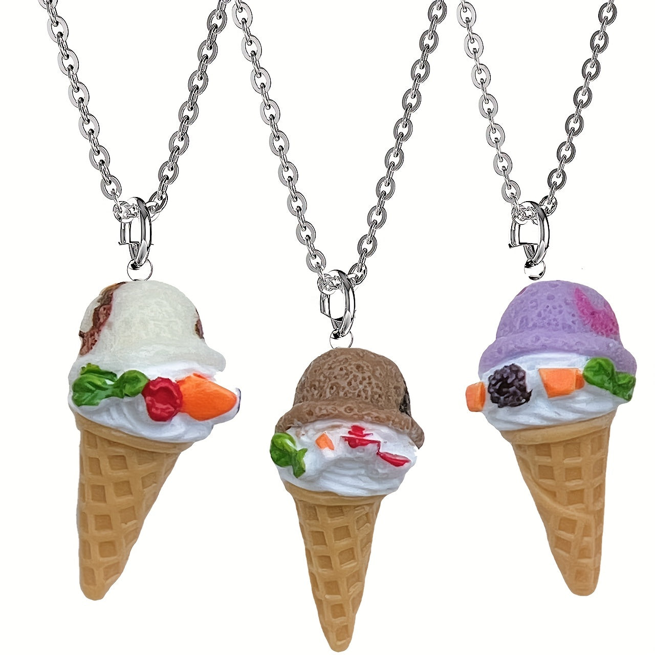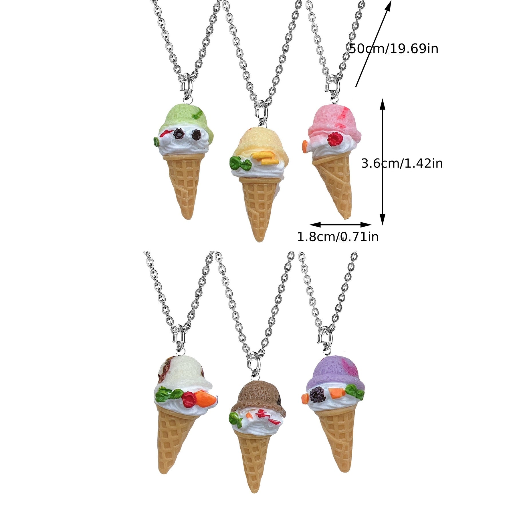 Add a touch of fun to your outfit with this set of 3 dessert pendant necklaces featuring ice cream cone designs. Perfect for adding a dash of personality to any look.