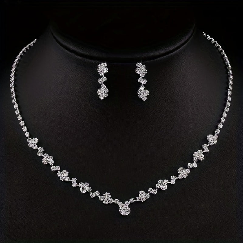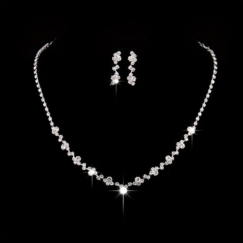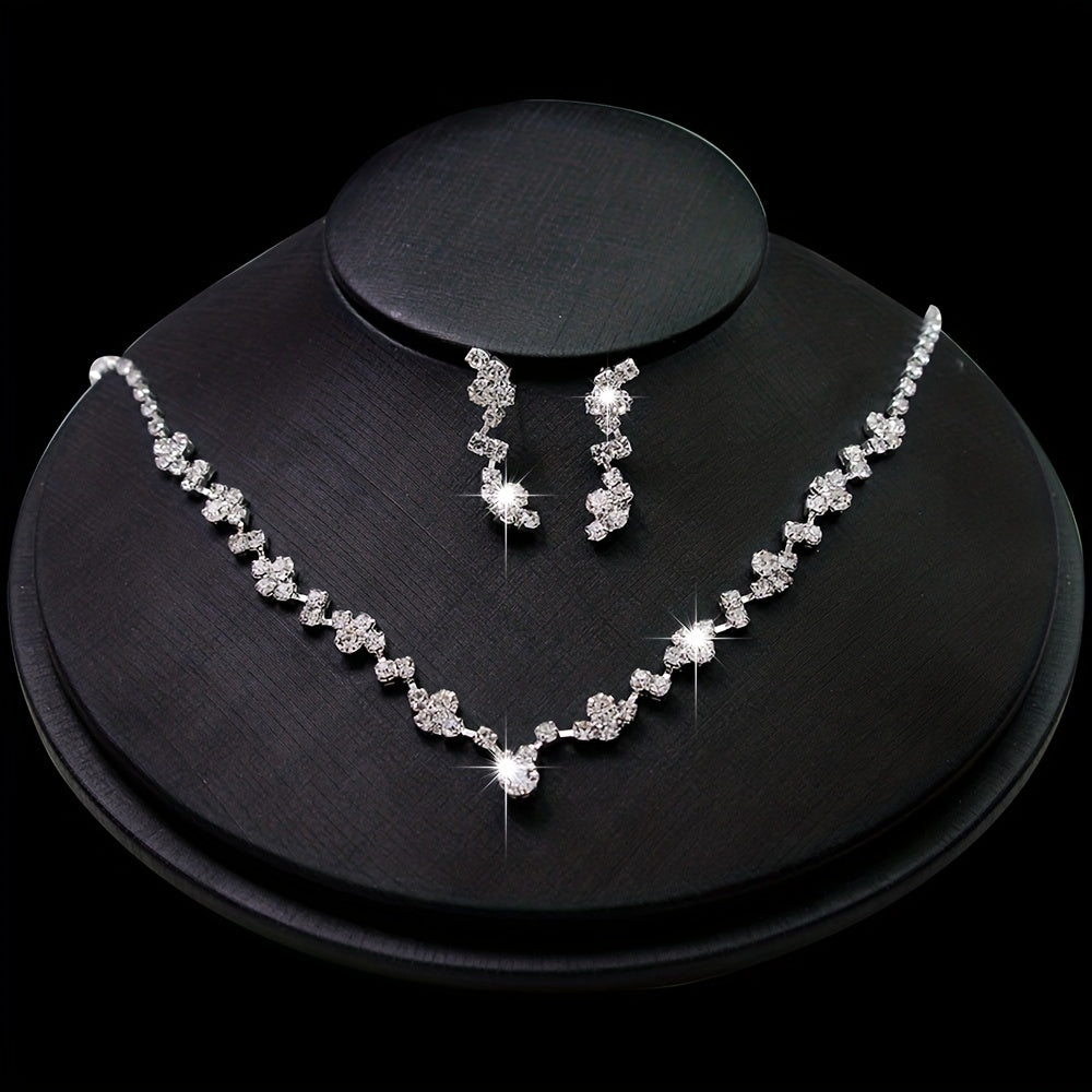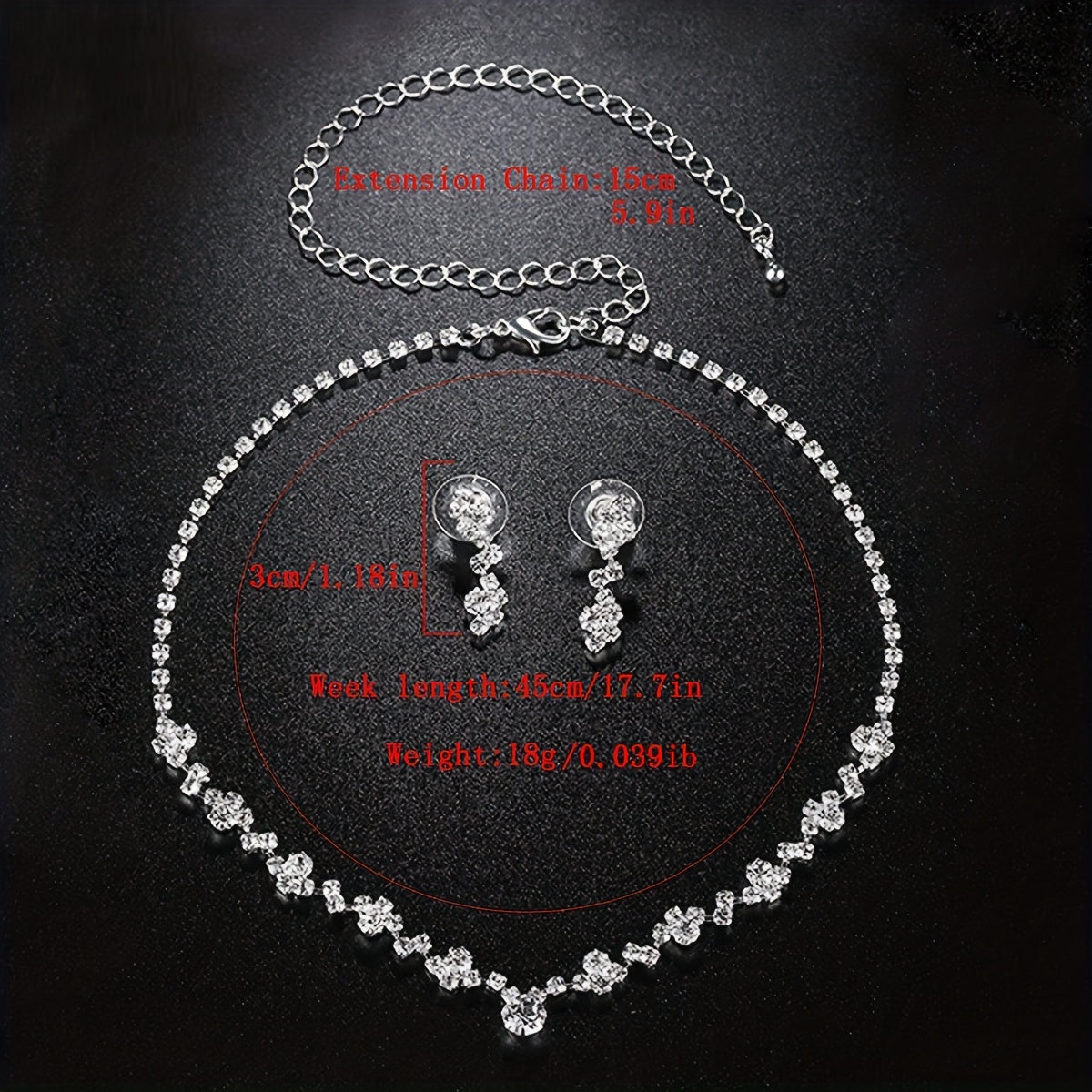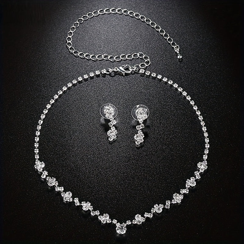 This elegant jewelry set includes 3 pieces of earrings and a necklace. Made of silver-plated material and inlaid with rhinestones, this set is perfect for evening parties and cocktail events. It also makes a great birthday gift.