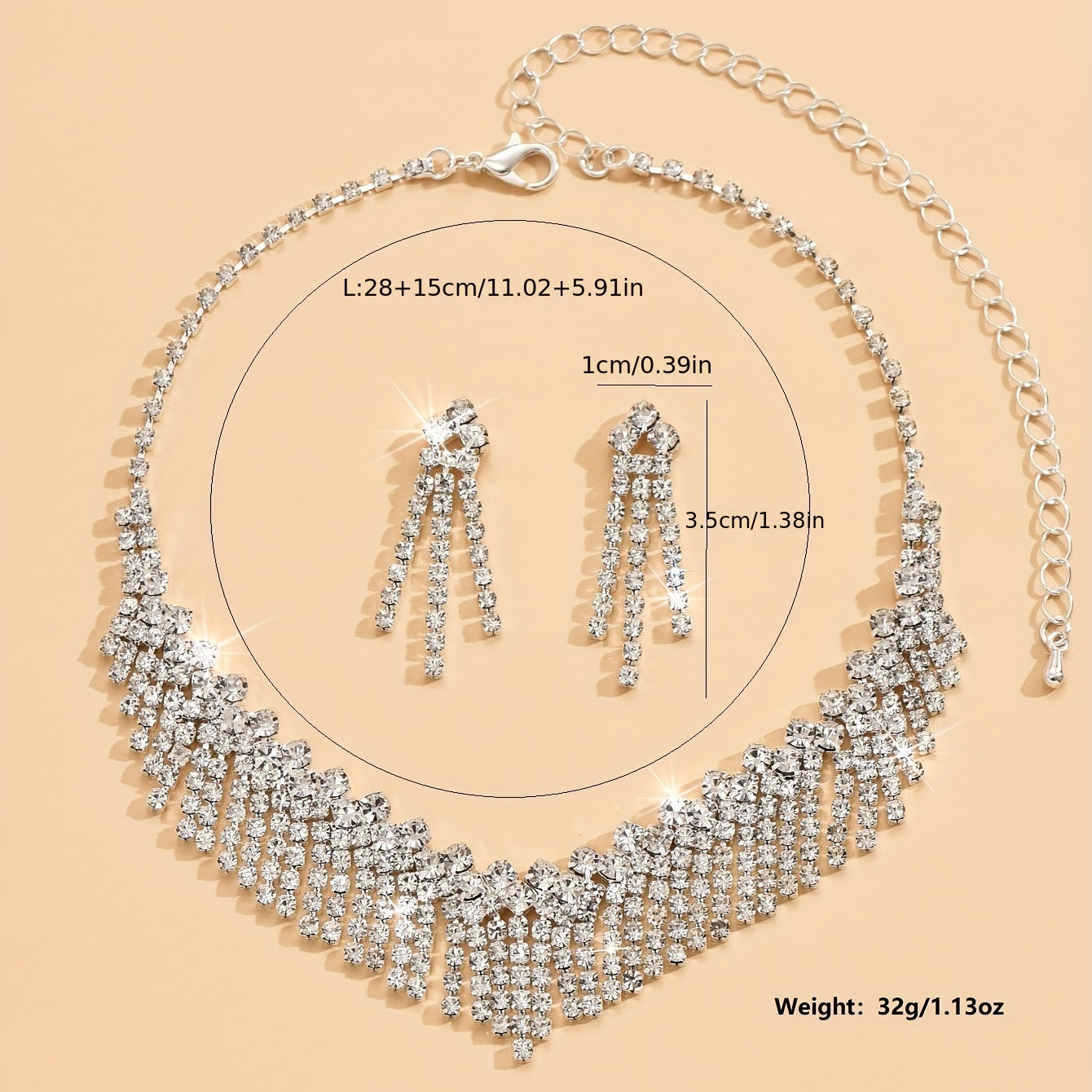 Complete your cocktail party look with this elegant 3-piece jewelry set. Includes silver plated earrings and necklace with inlaid rhinestones, perfect for Christmas or special occasions.