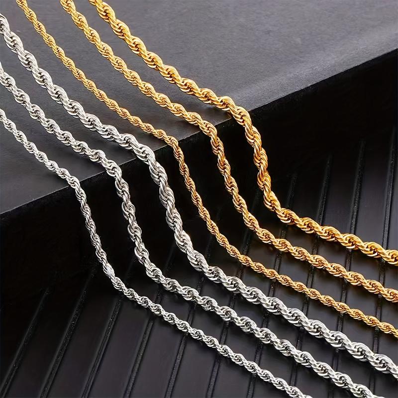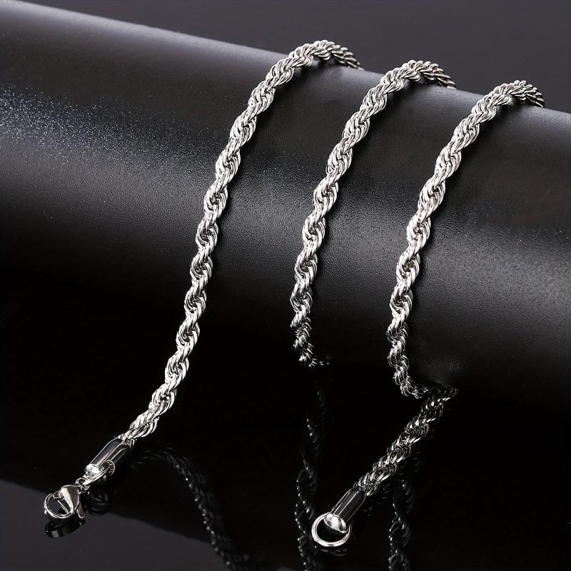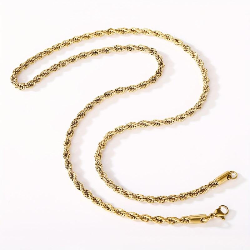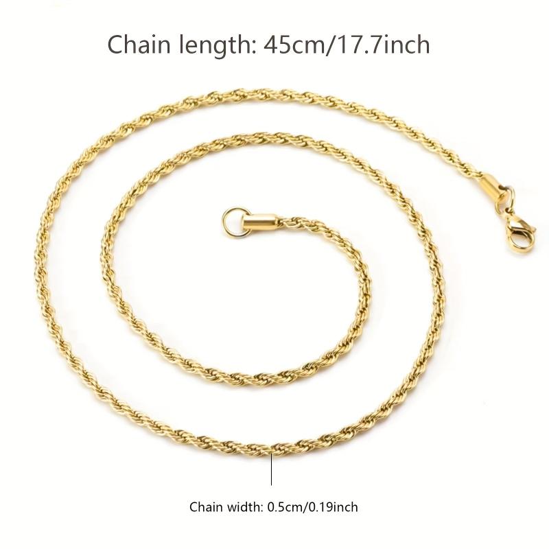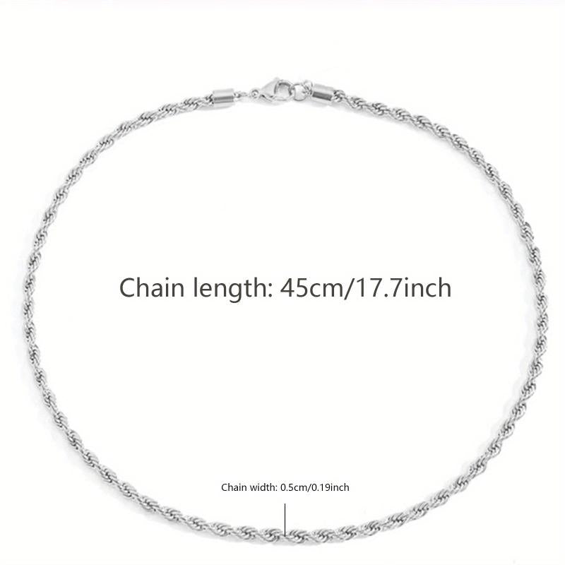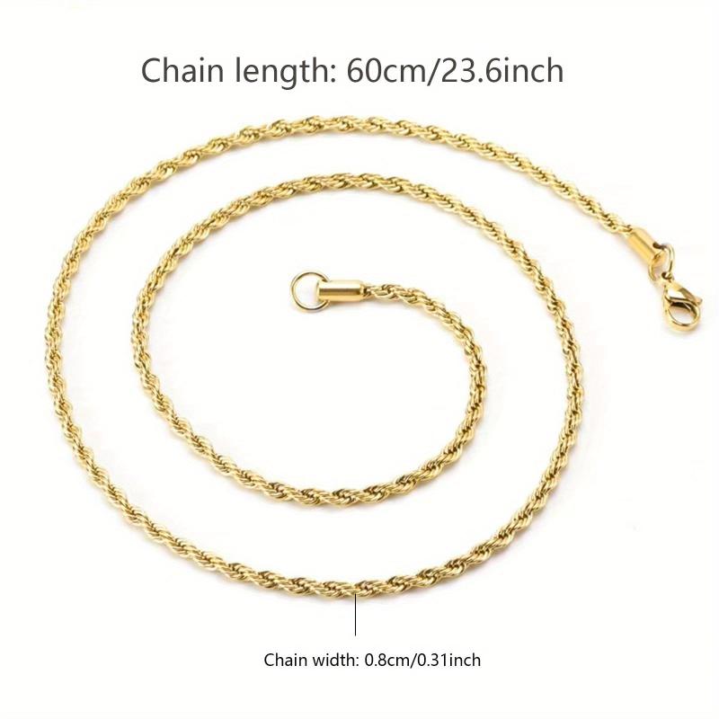 This stainless steel twist necklace is a durable and stylish accessory suitable for both men and women. It features a twisted rope chain design that never fades, making it a timeless piece for everyday wear.