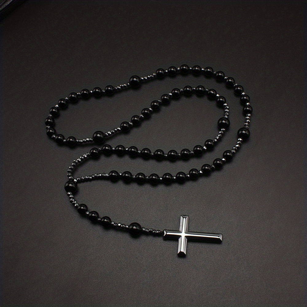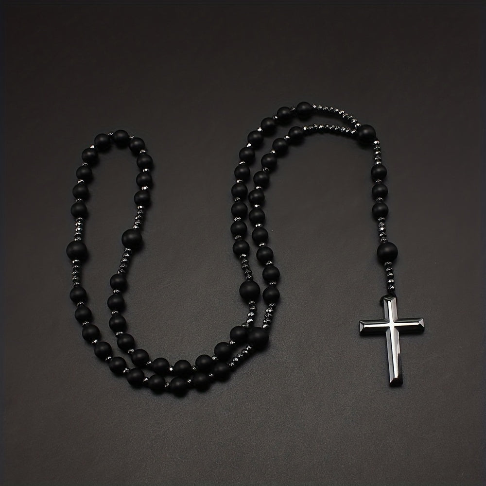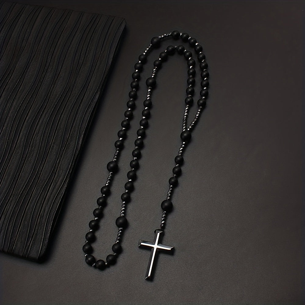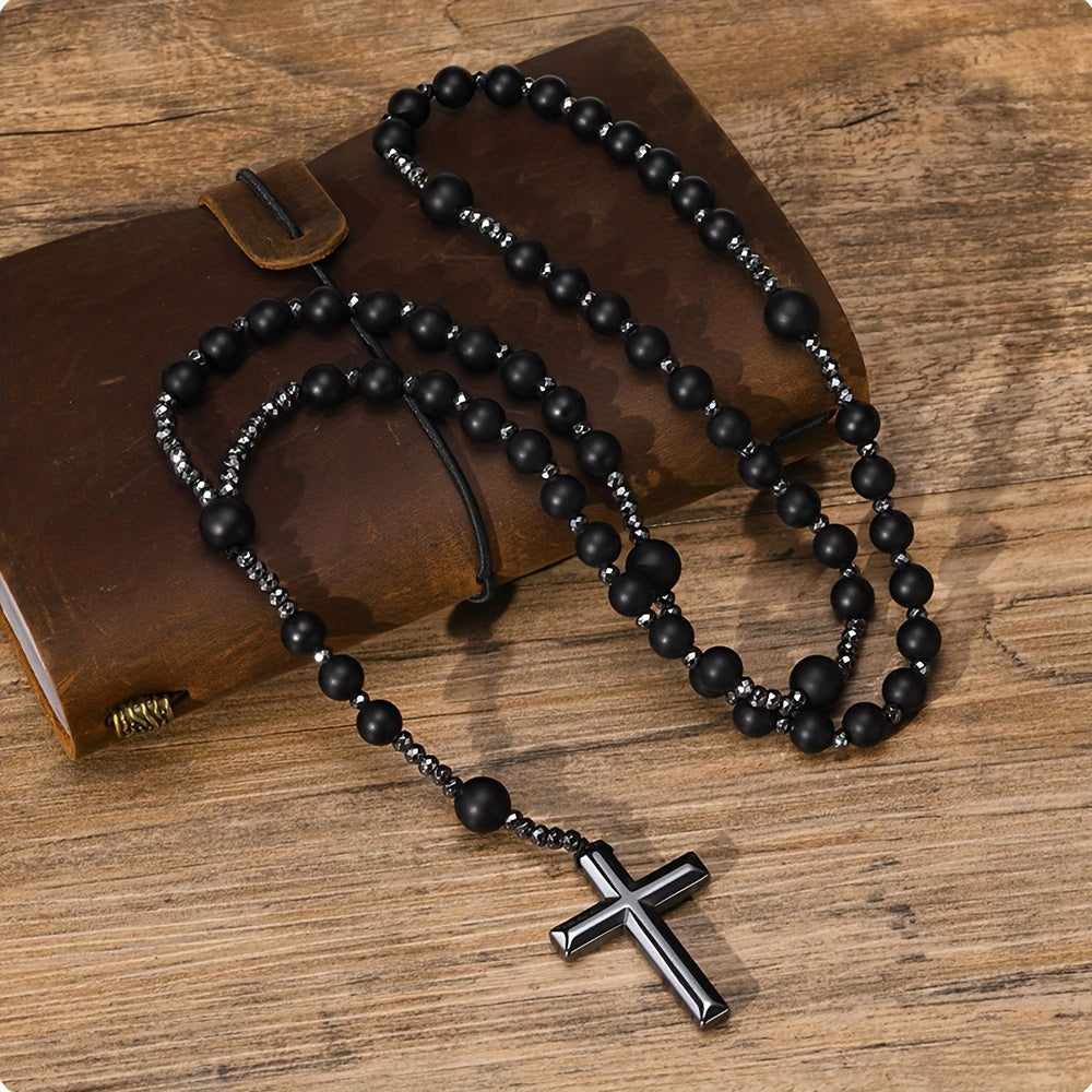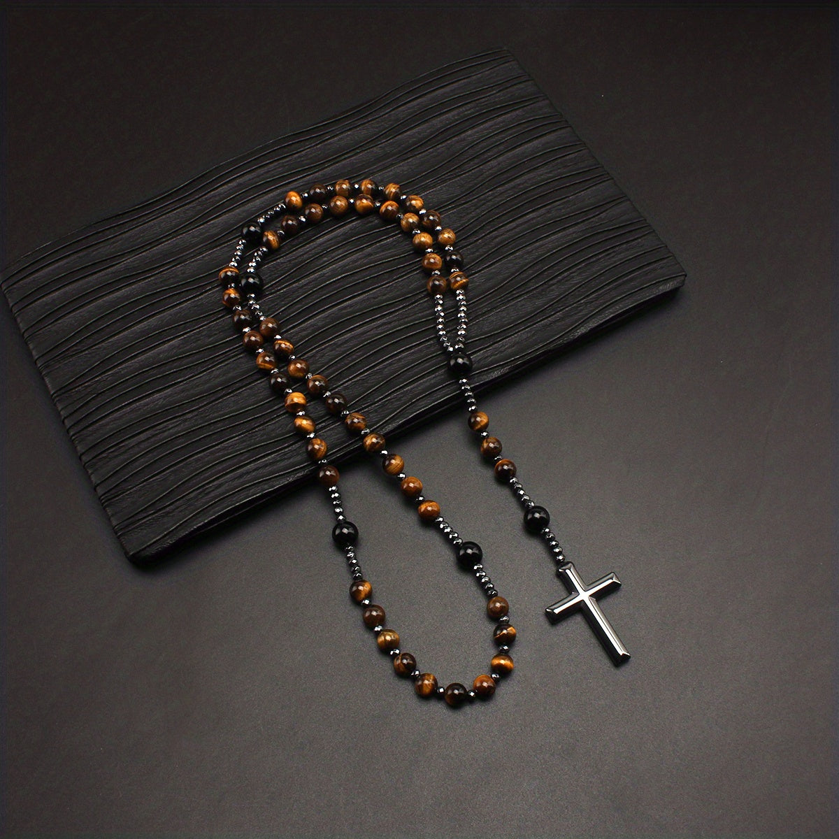 This unique men's necklace features natural 8mm Tiger Eye stones and a Cross pendant made of raw Gallstone. The perfect accessory for a stylish and spiritual look.