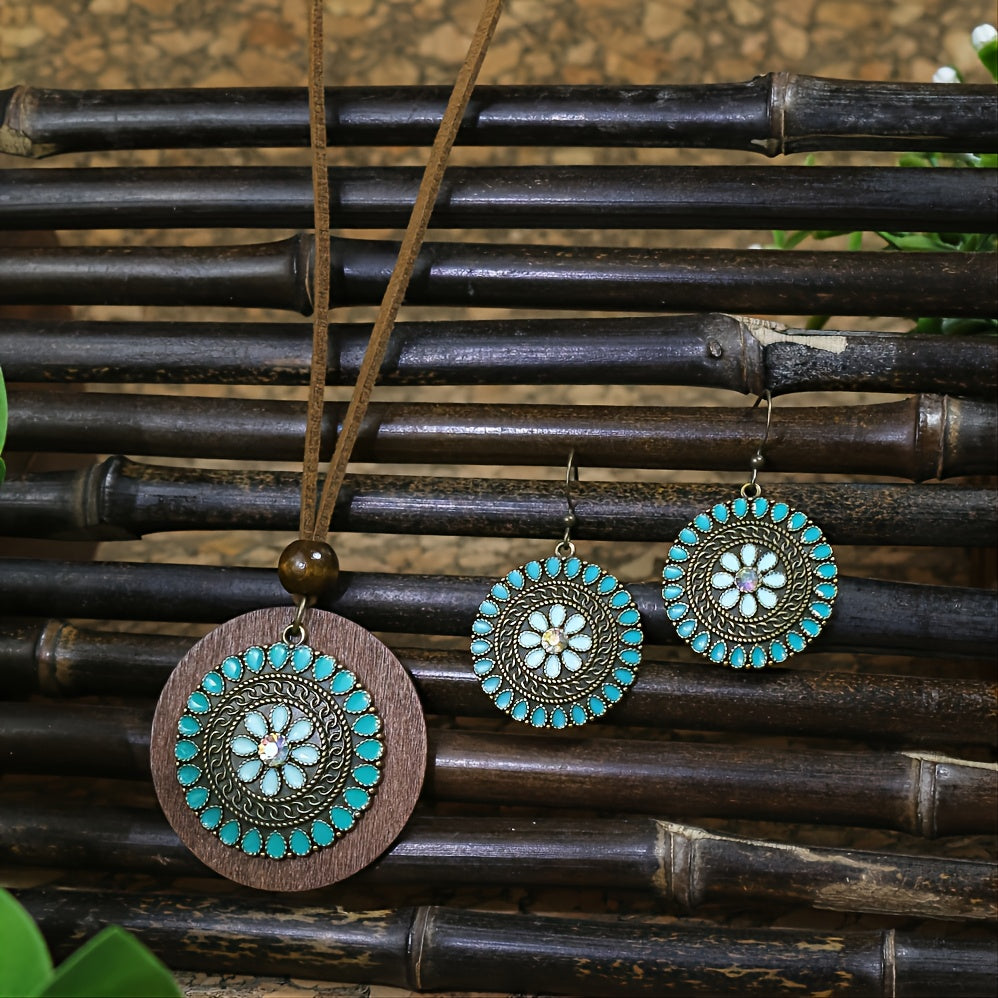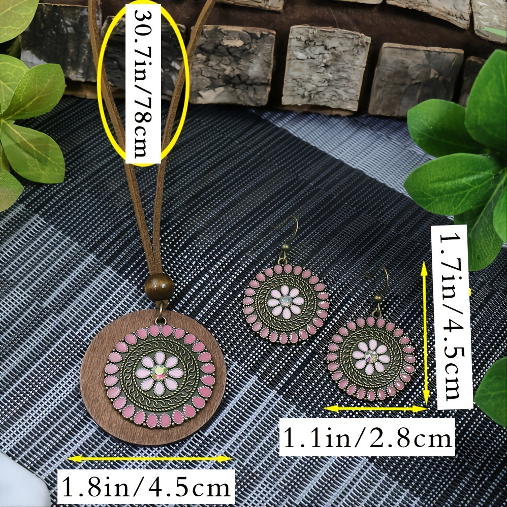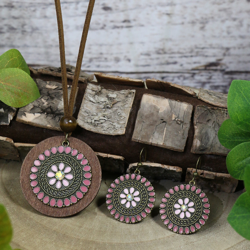 This set features a double layer round alloy flower pendant with an embossed zircon design. Choose from green, pink, or decorative leather chain options.