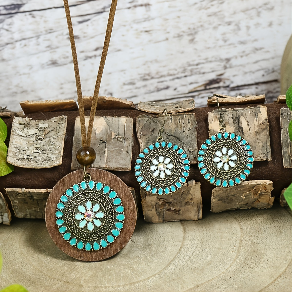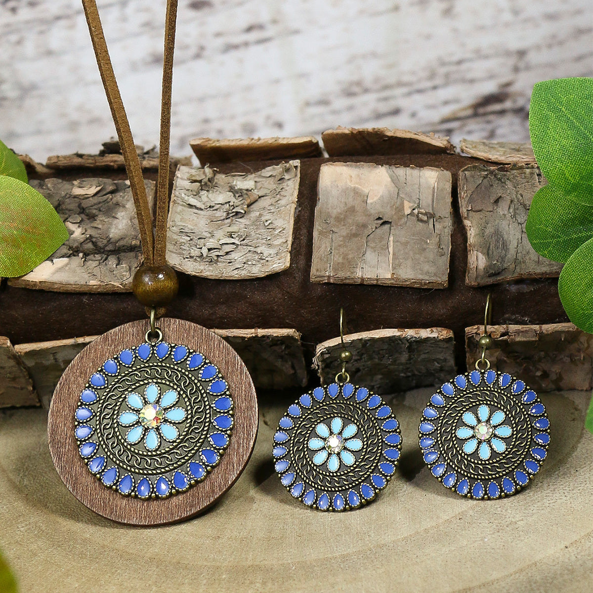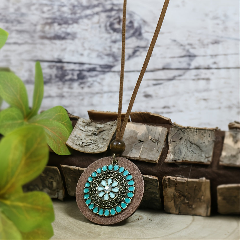 This set features a double layer round alloy flower pendant with an embossed zircon design. Choose from green, pink, or decorative leather chain options.