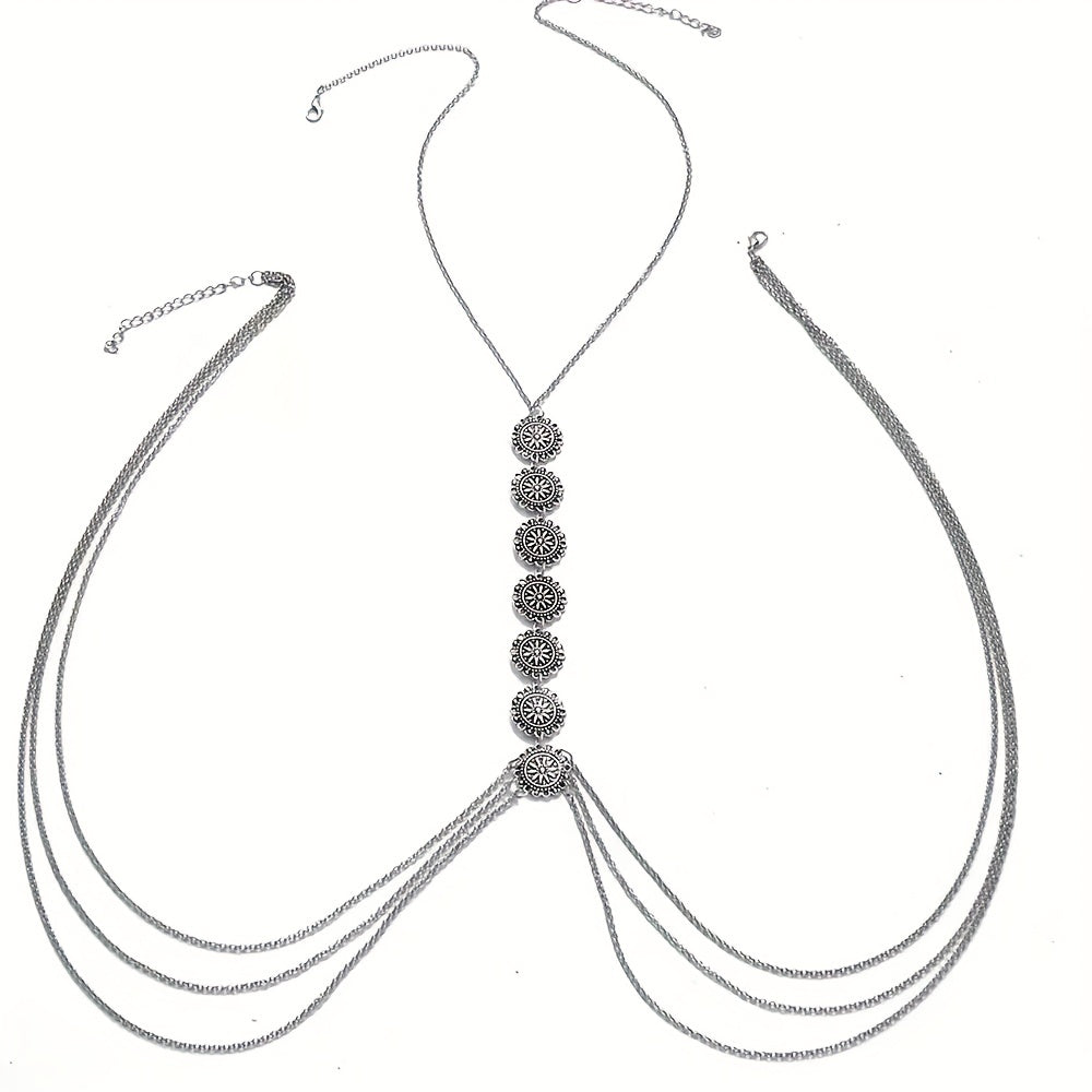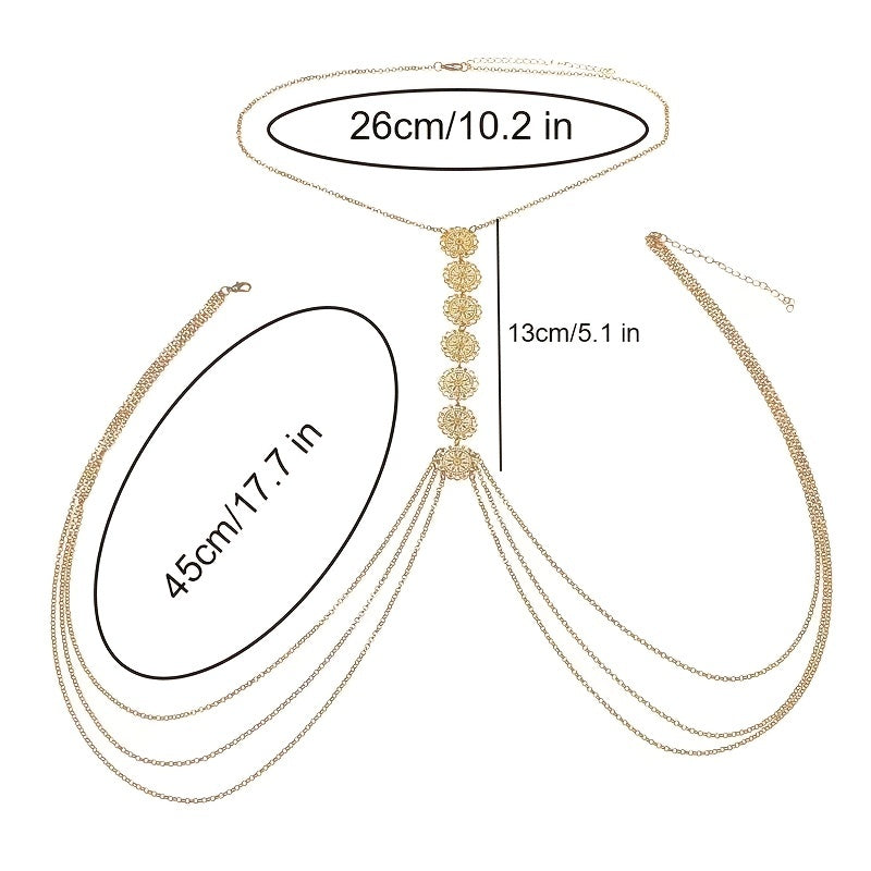Elevate your beach look with this stunning Bohemian Coin Body Chain that adds a touch of glamour and style. This body chain features delicate coins and intricate design to enhance your outfit.