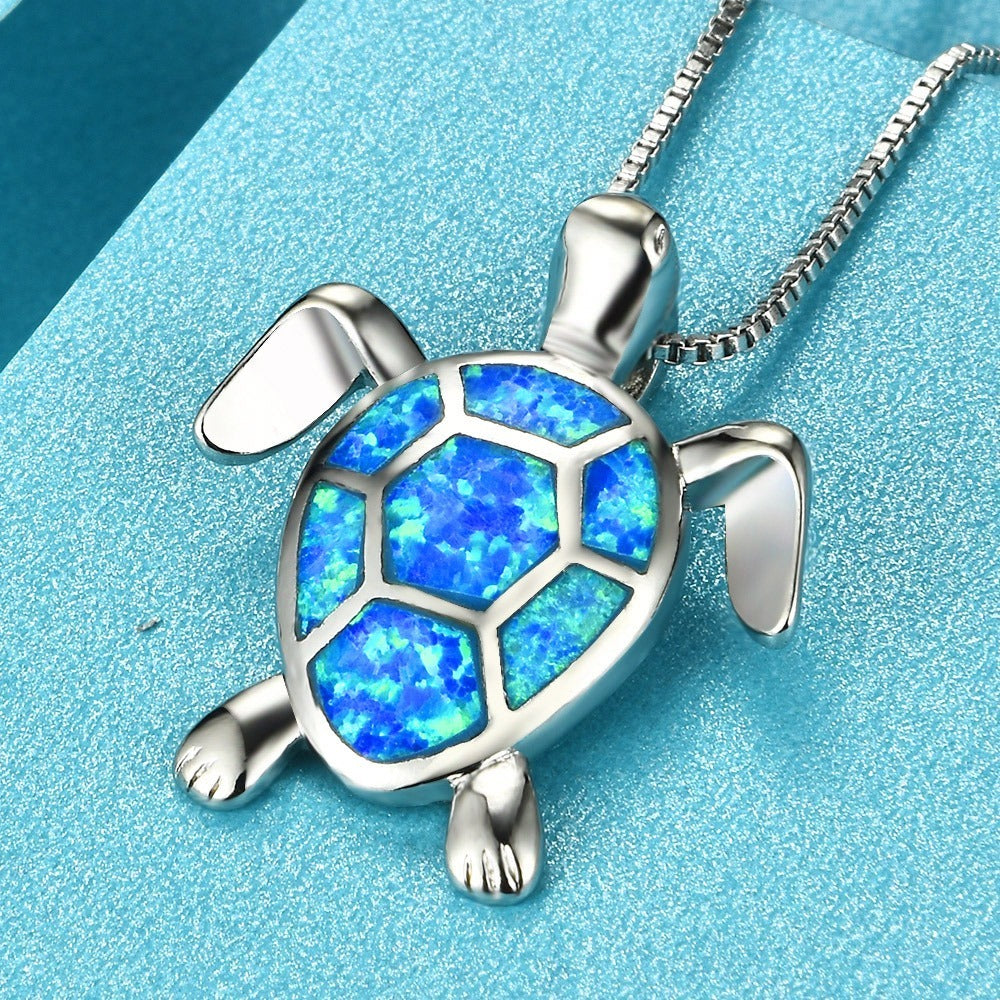 Enhance your style with this stunning Bohemian Fire Opal Necklace. The necklace features a silver chain with a green fire opal pendant and large tortoise pendants, perfect for adding a touch of elegance to any outfit.