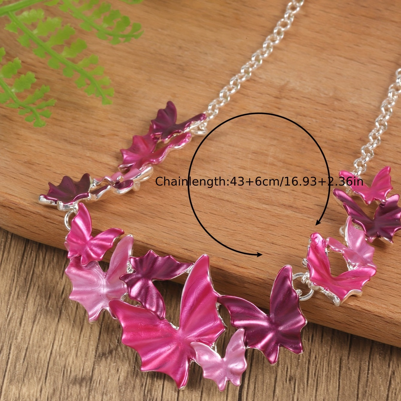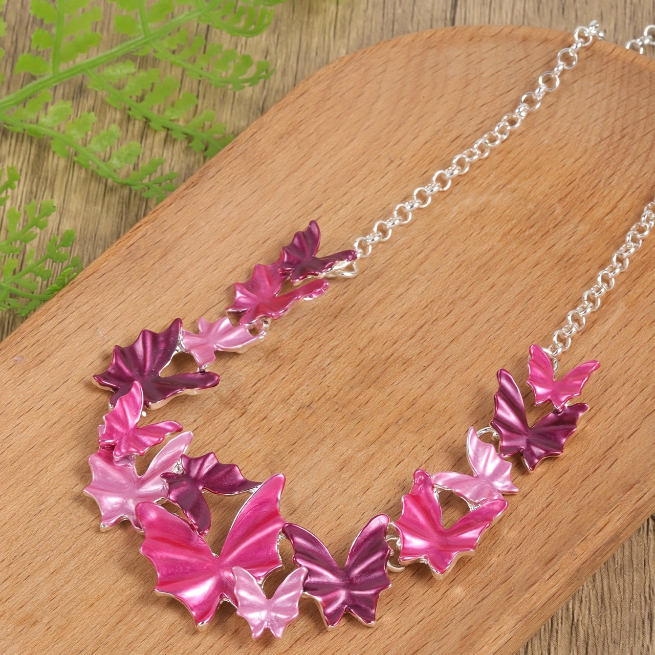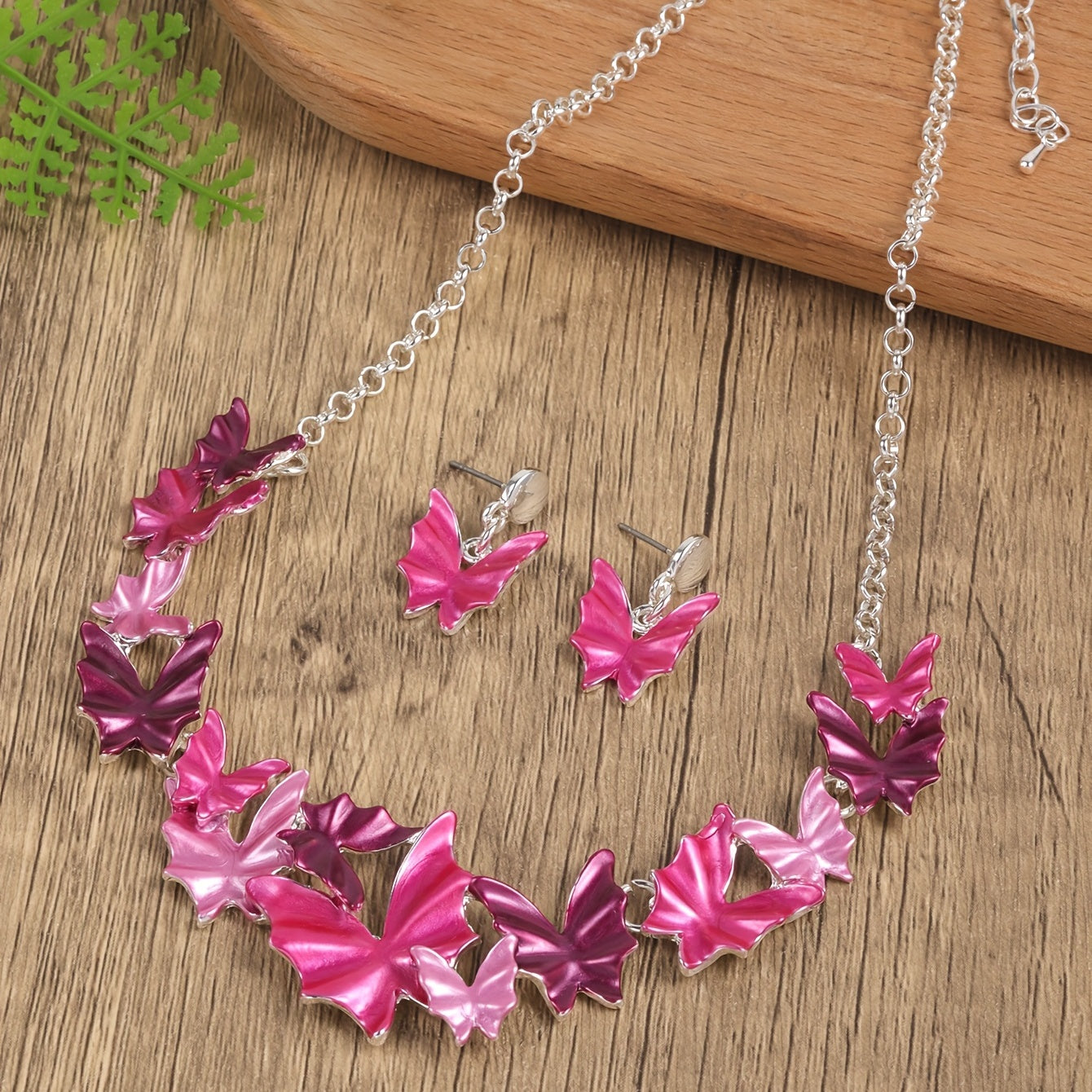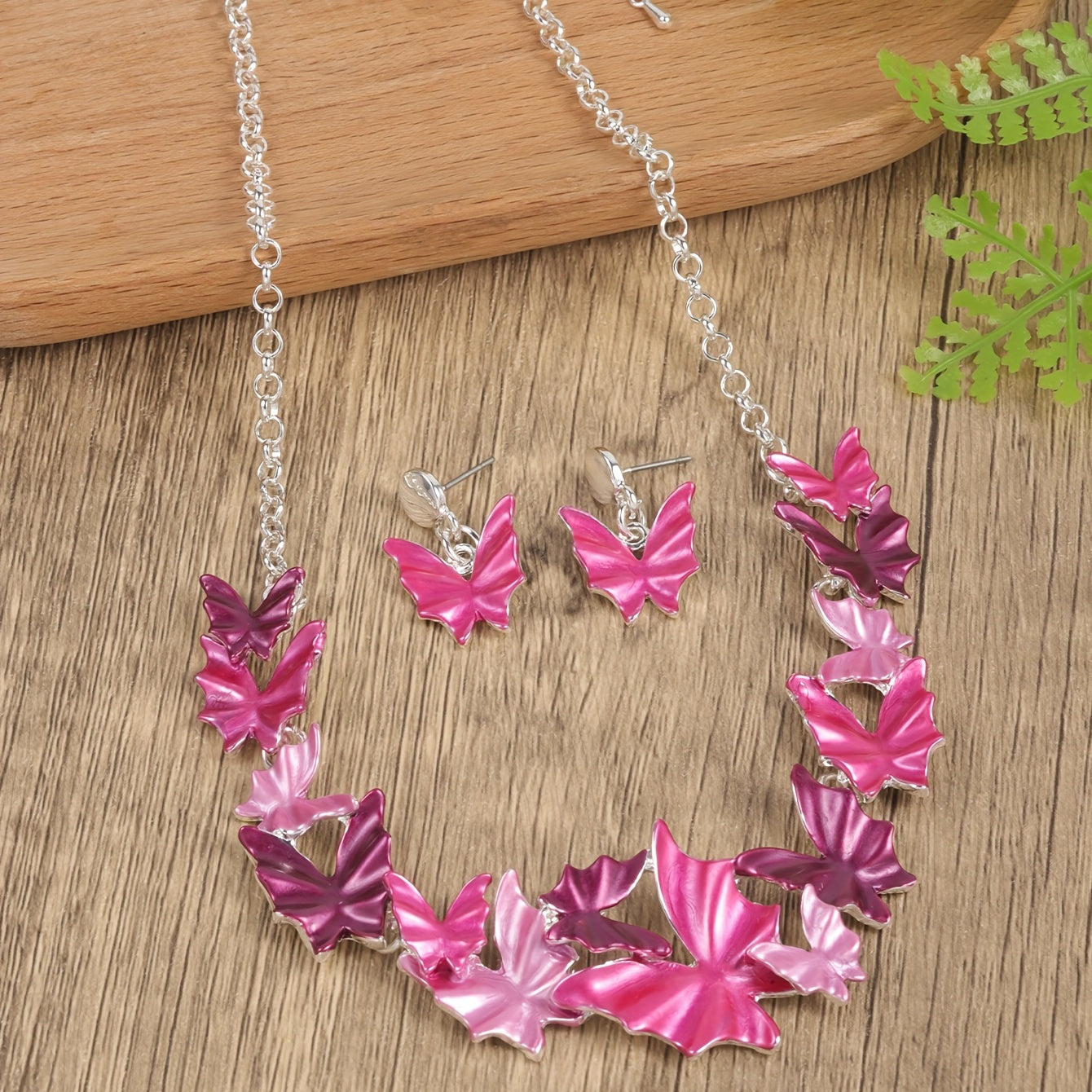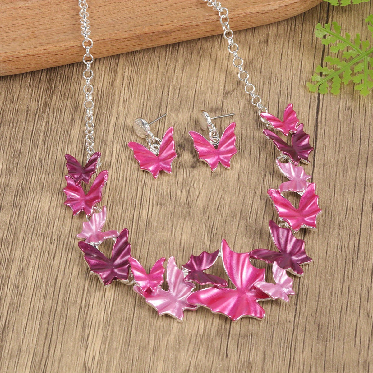 Add a touch of boho style to your vacation outfits with this pink butterfly earrings and necklace set. Perfect for any getaway, this set will elevate your look with its unique design and vibrant colors.
