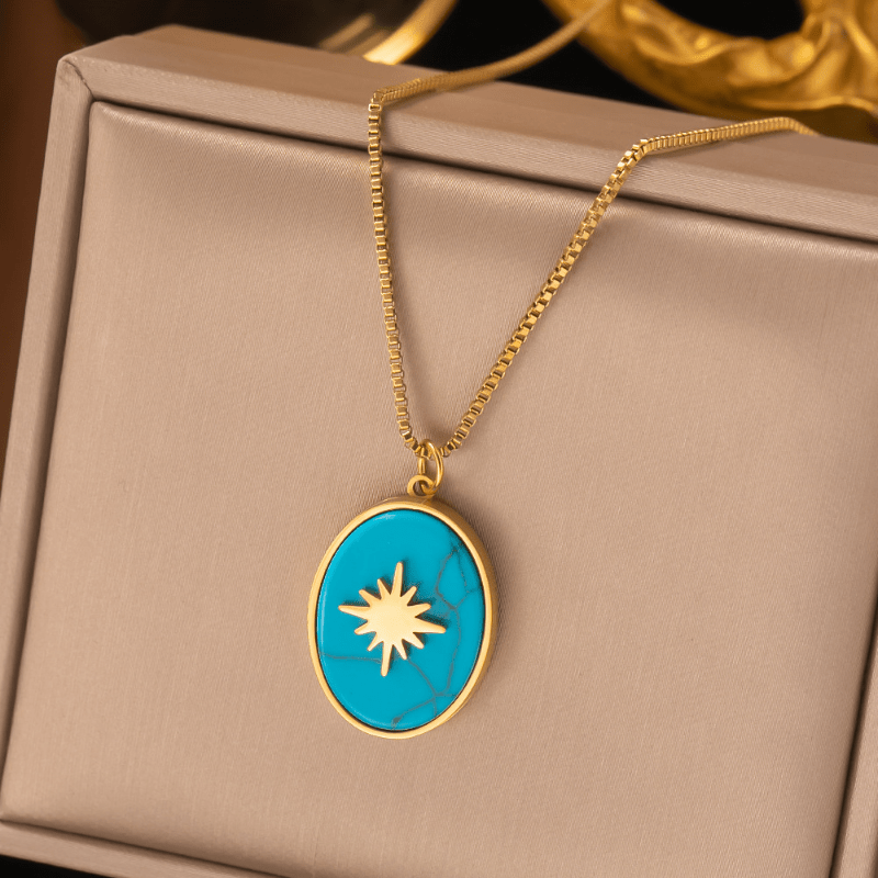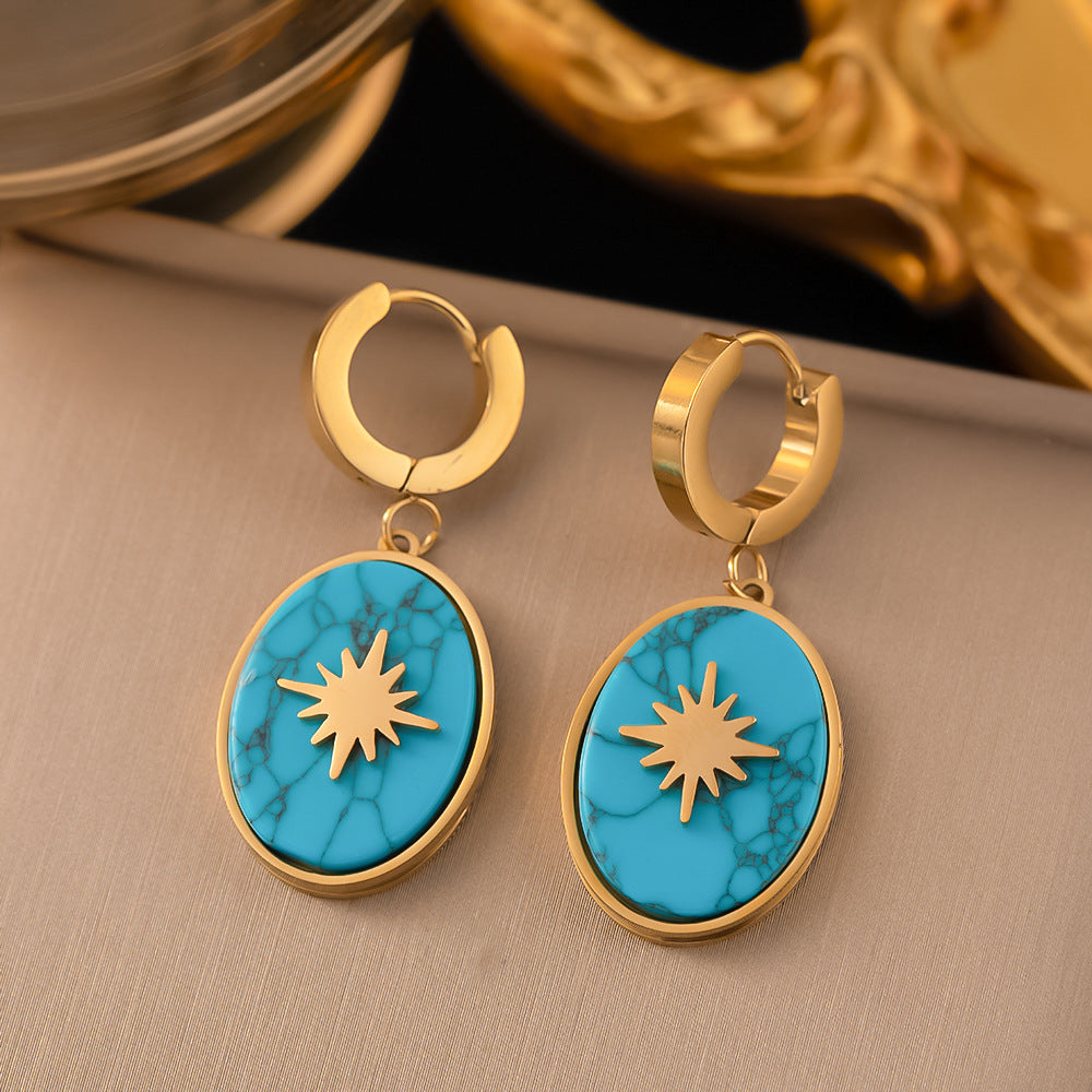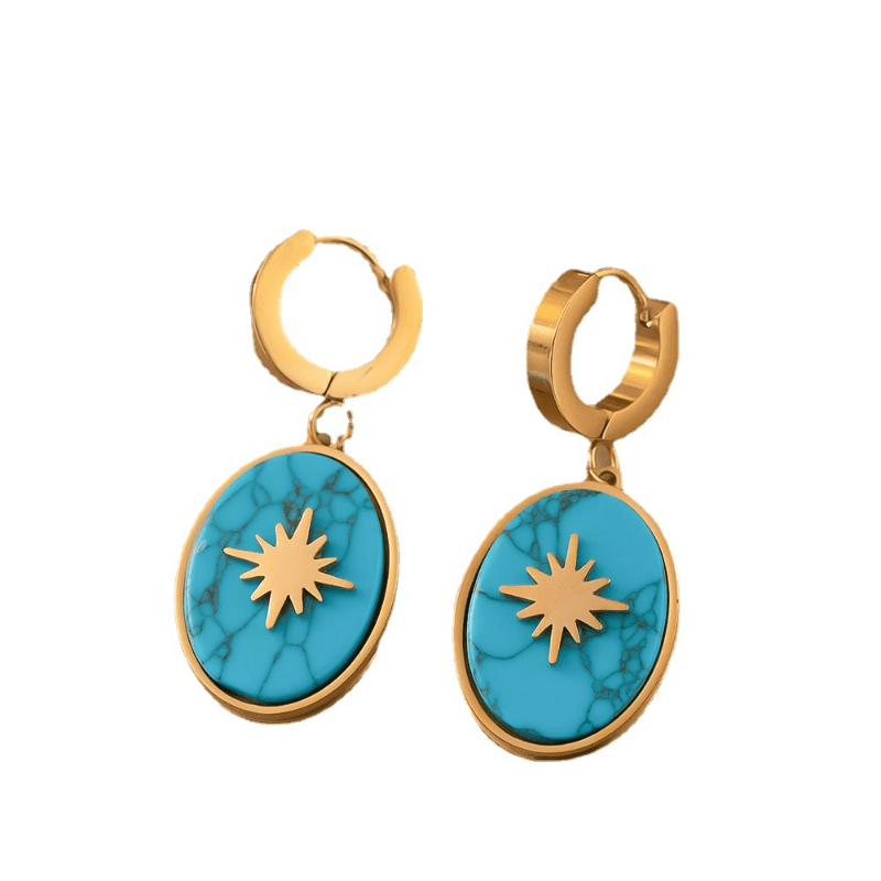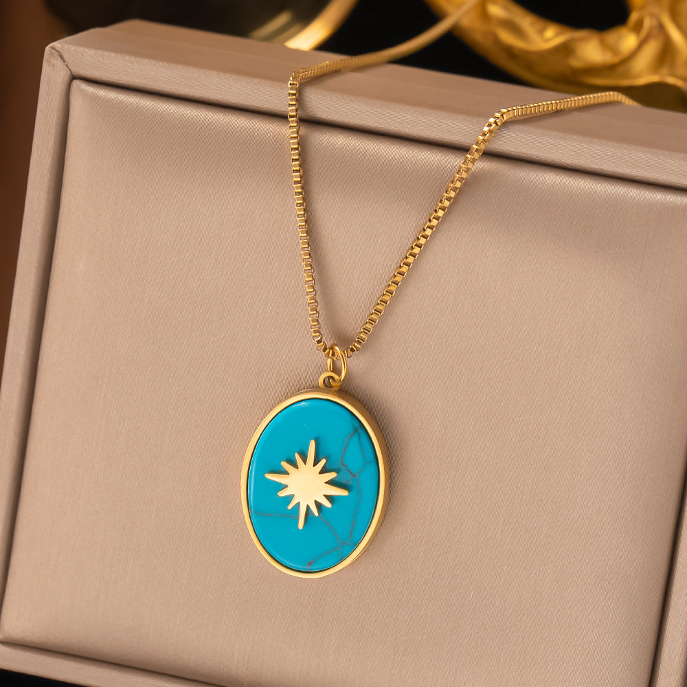 Elevate your style with this stunning necklace and earring set featuring an octagram turquoise pendant. Crafted from 14K plated stainless steel, this jewelry set exudes personality and charm.