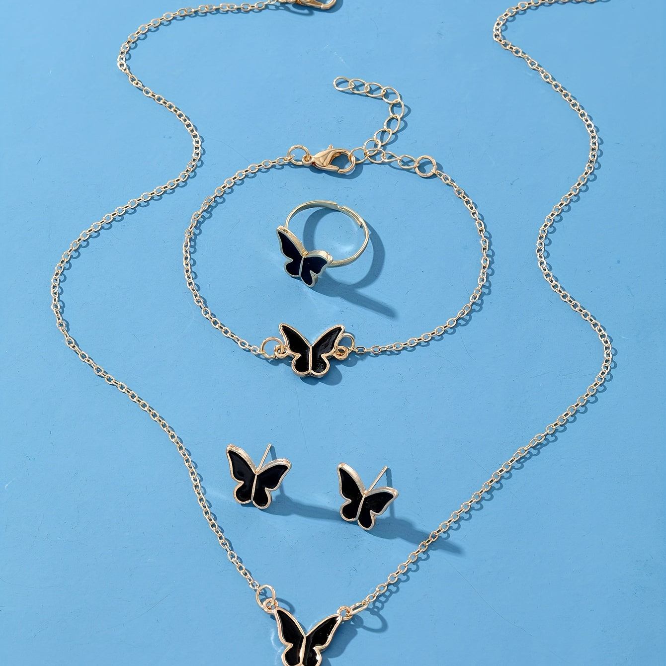 Adorn yourself with this stylish butterfly jewelry set featuring a ring, earrings, bracelet, and necklace. Perfect for women and girls looking to add a touch of elegance to their outfit.
