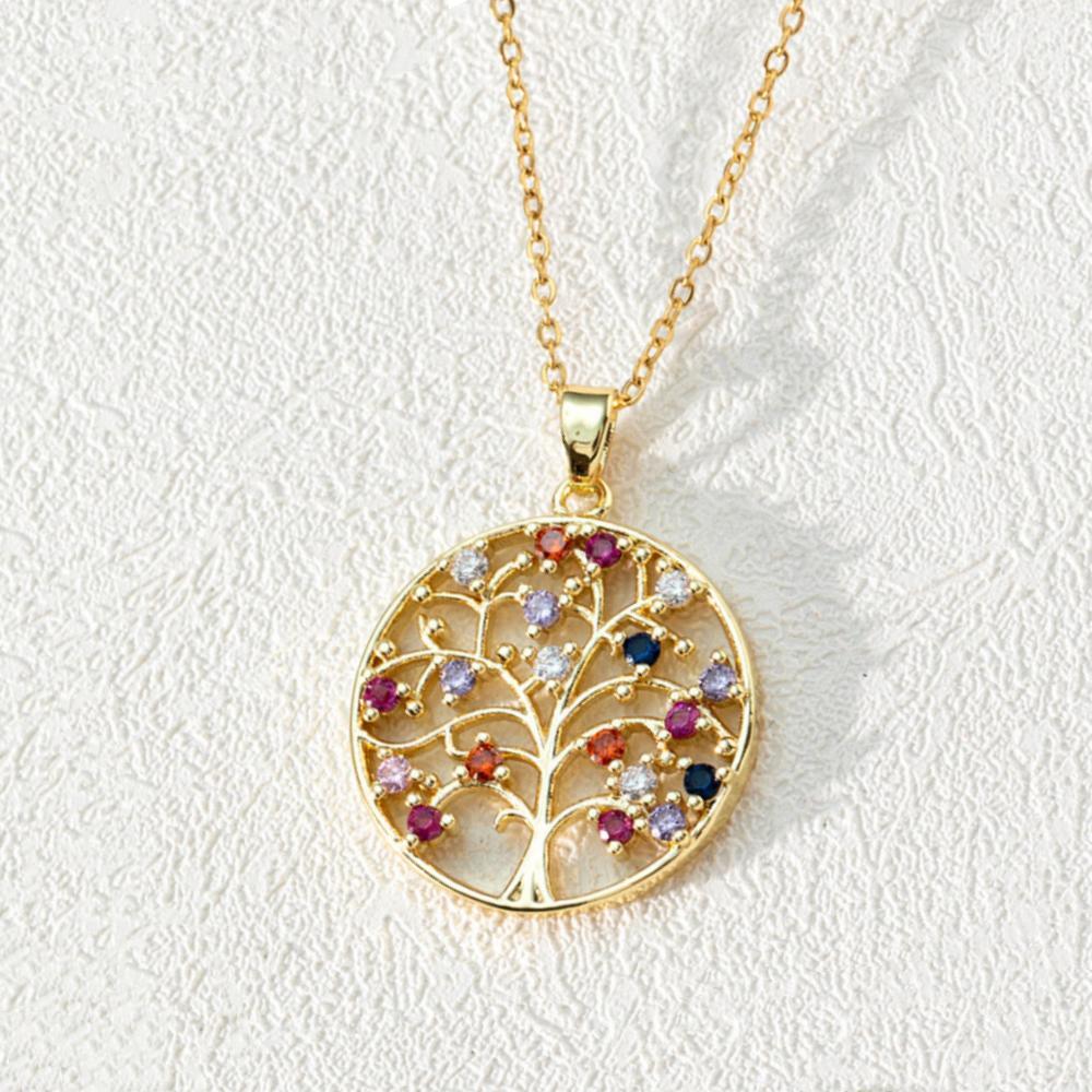 Elegant set featuring a colored zircon tree of life pendant necklace and ring. Perfect for weddings, birthdays, or parties. Ideal gift for family and friends.