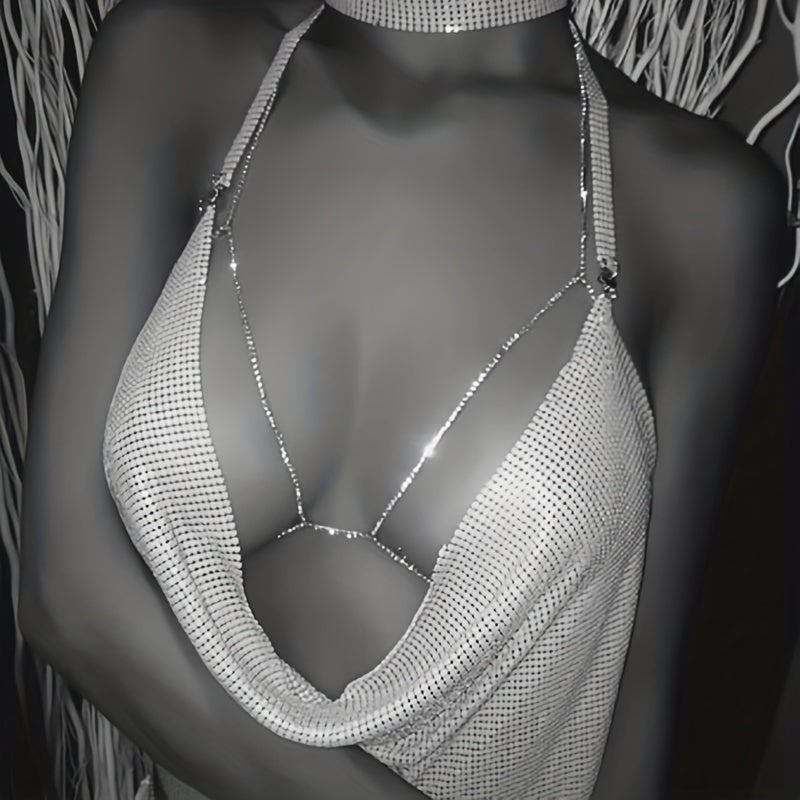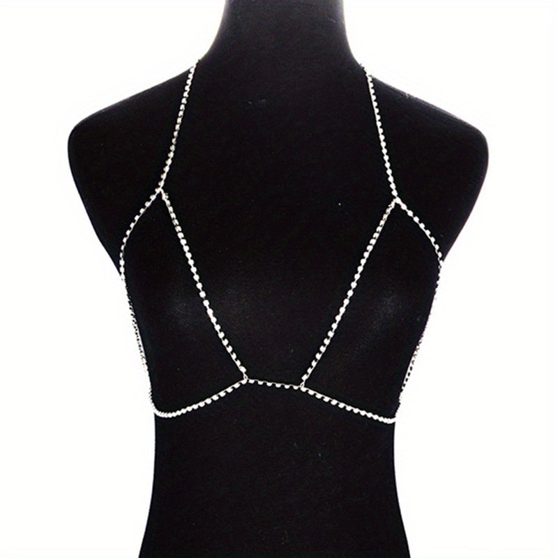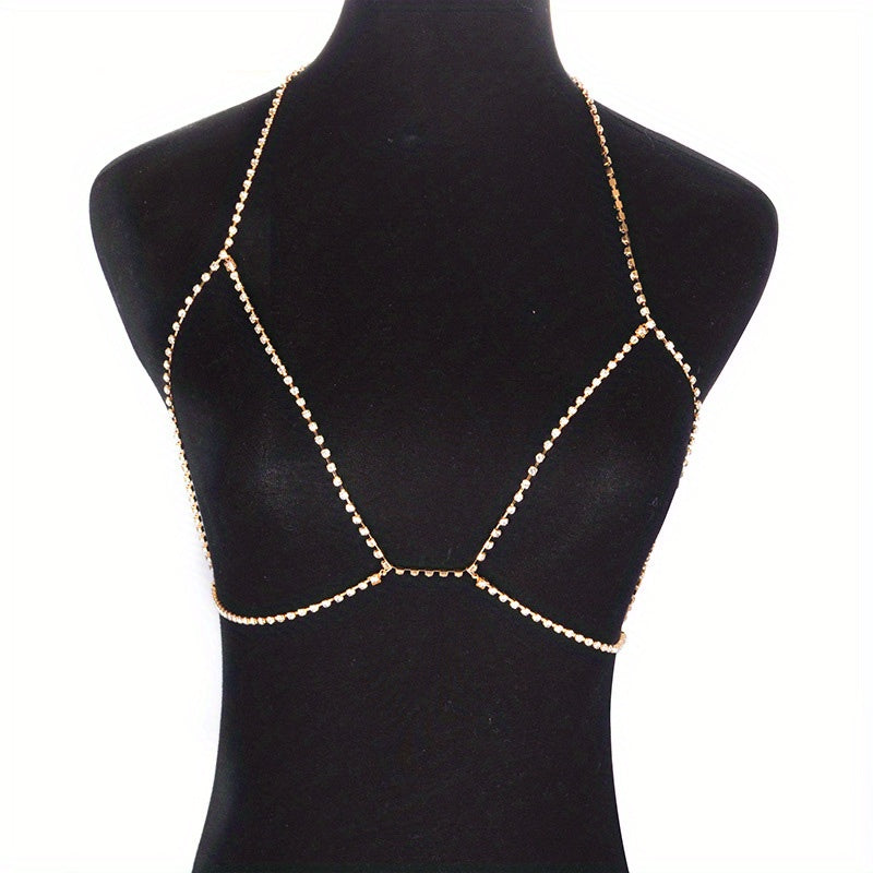 Elevate your beach look with this sexy body chain featuring crystal rhinestones. Perfect for adding a touch of glamour to your bikini or beach dress ensemble.