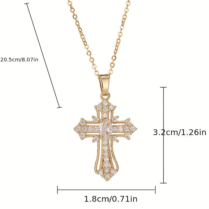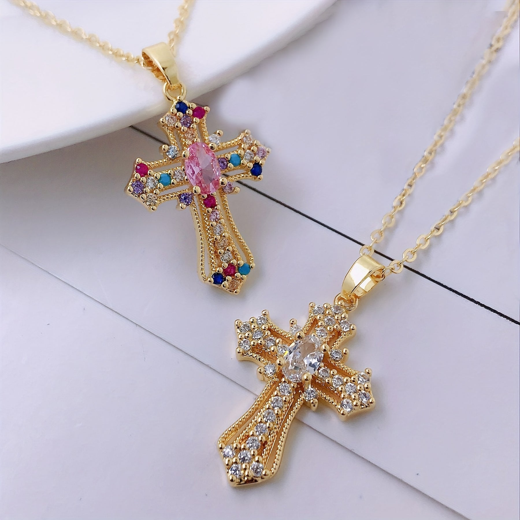 This stylish pendant necklace features a cross design adorned with crystal zircon stones. It is plated with 22K gold for a luxurious look.