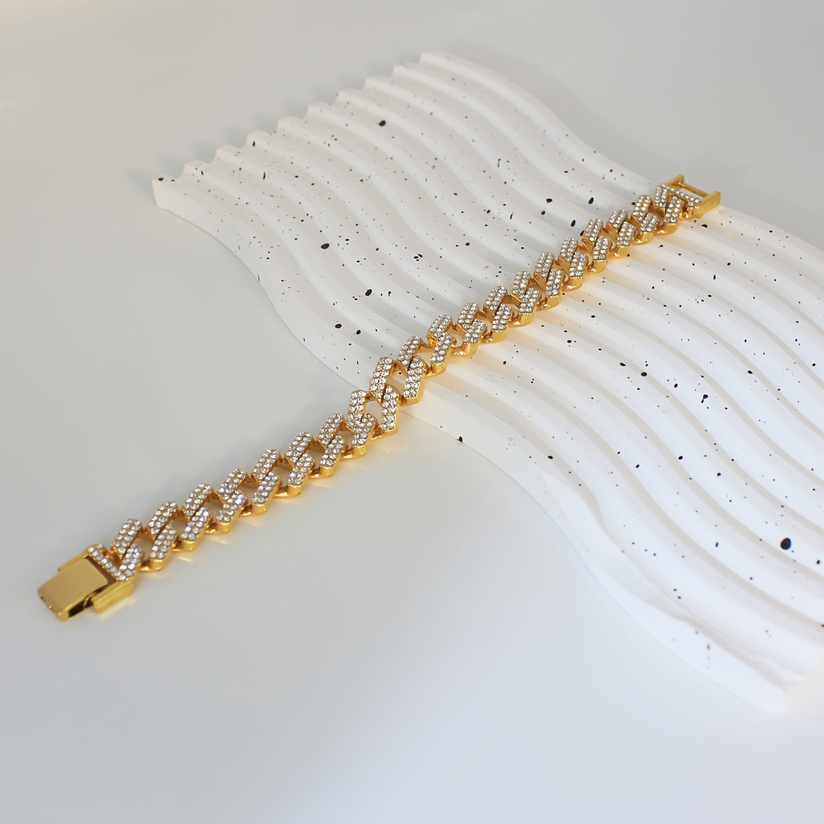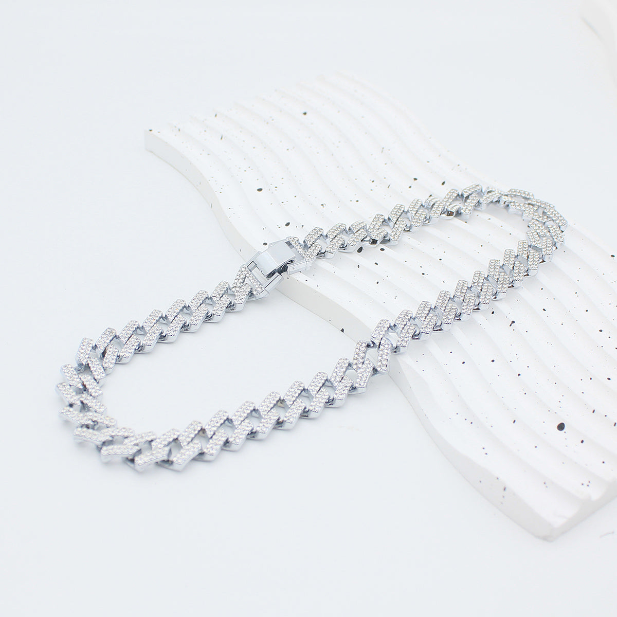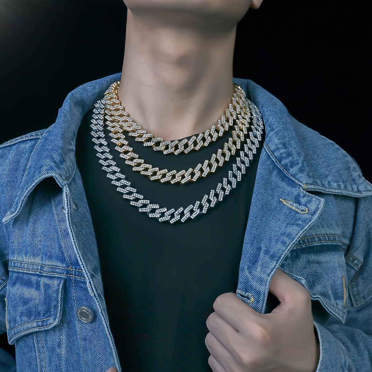 Elevate your style with this stunning Cuban link chain necklace adorned with shimmering rhinestones.