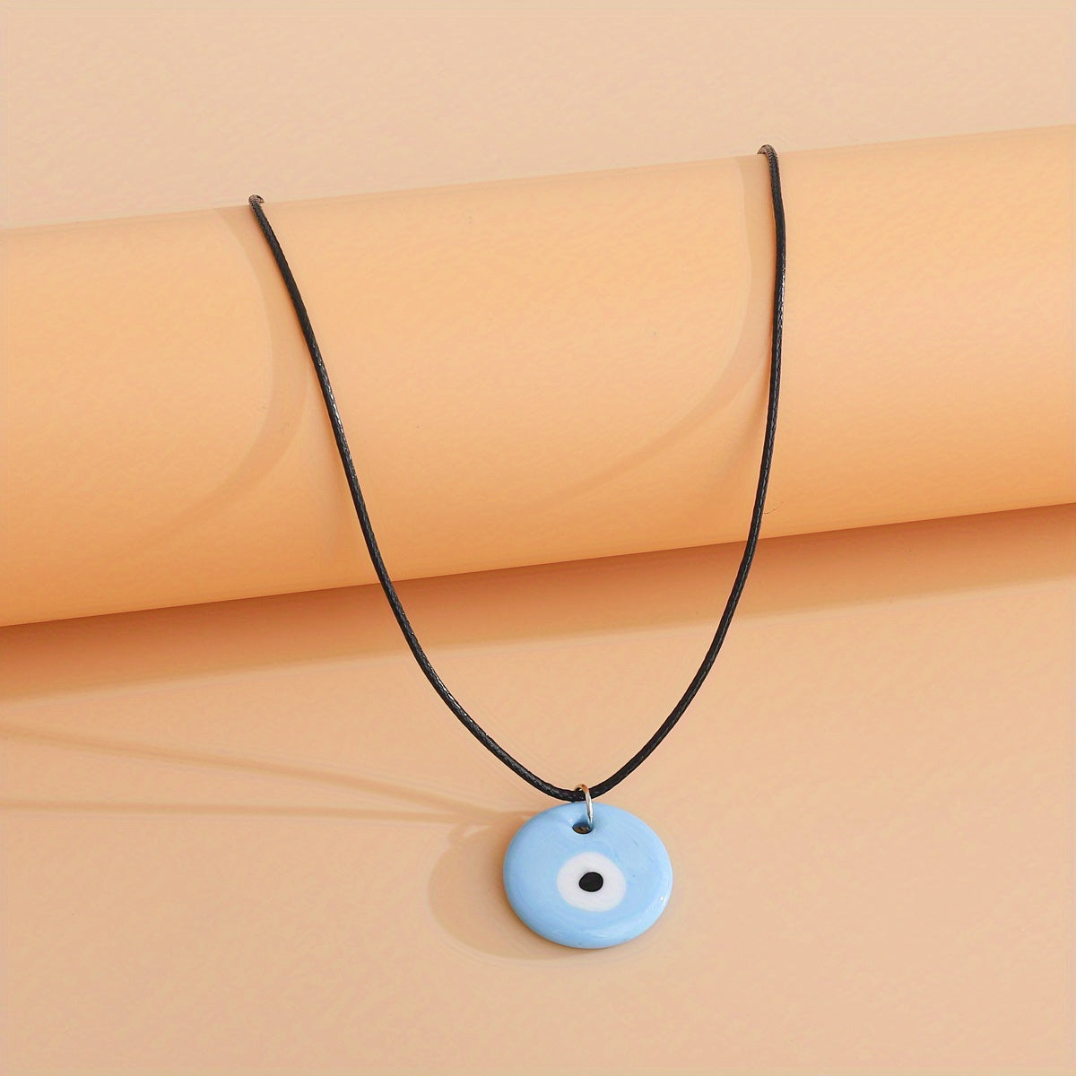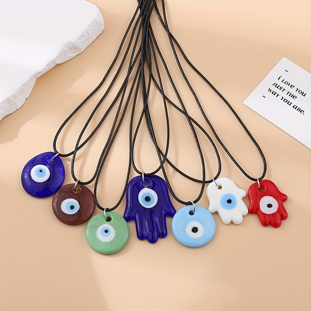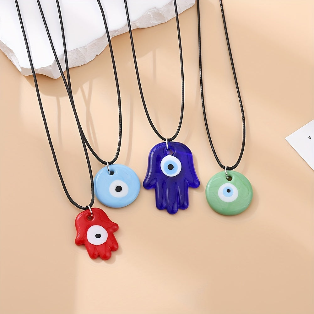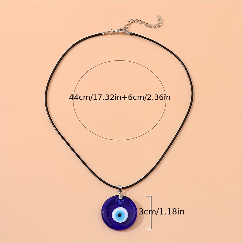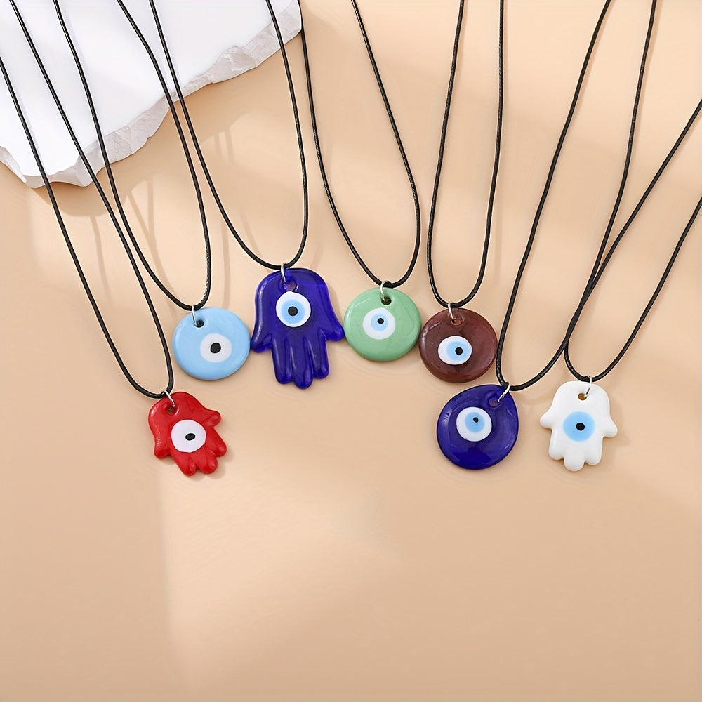 This Evil's Eye glass pendant necklace is a symbol of good luck and protection. It features a unique design with an eye palm and is crafted from wax rope. Add this stylish ornament to your neck jewelry collection.