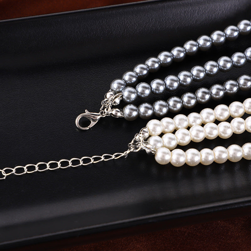 Elegantly crafted faux pearl short necklace paired with two knotted faux pearl clavicle chains make a sophisticated statement.