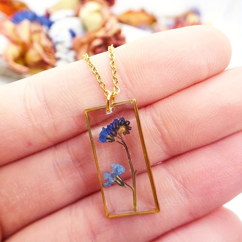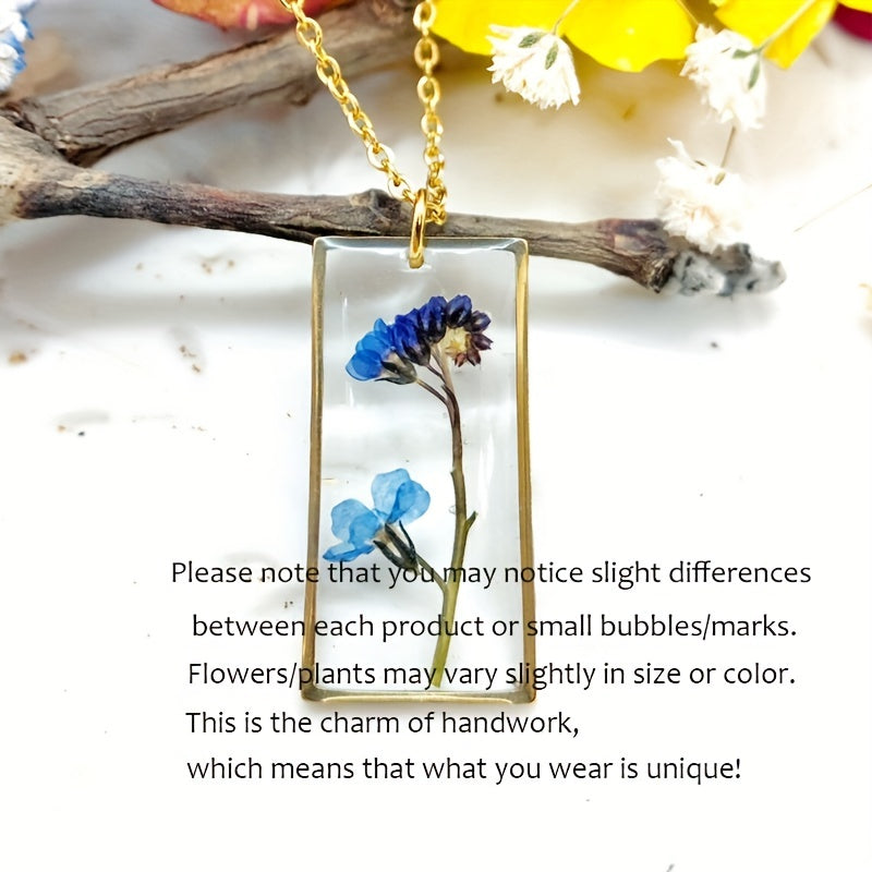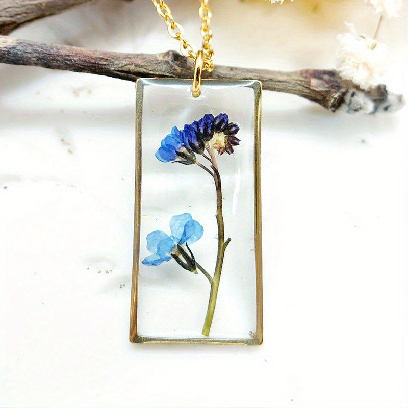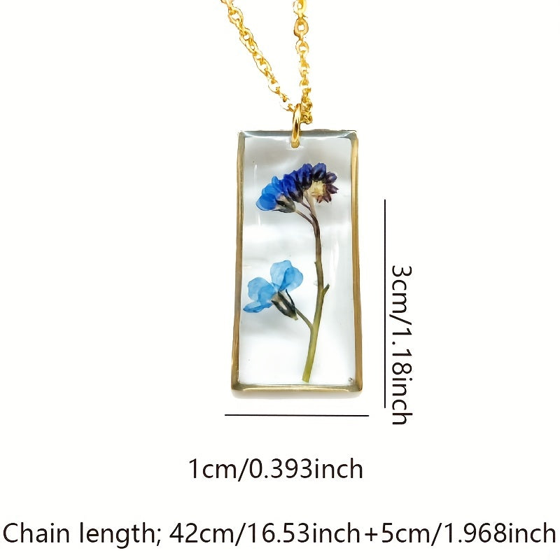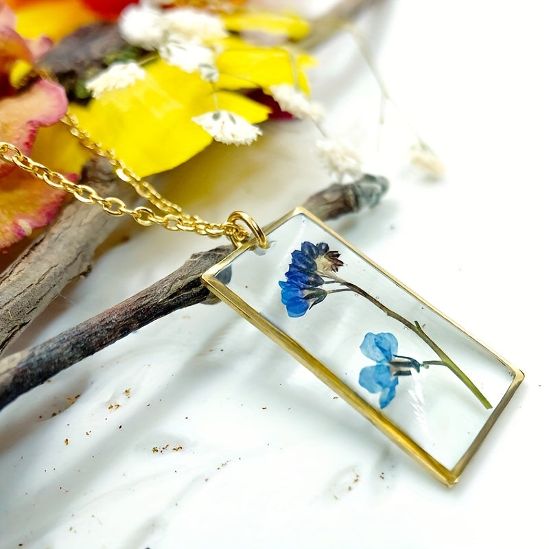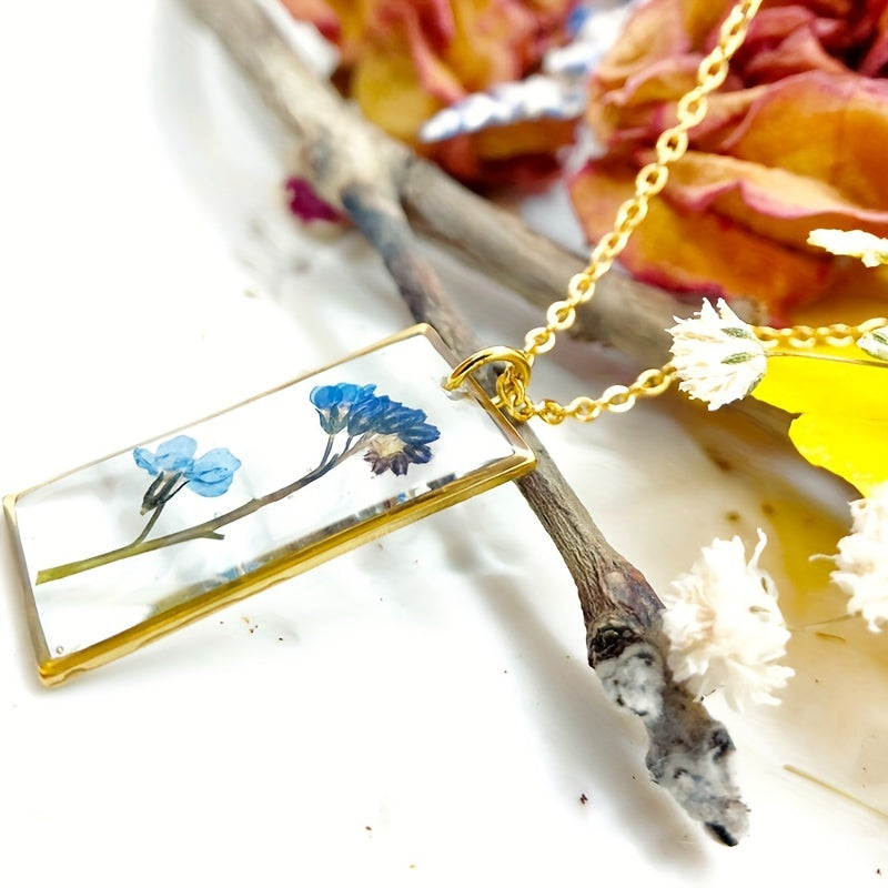 This beautiful necklace features a delicate forget me not flower encased in a resin pendant with a glass container. A unique and elegant piece of neck jewelry that adds a touch of nature to your outfit.
