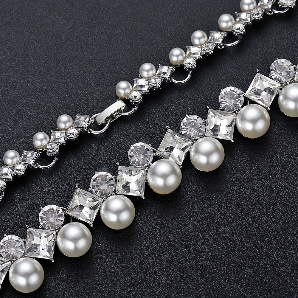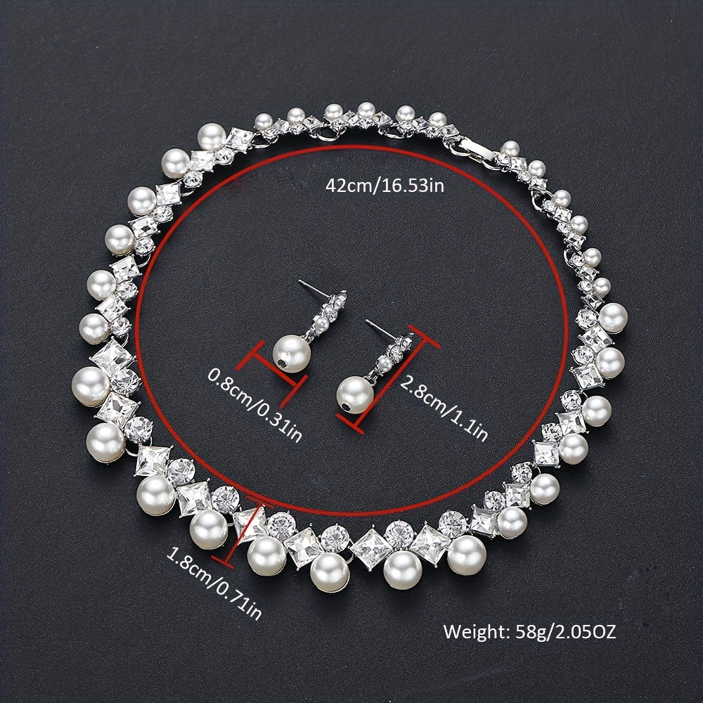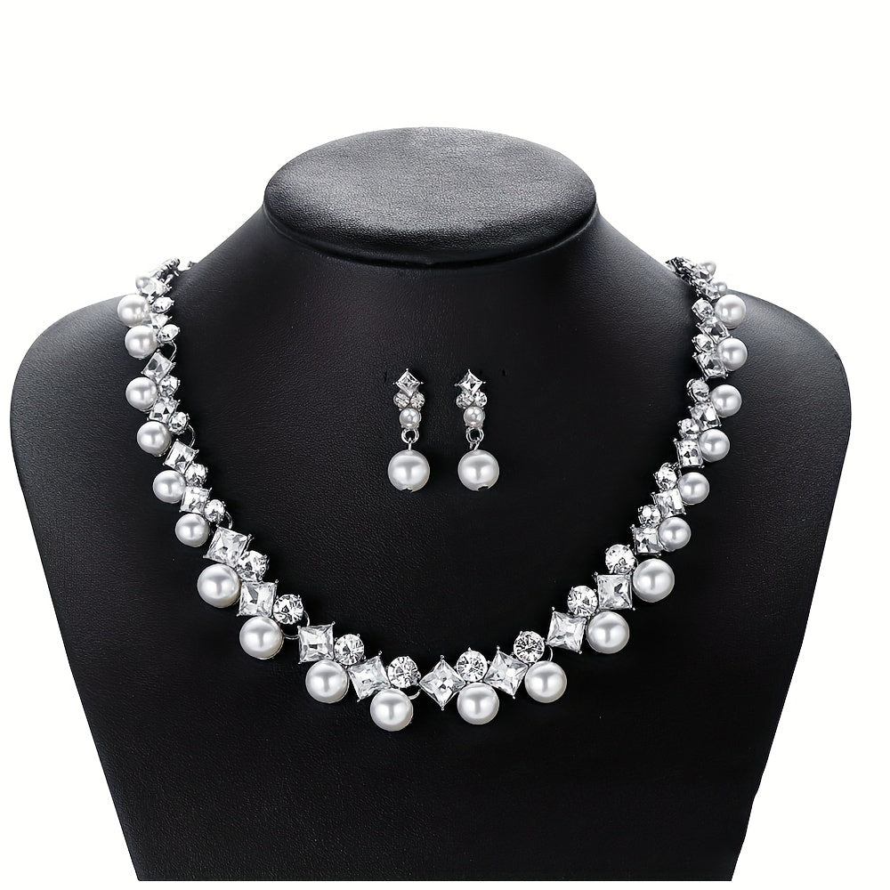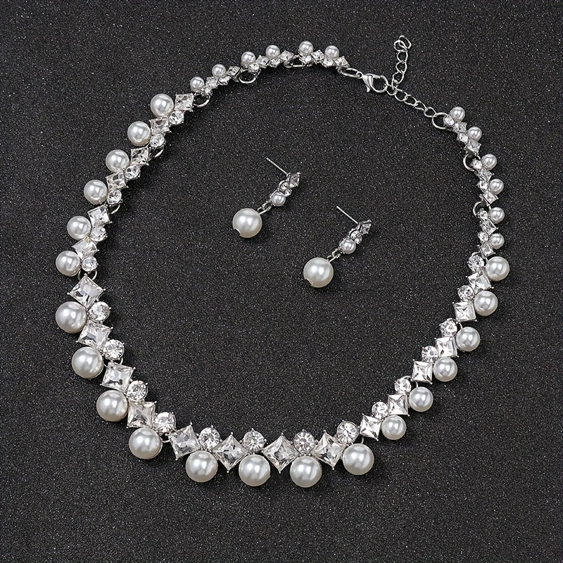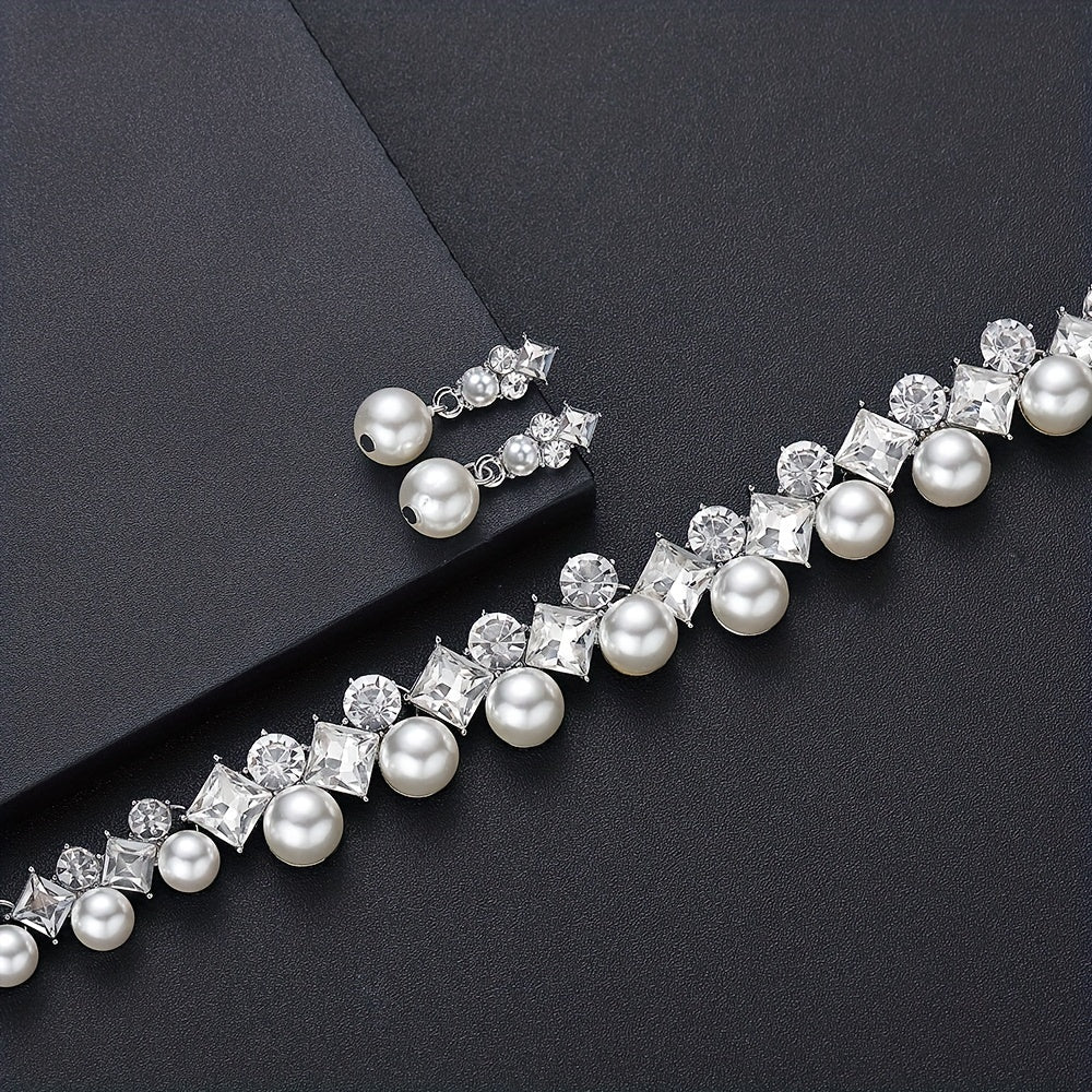 Sparkling silver-plated bridal jewelry set embellished with faux pearls. This stunning set is perfect for a wedding, adding a touch of elegance and glamour to your look.