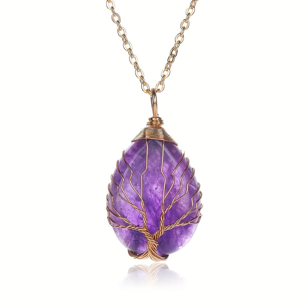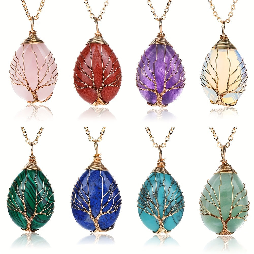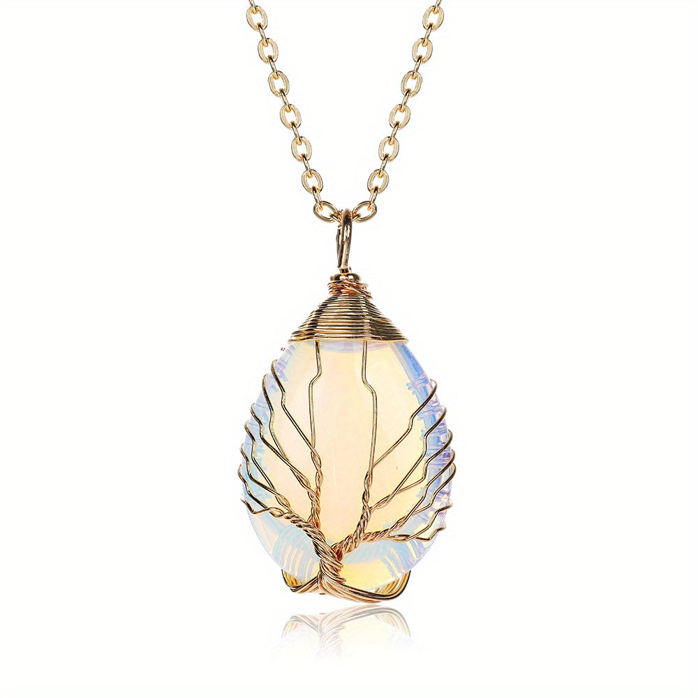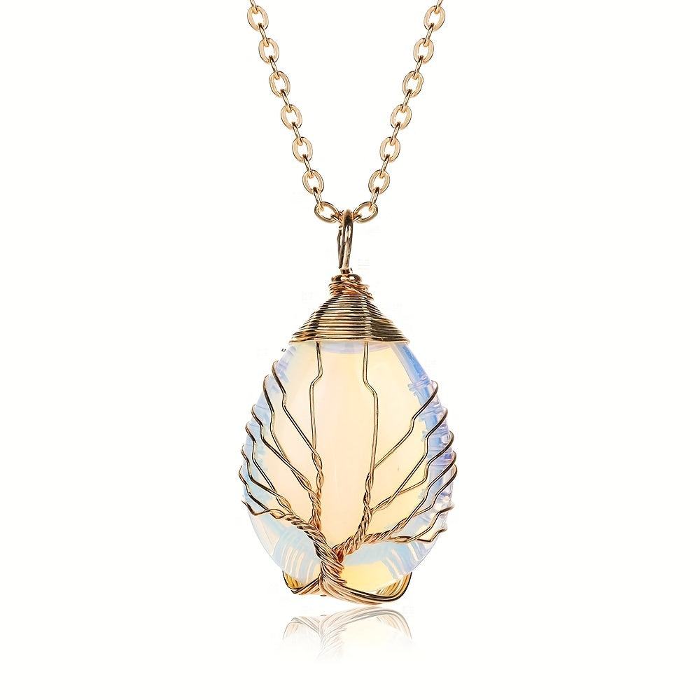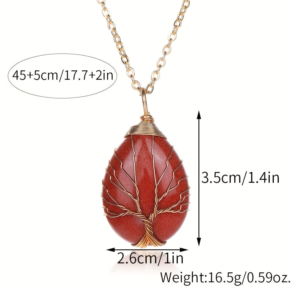 This exquisite pendant necklace features a life tree design with a water drop gemstone. It is elegantly wrapped in golden accents, creating a stylish and meaningful accessory.