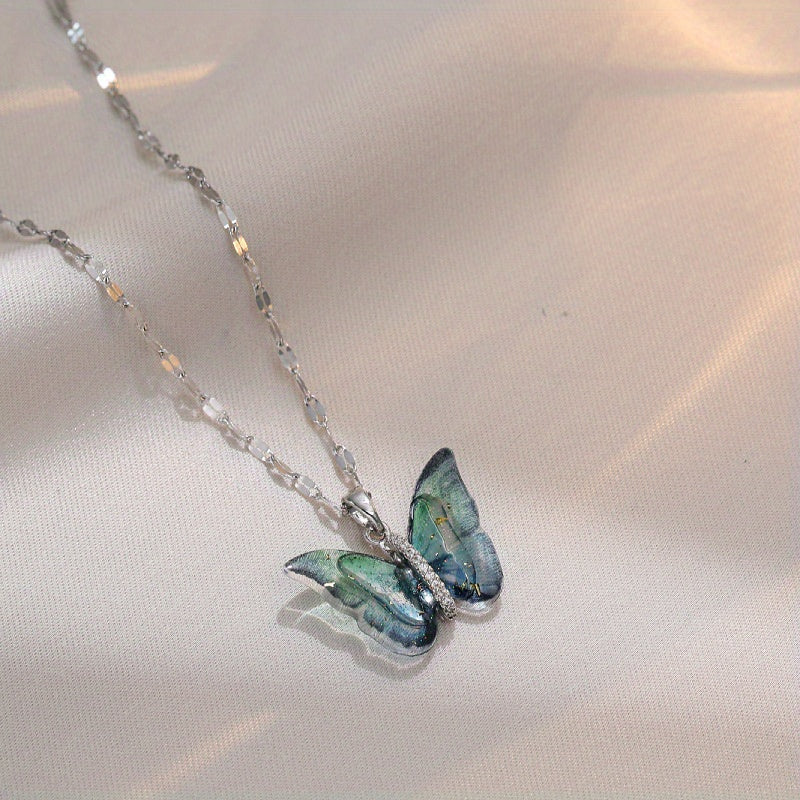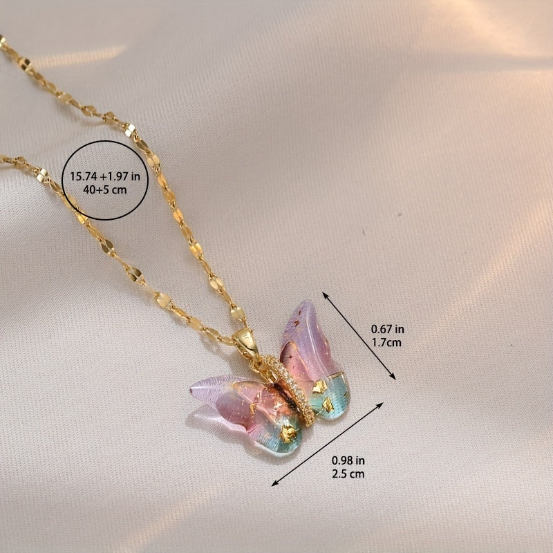Add a touch of whimsical elegance with this stunning gradient butterfly pendant necklace. Featuring green and pink zircon stones, this necklace will add a pop of color to any outfit.