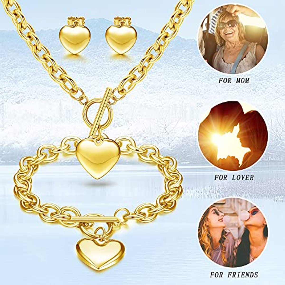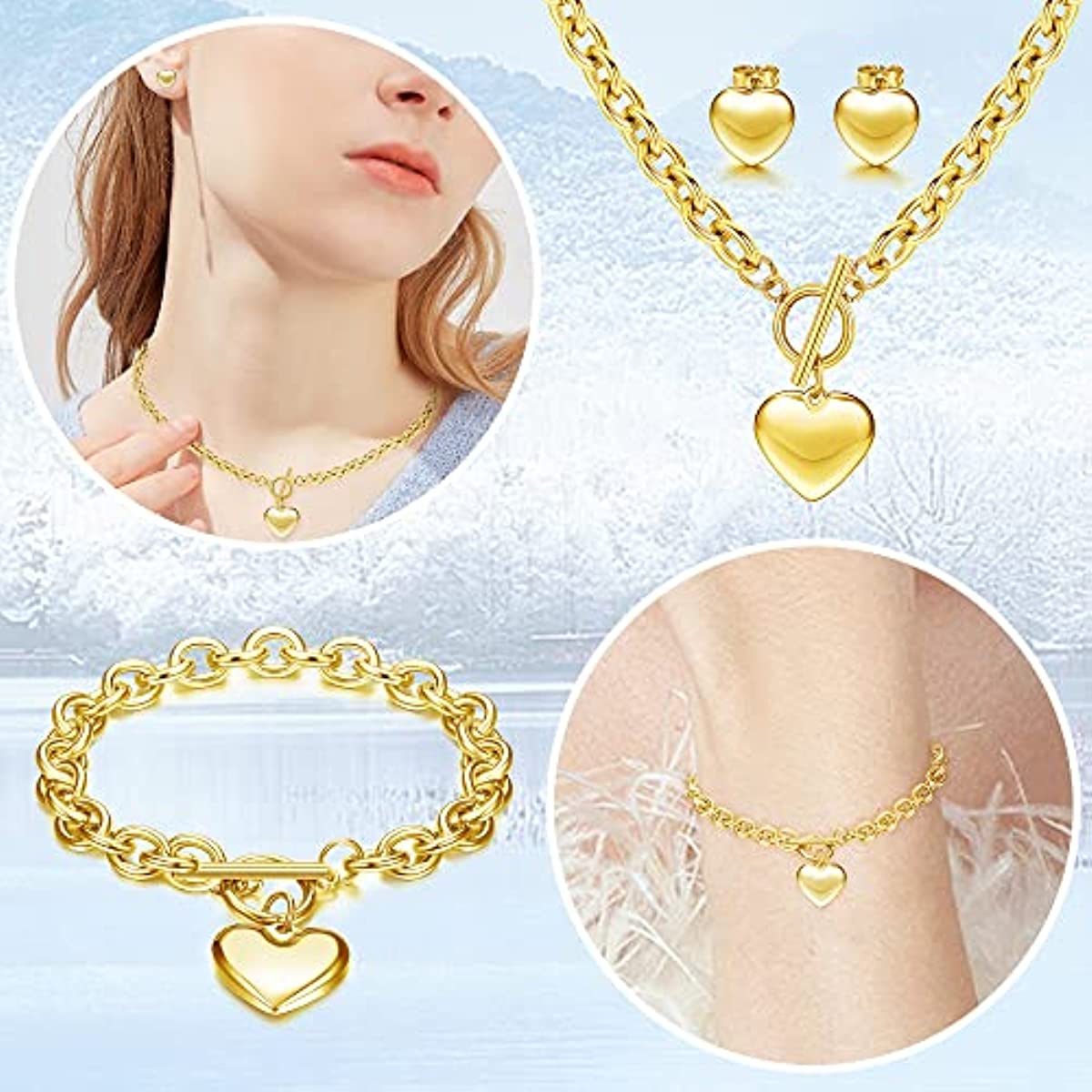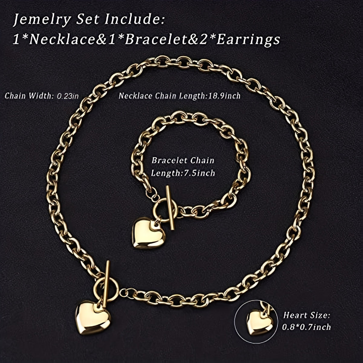 Complete your look with this elegant 18K plated jewelry set featuring a chain necklace, a chain bracelet, and stud earrings with a love heart shape pendant. Perfect for a special occasion or everyday wear.