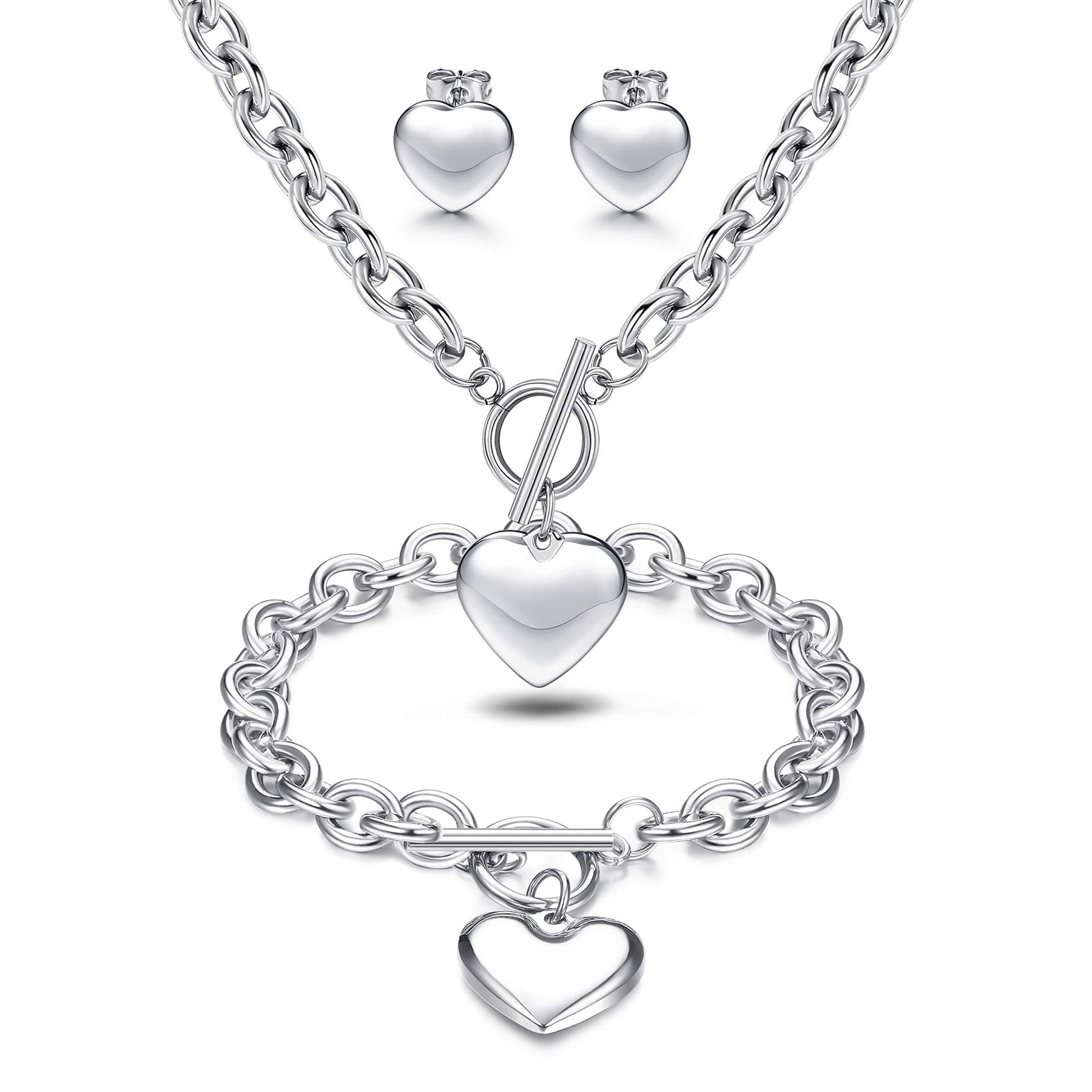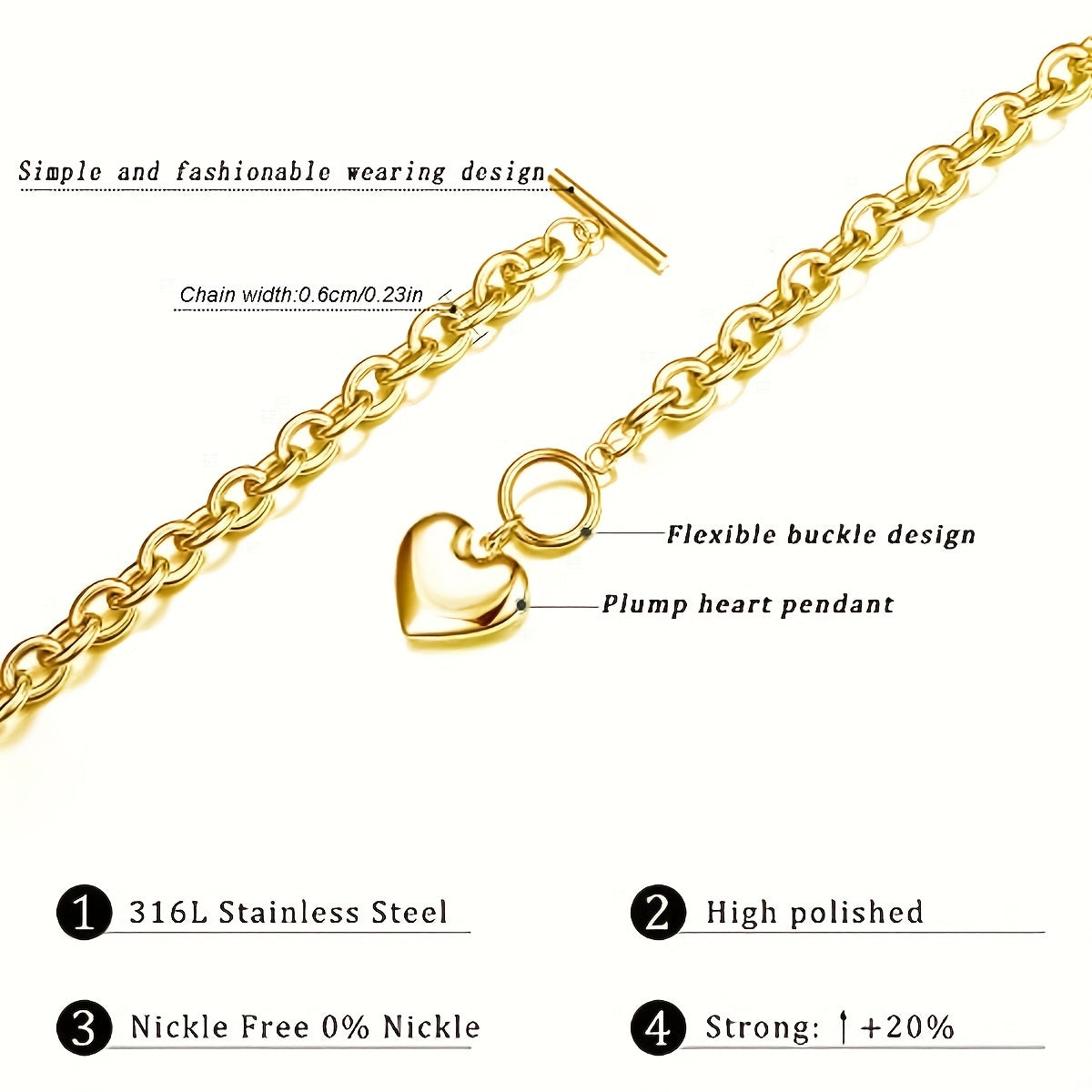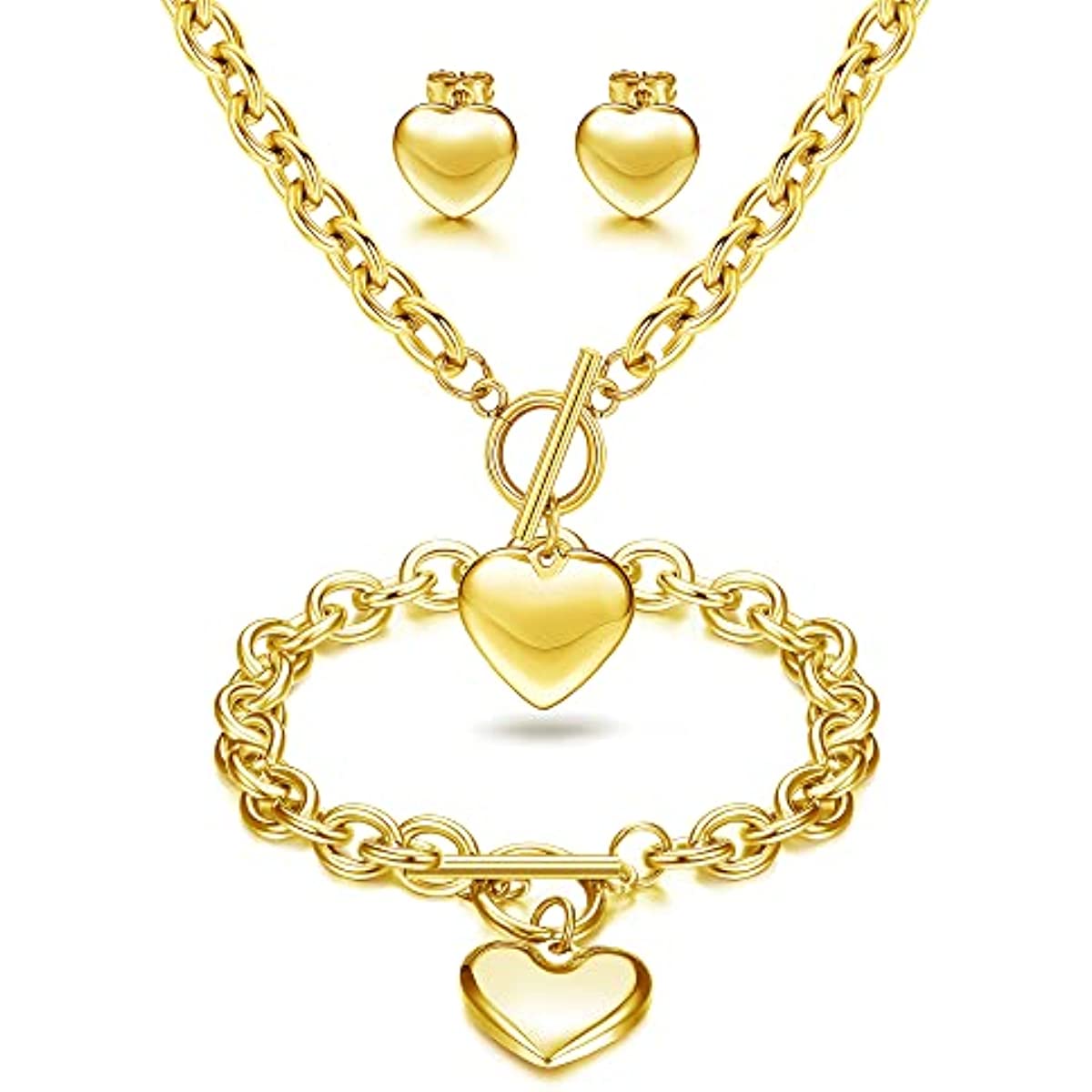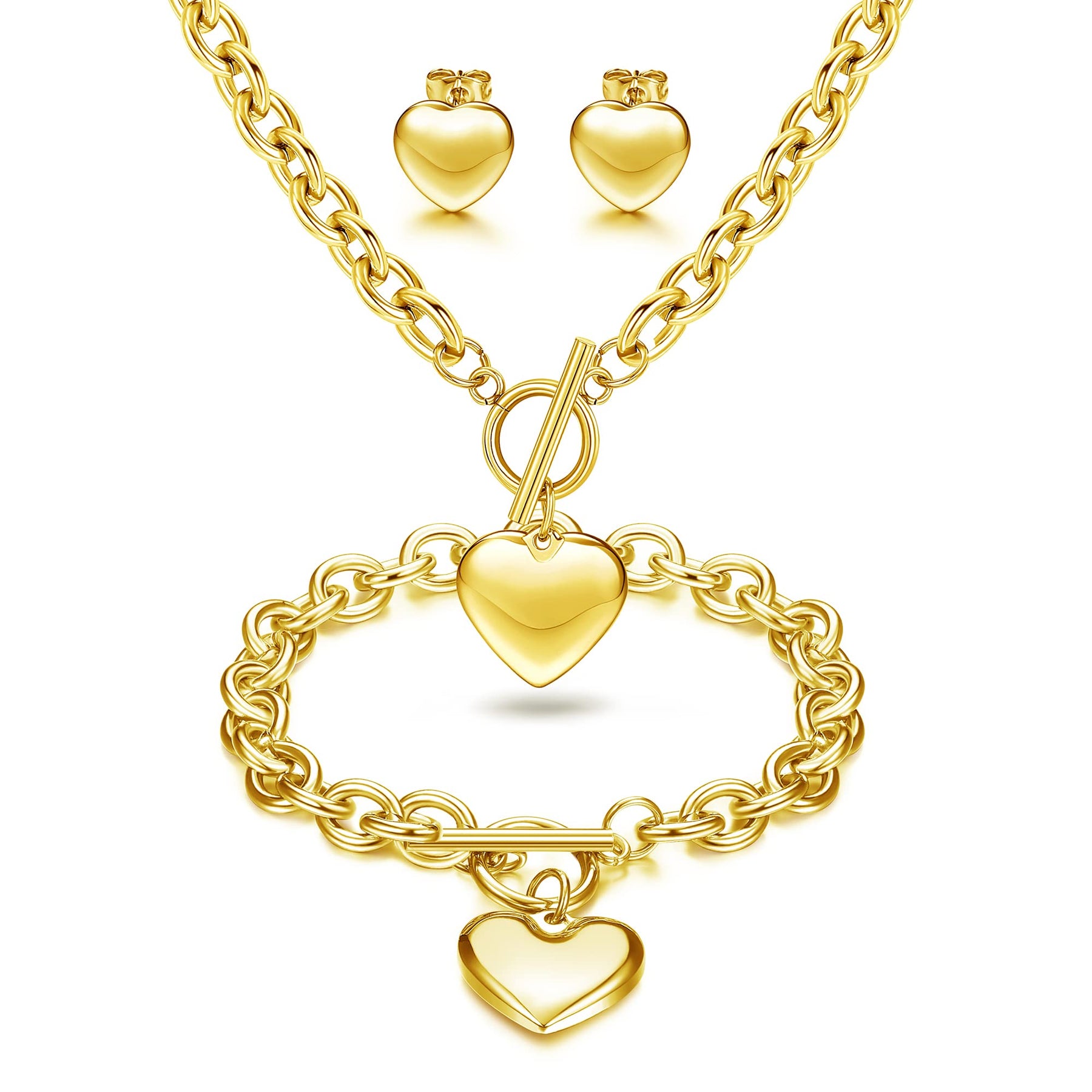Complete your look with this elegant 18K plated jewelry set featuring a chain necklace, a chain bracelet, and stud earrings with a love heart shape pendant. Perfect for a special occasion or everyday wear.