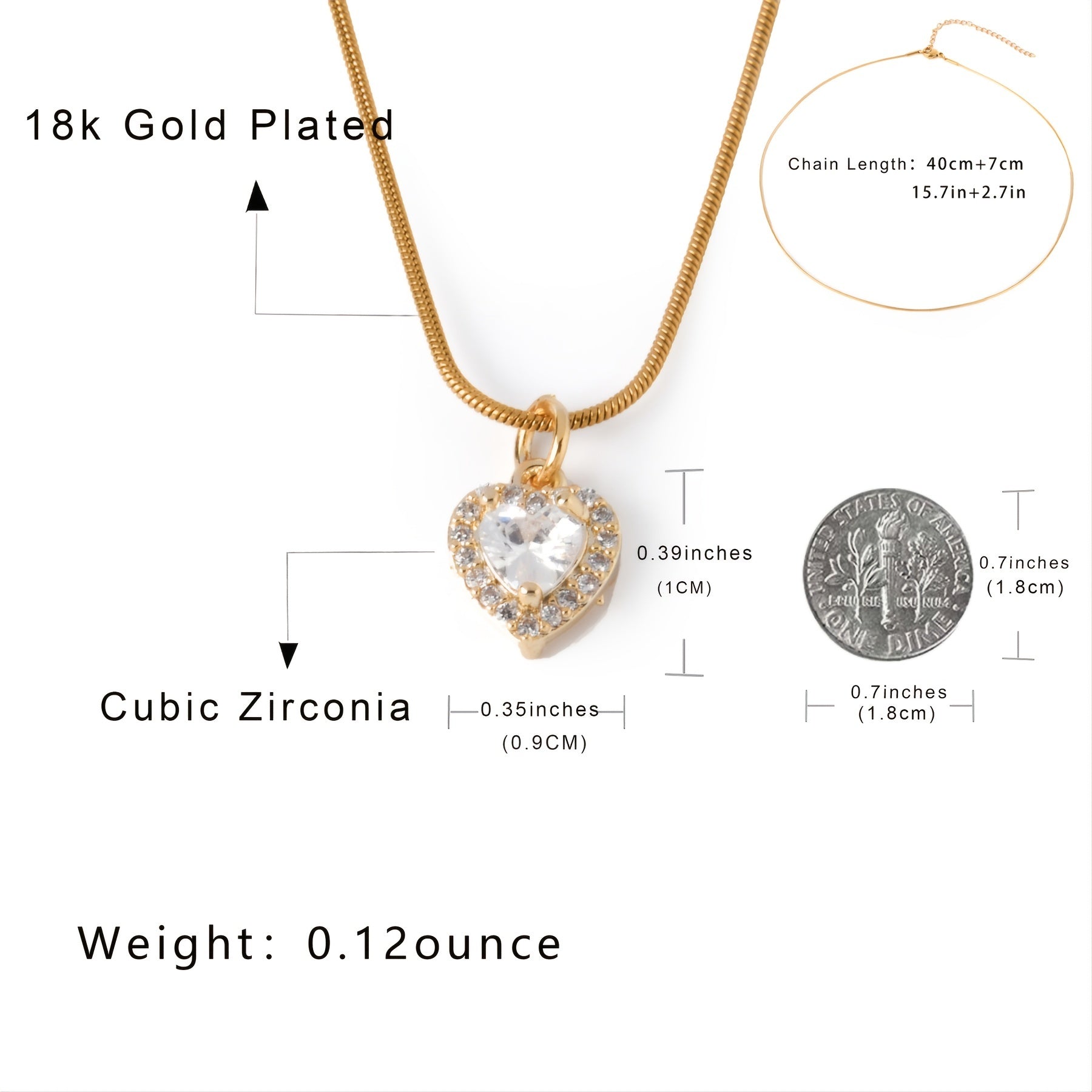 This heart-shaped pendant necklace features a zircon inlay and an adjustable clavicle chain. It is plated with 18K gold, making it a stunning piece of jewelry for any occasion.