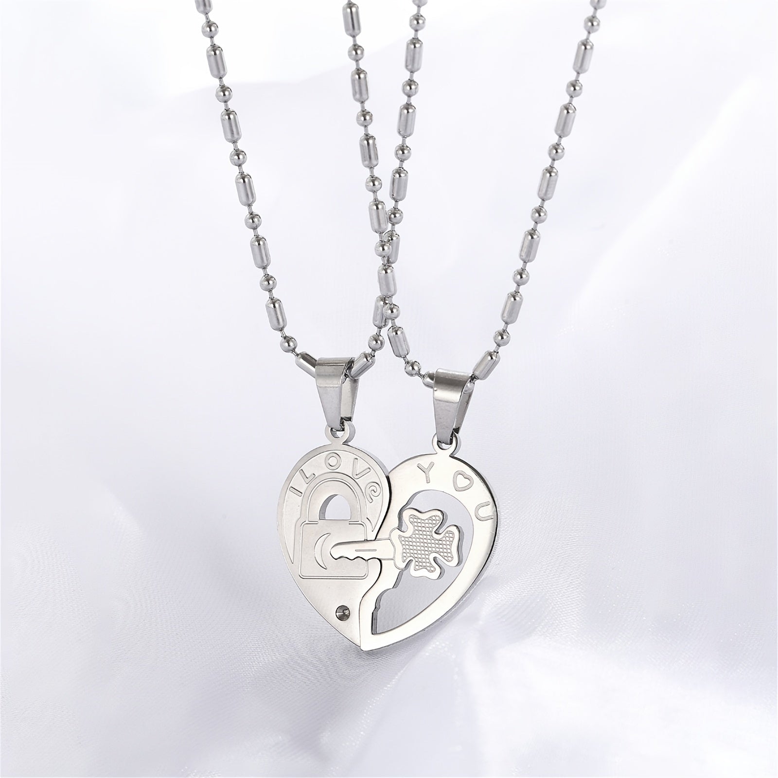 This stainless steel pendant necklace features a heart shaped key design with zircon accents, making it a perfect gift for couples.