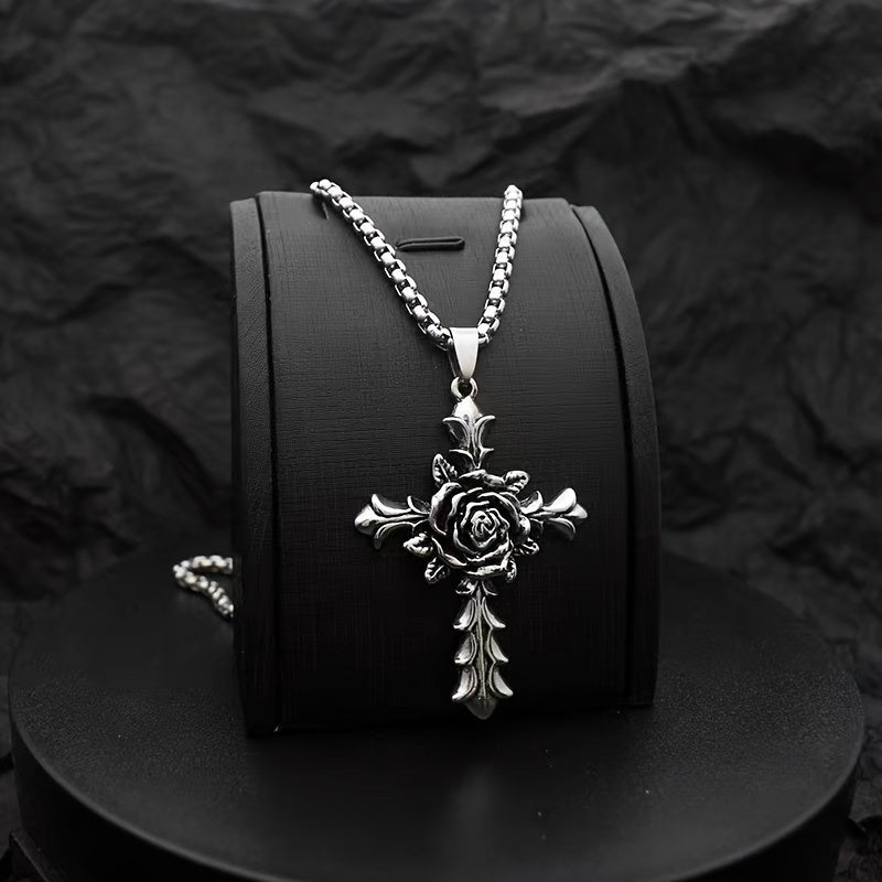 Add a bold touch to your outfit with this hip hop rose cross gothic pendant sweater necklace.
