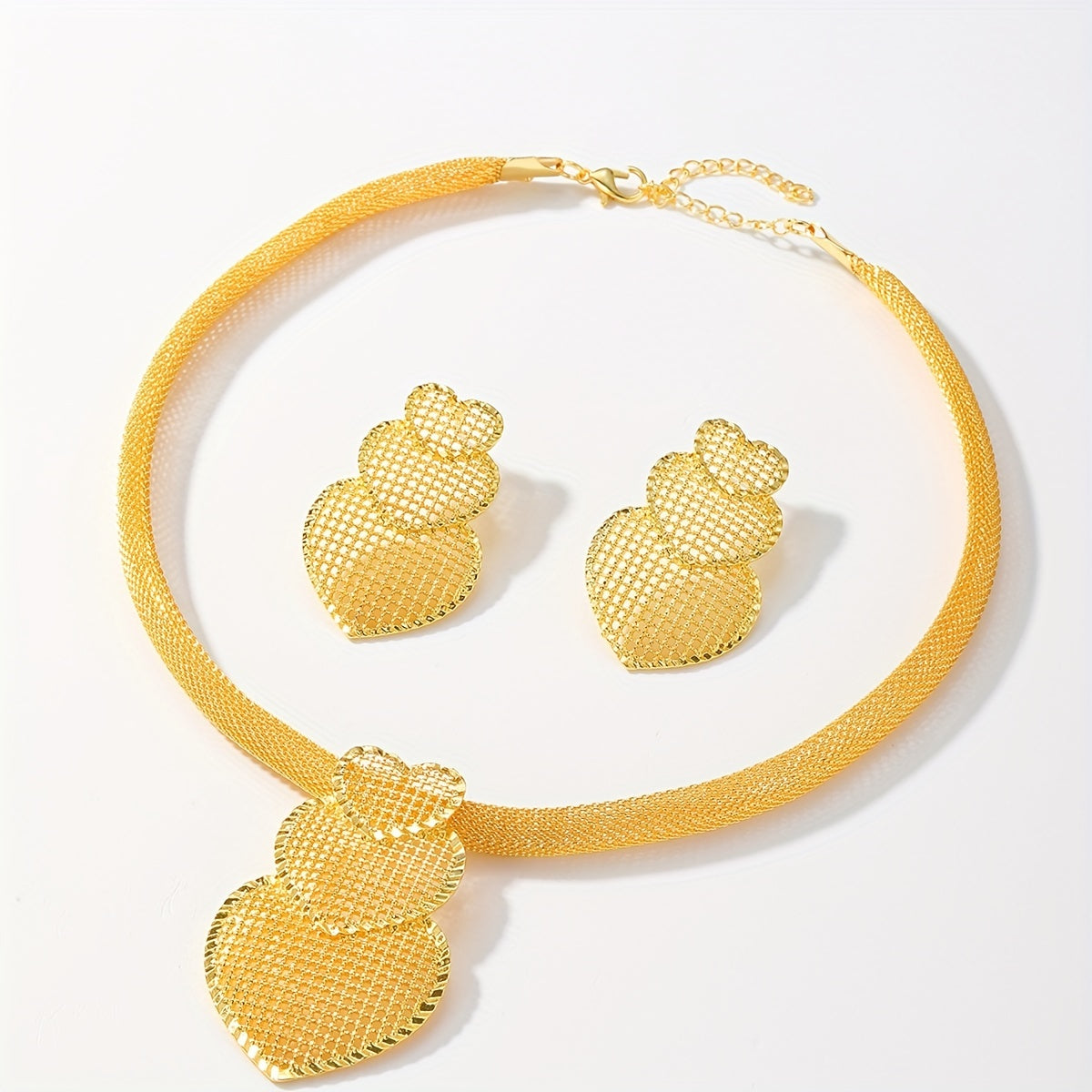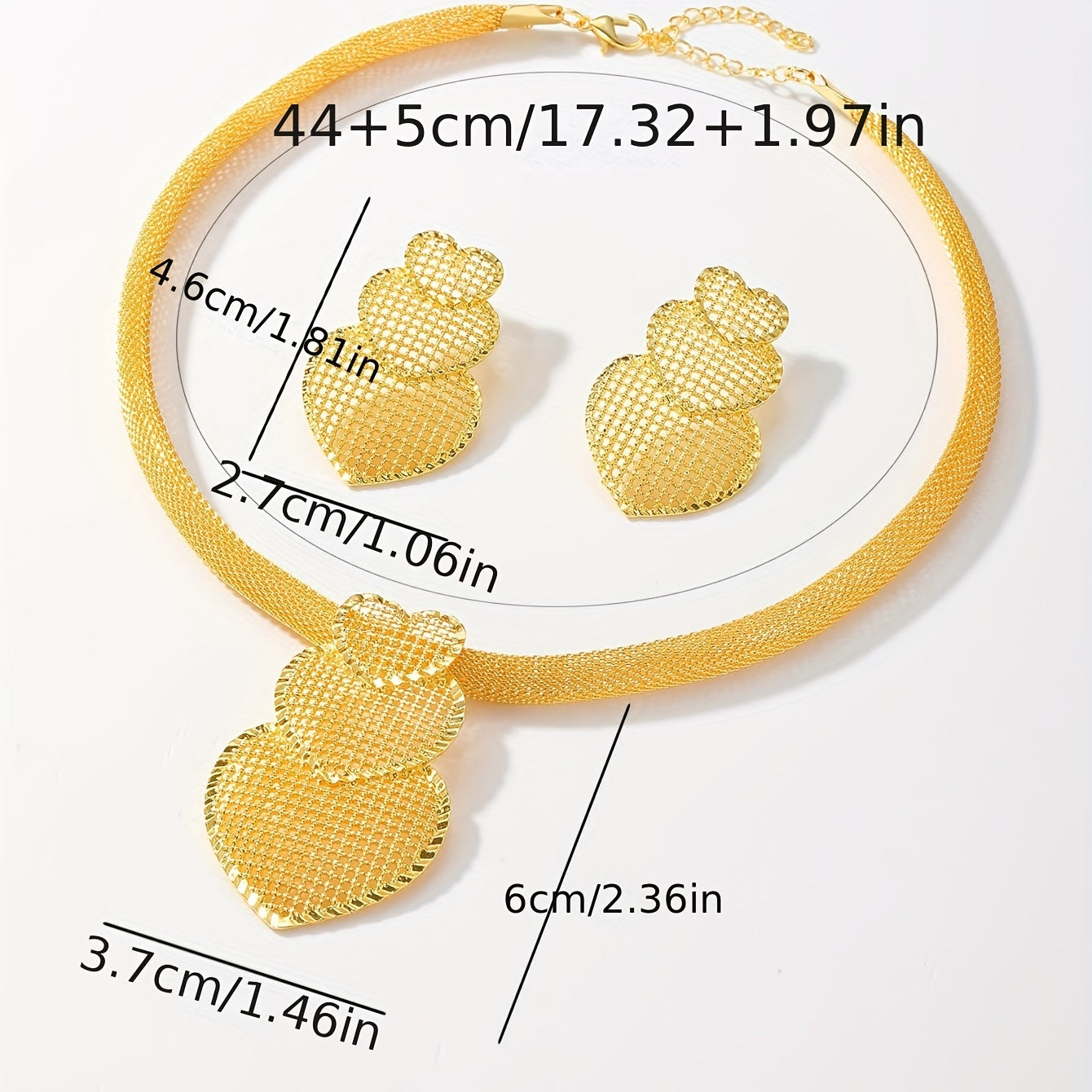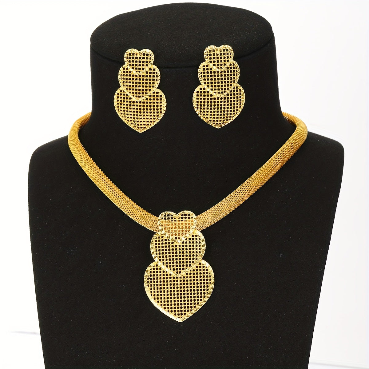 Elegant banquet jewelry set featuring a hollow love heart pendant necklace and matching dangle earrings. Crafted from 18K plated copper for a luxurious look.