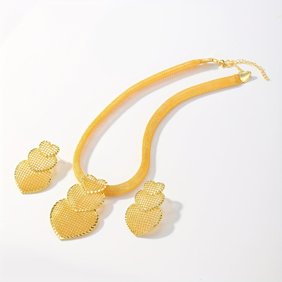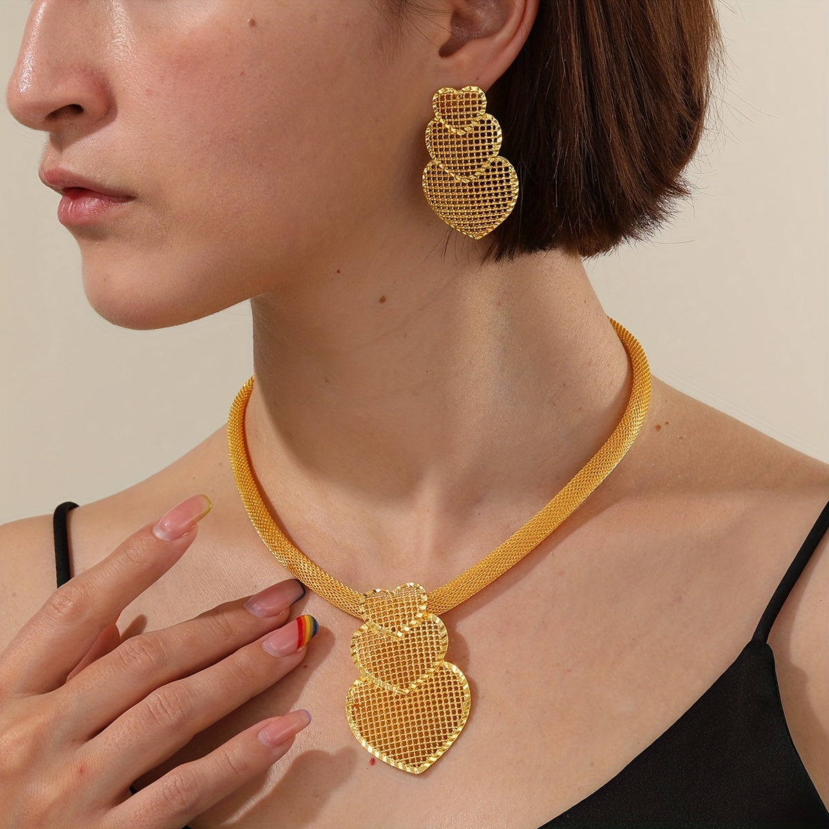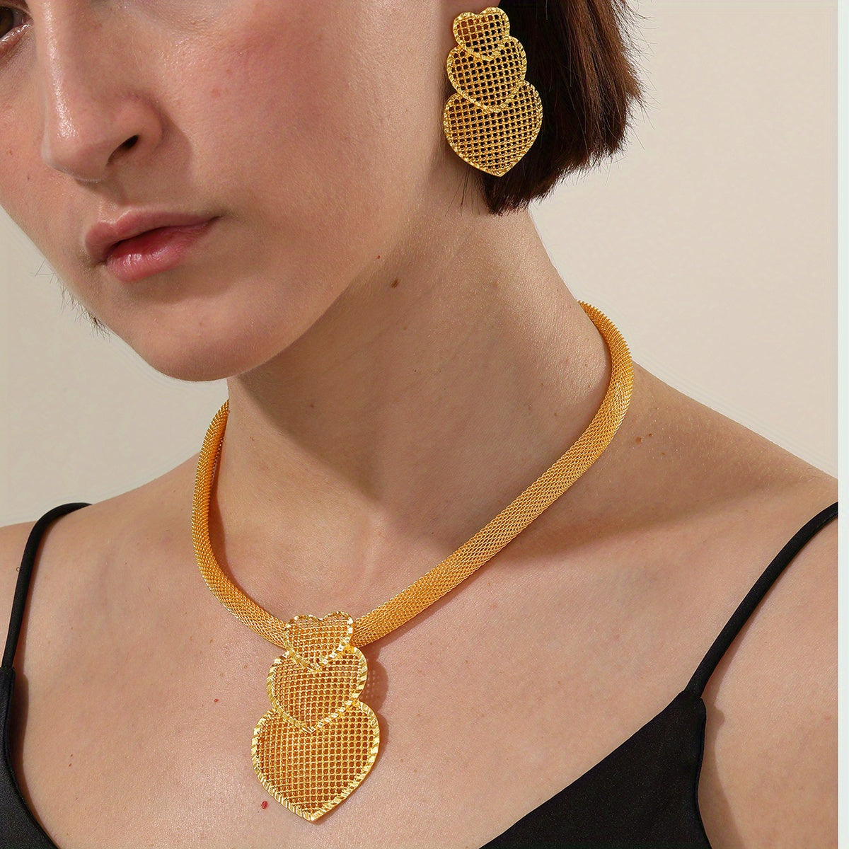 Elegant banquet jewelry set featuring a hollow love heart pendant necklace and matching dangle earrings. Crafted from 18K plated copper for a luxurious look.