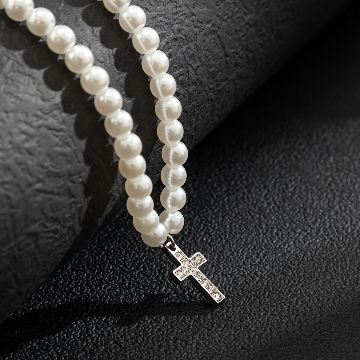 Enhance your style with this exquisite men's necklace featuring a cross pendant accented with artificial diamonds and pearl beads.