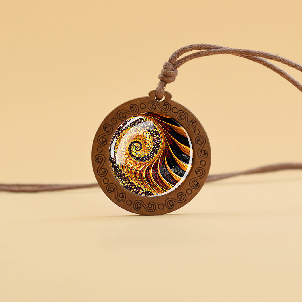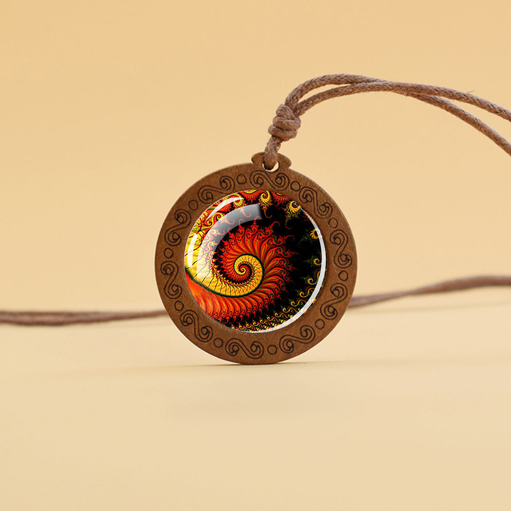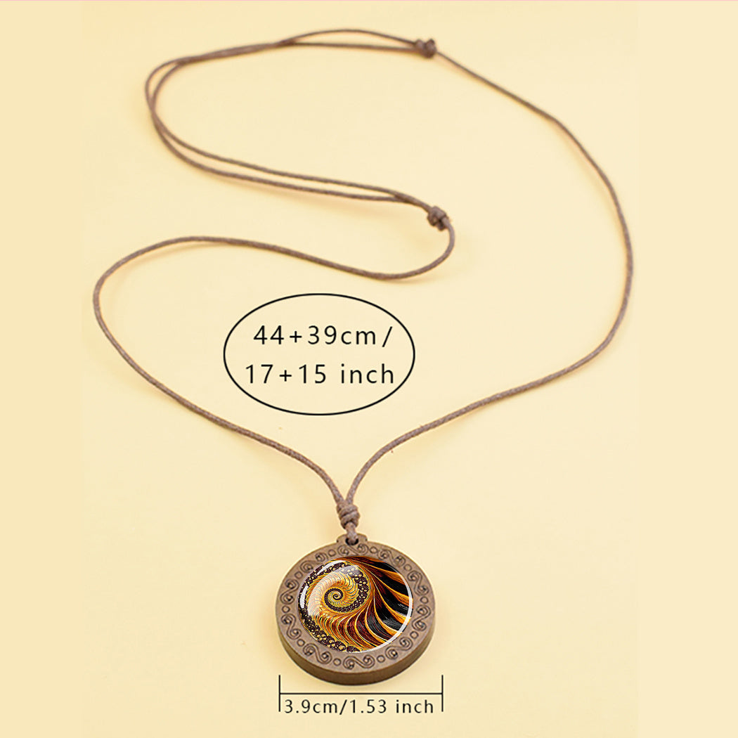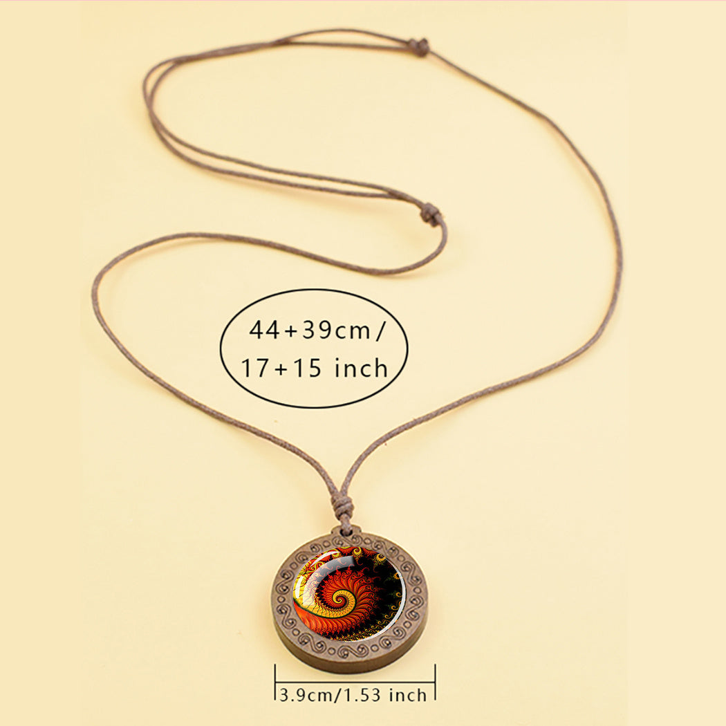 This necklace features a Fibonacci spiral design in a golden ratio, made with glass and wooden materials. It comes with a rope chain for easy wear and is a perfect accessory gift for men.