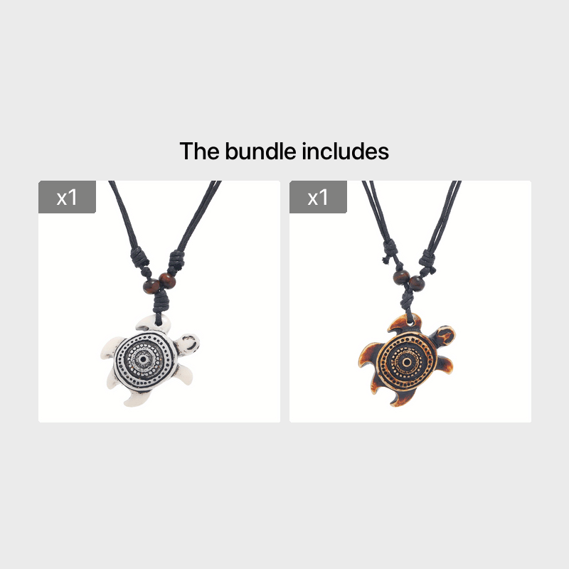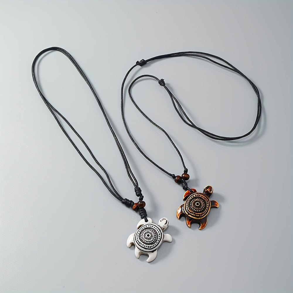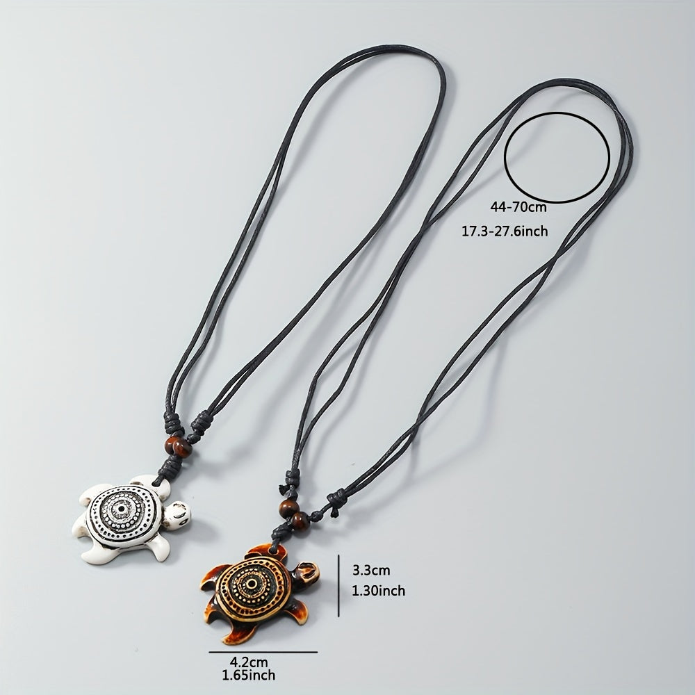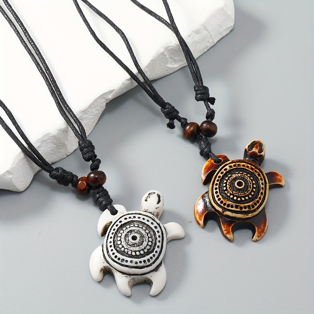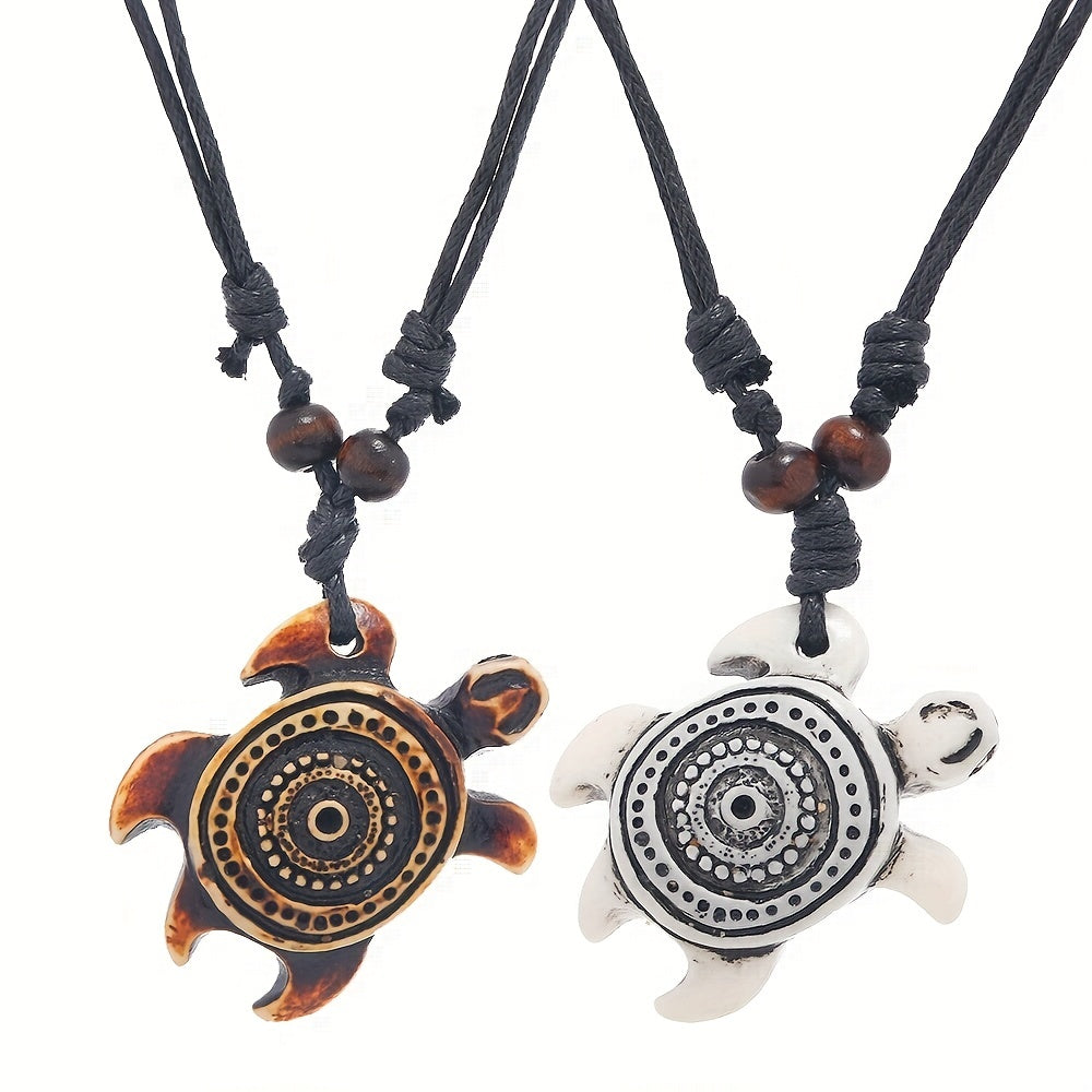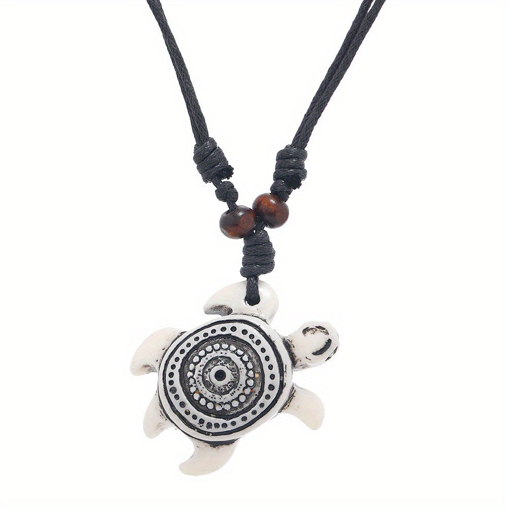 This necklace features a carved hook turtle charm design ideal for surfers. It is adjustable to fit different sizes.