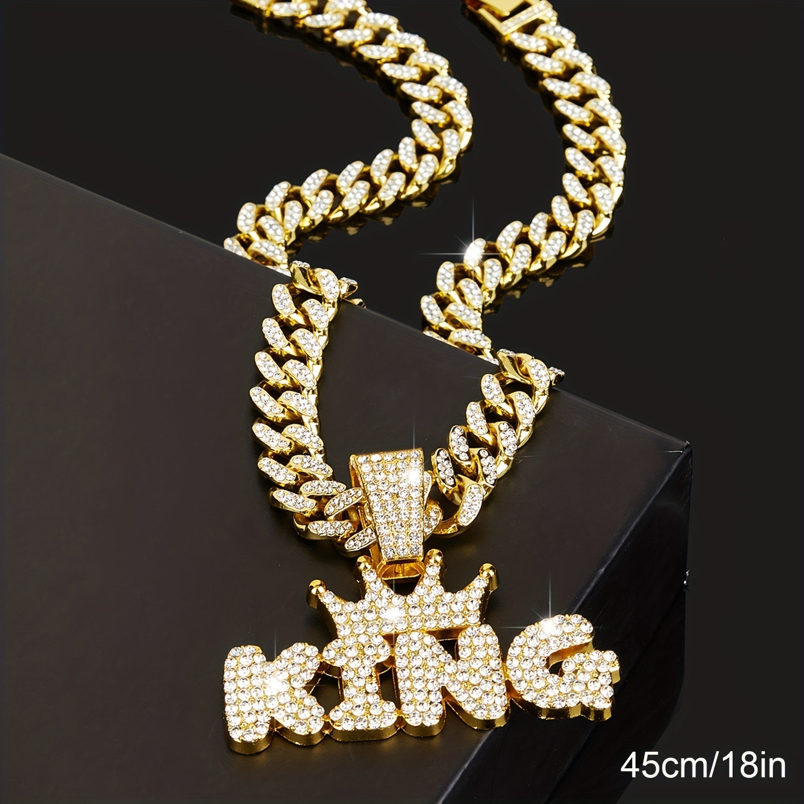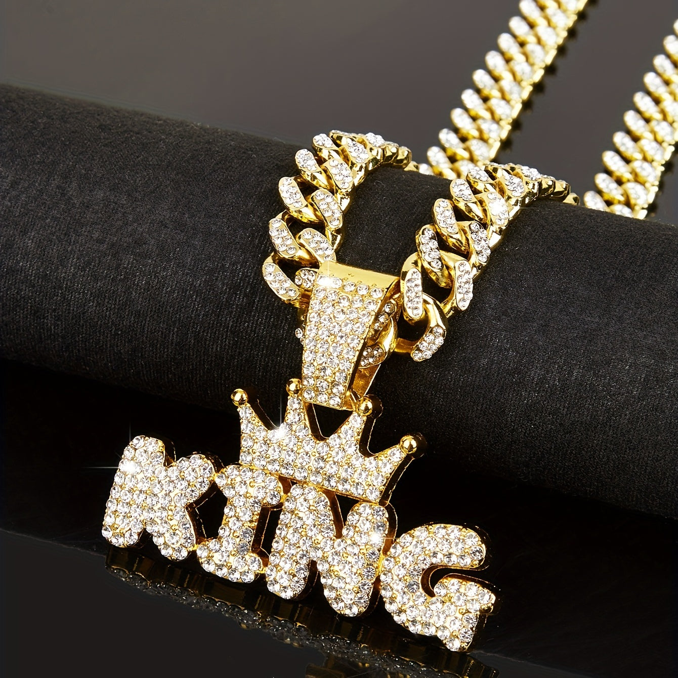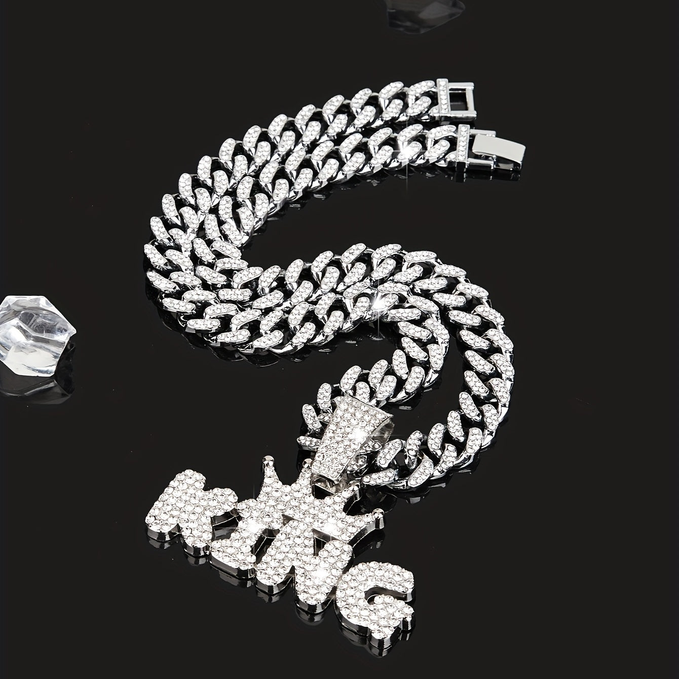 This stylish Miami Punk Hip hop Crown Letter KING Pendant necklace features inlaid rhinestones, making it a great unisex neck jewelry gift.