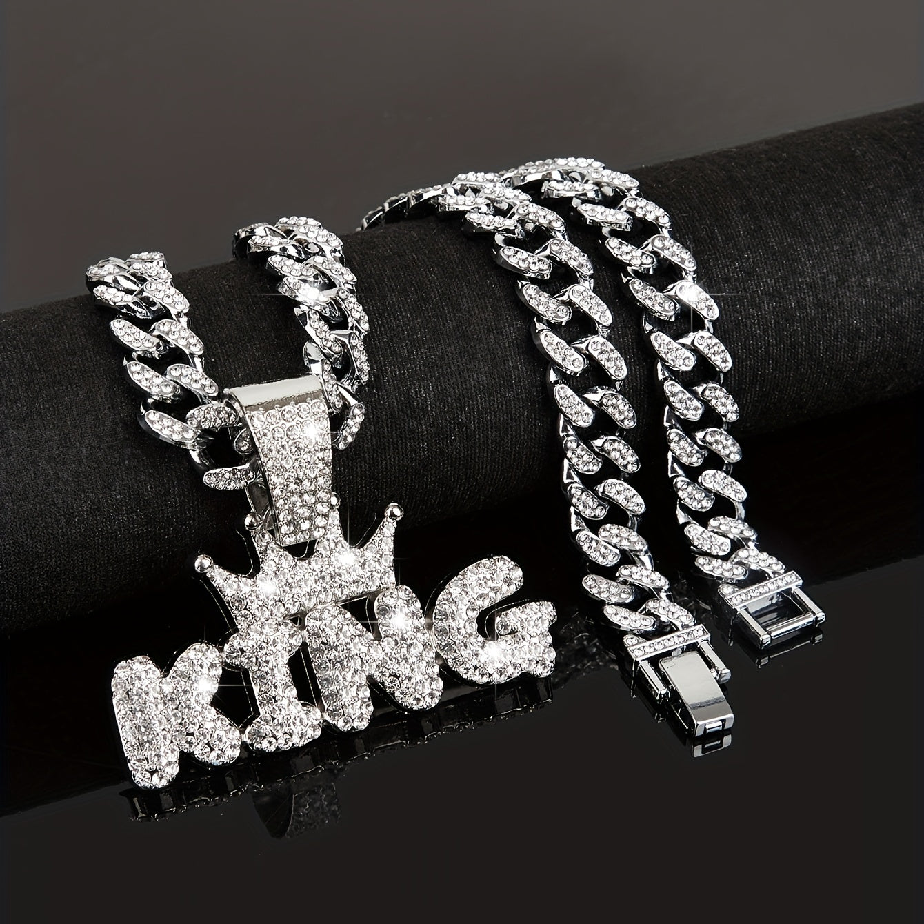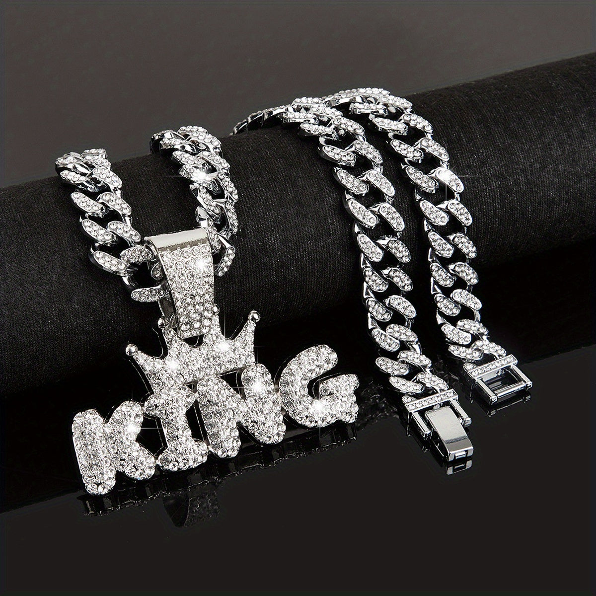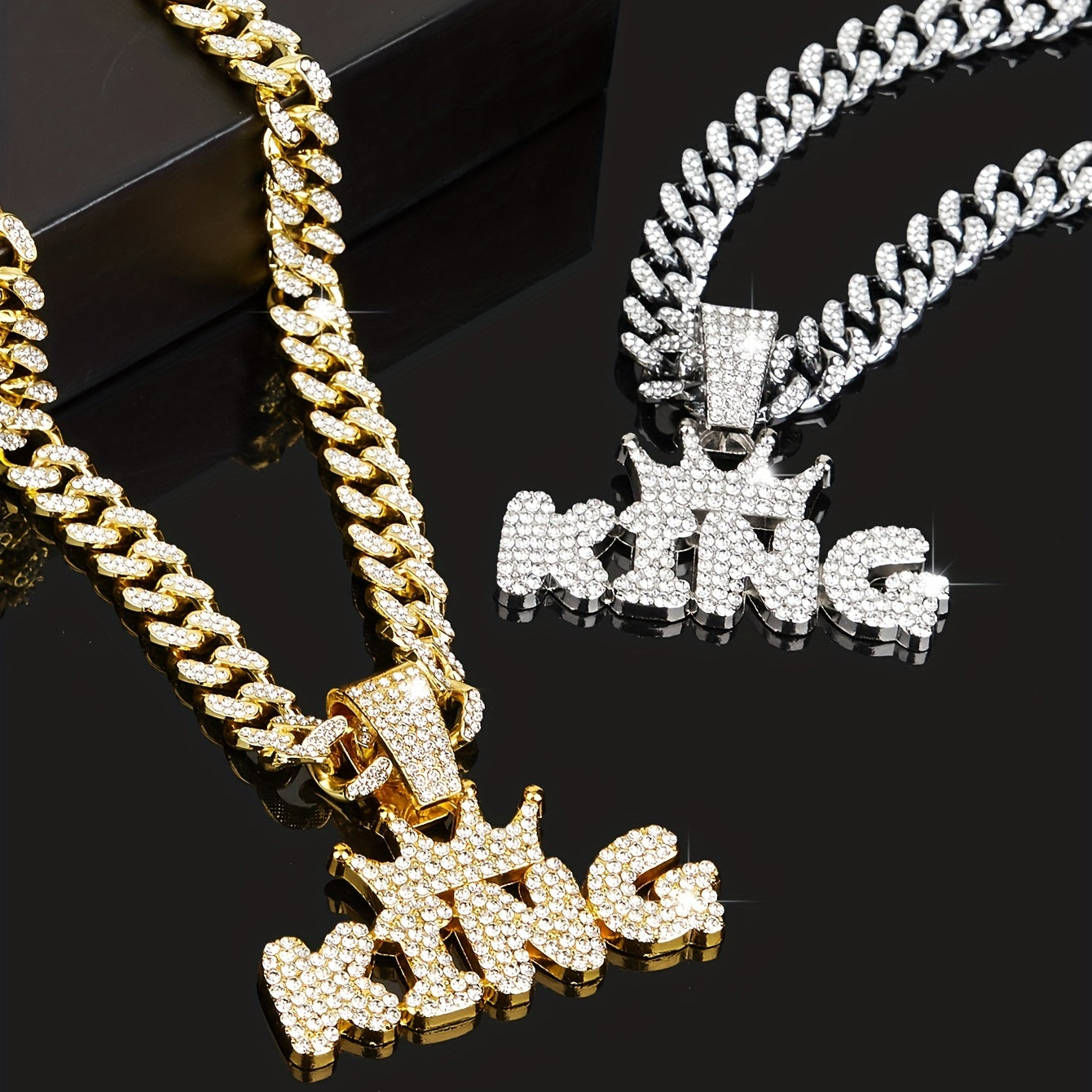 This stylish Miami Punk Hip hop Crown Letter KING Pendant necklace features inlaid rhinestones, making it a great unisex neck jewelry gift.