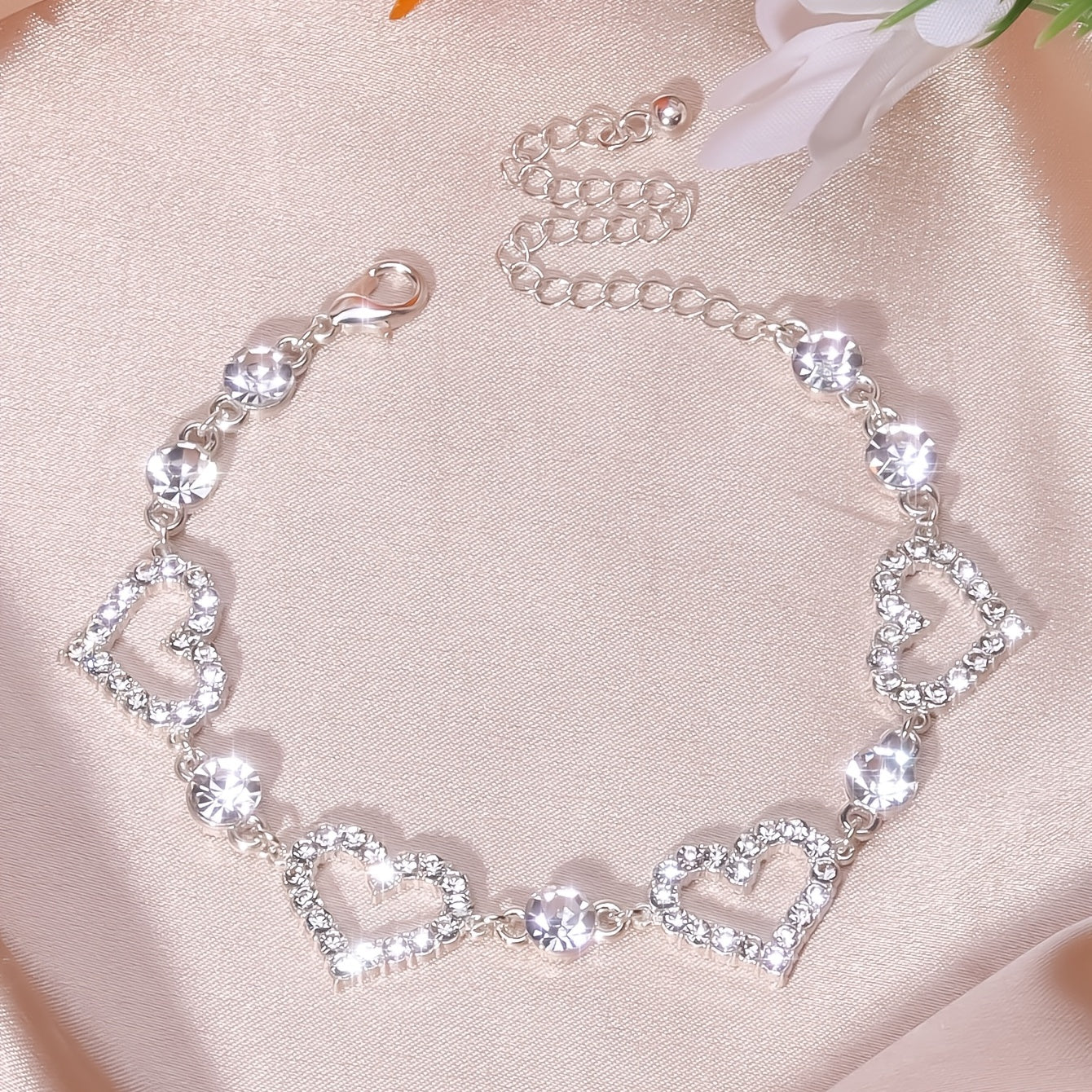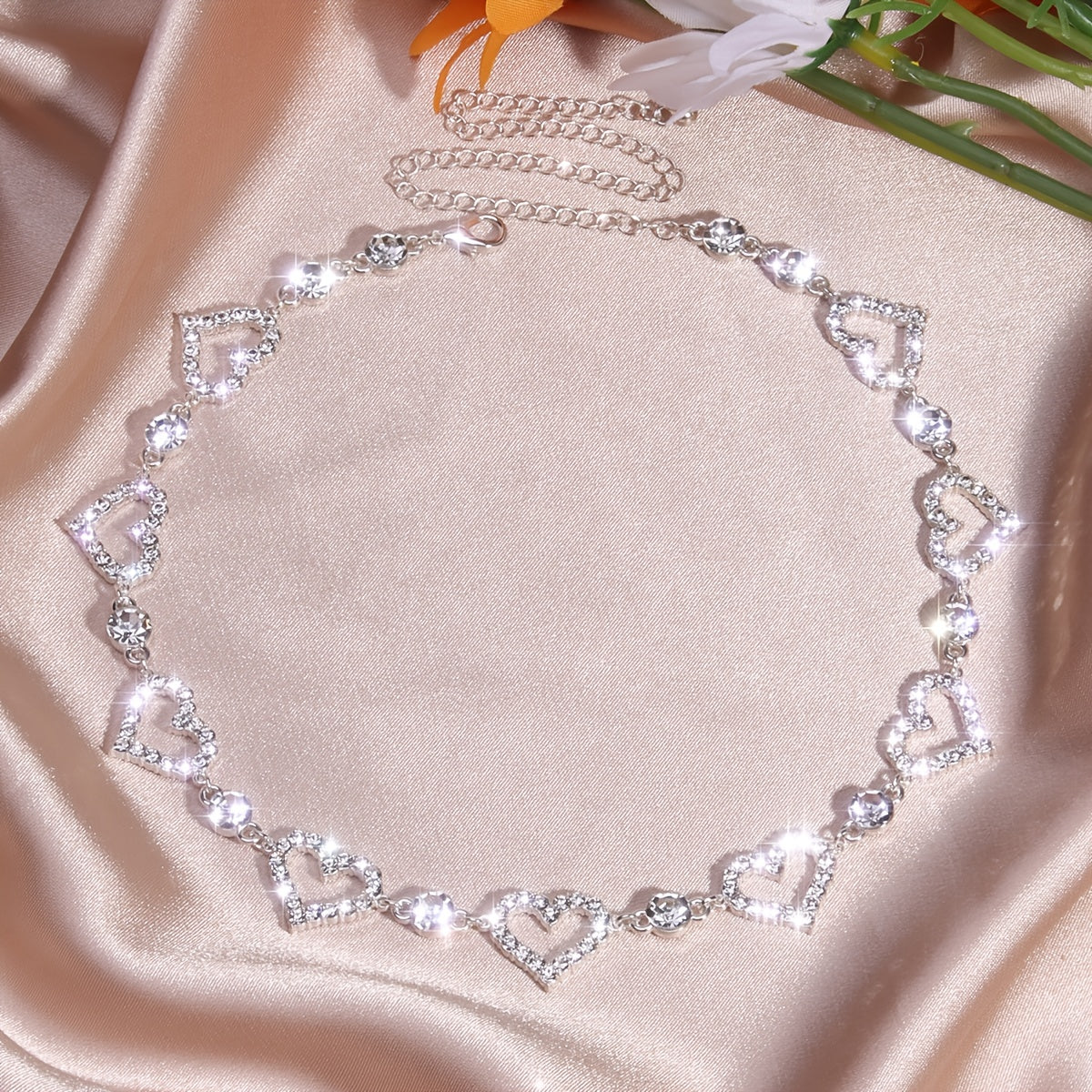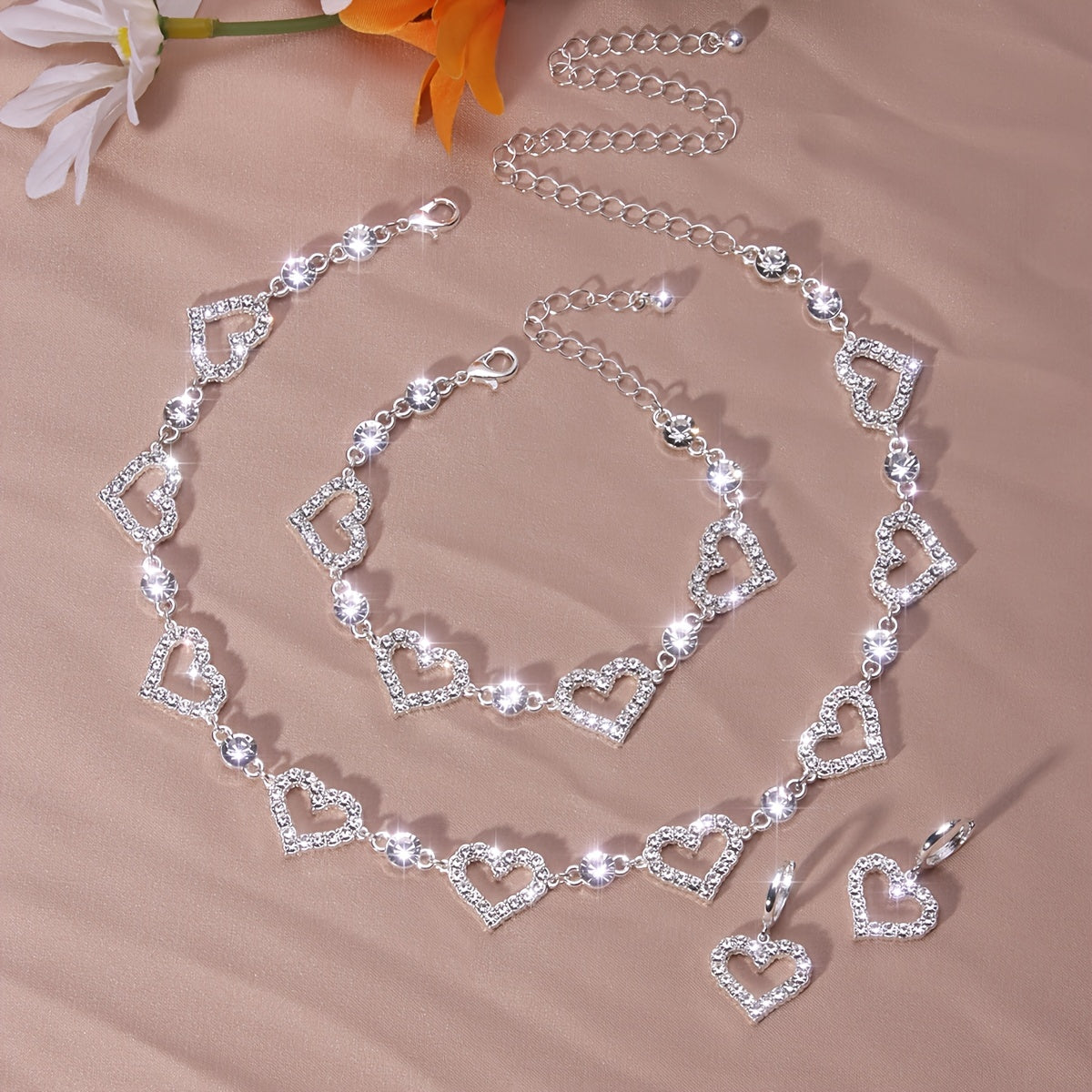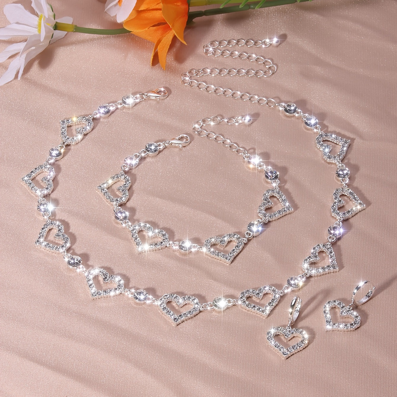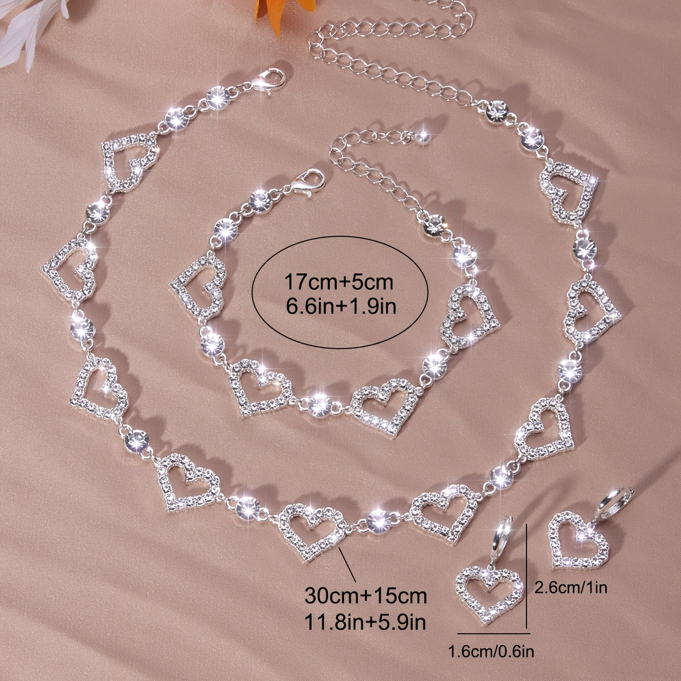 Complete your glamorous look with this stunning rhinestone jewelry set featuring a hollow heart choker necklace, dangle earrings, and an adjustable chain bracelet. Perfect for any special occasion or as a gift.