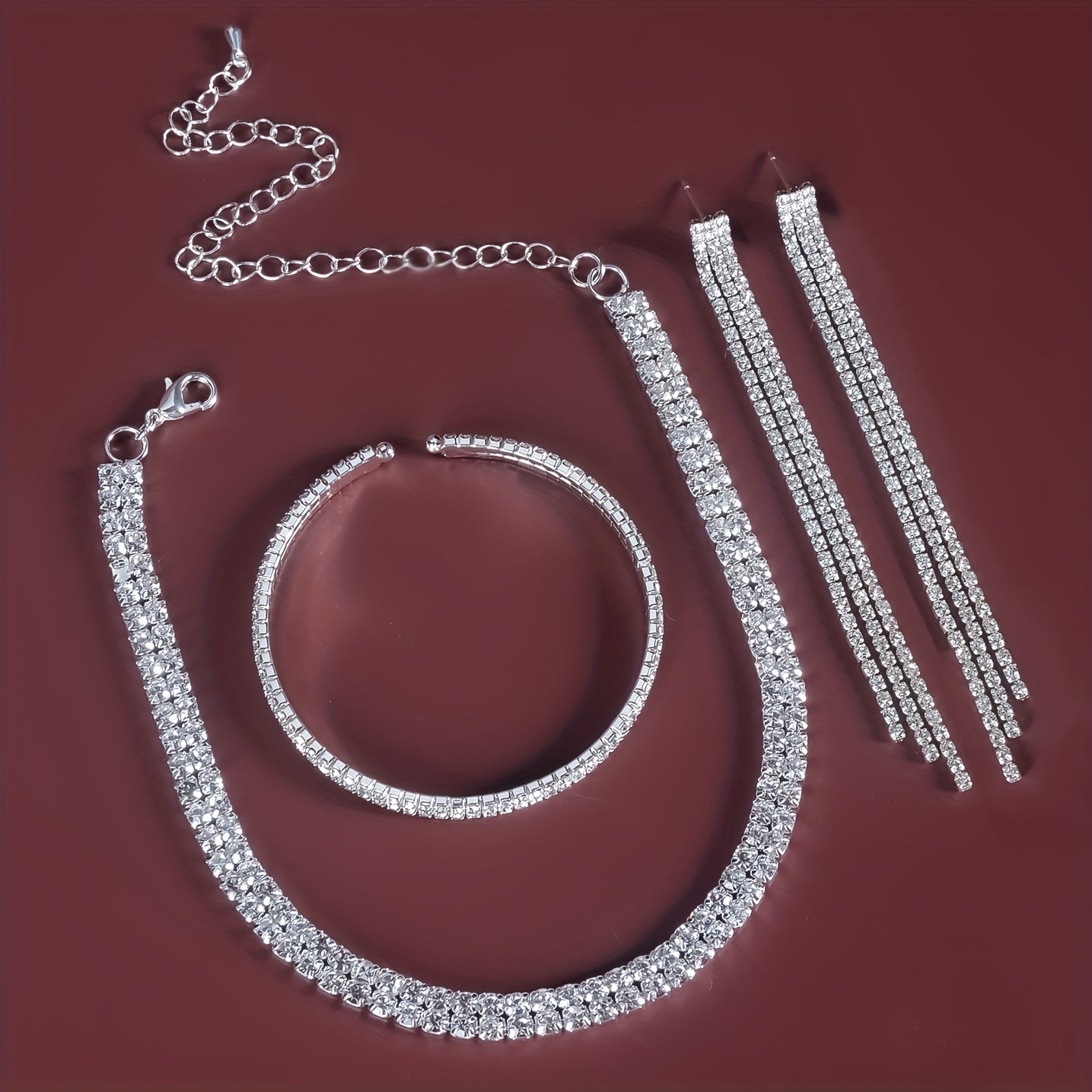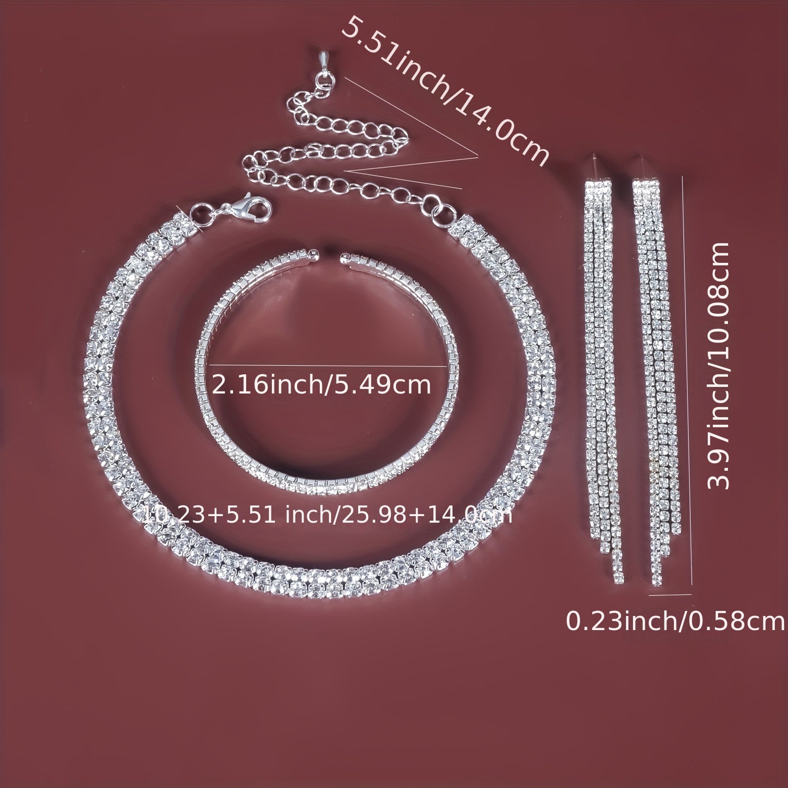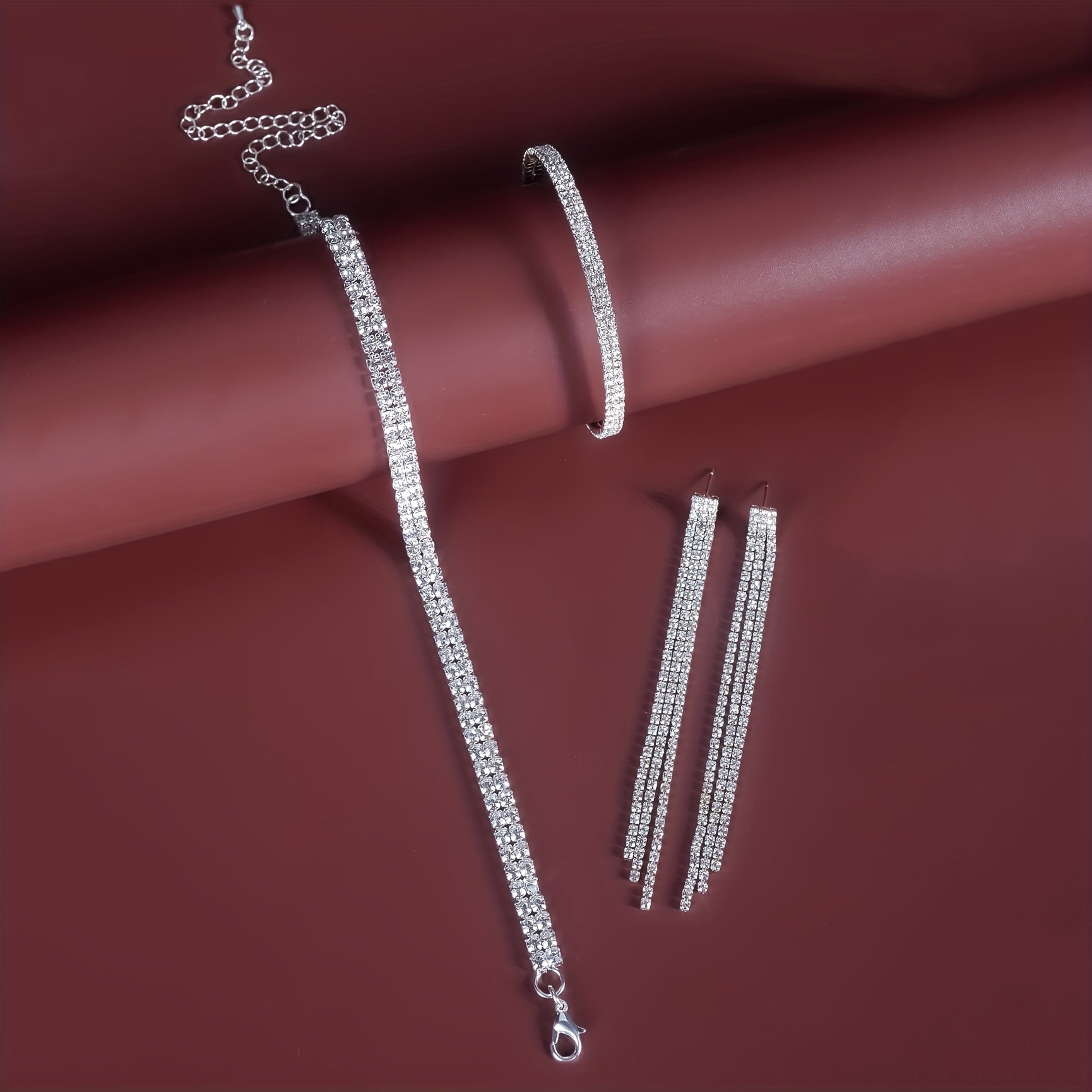 Elegant and timeless jewelry set featuring classic rhinestone tassel design. The set includes earrings, necklace, and cuff bracelet, all silver plated.