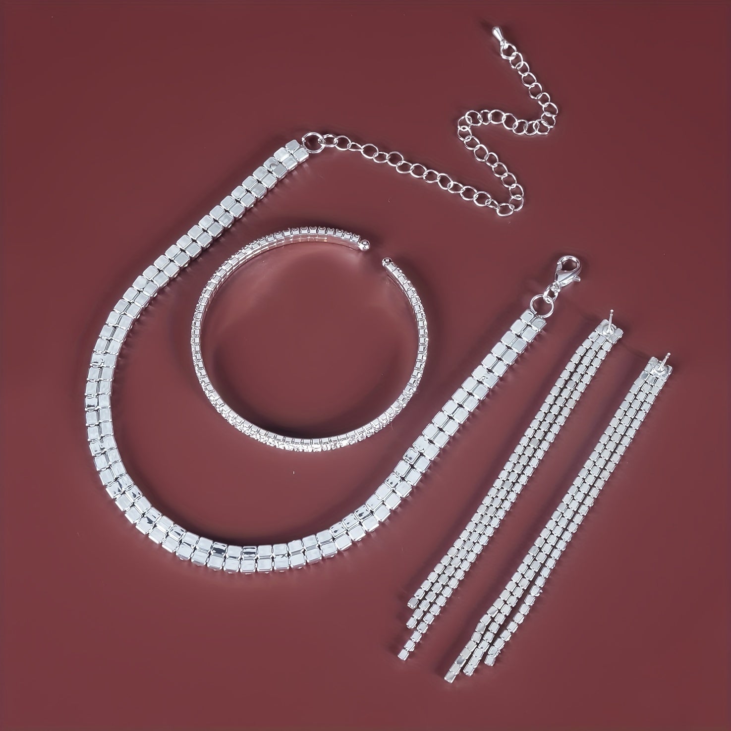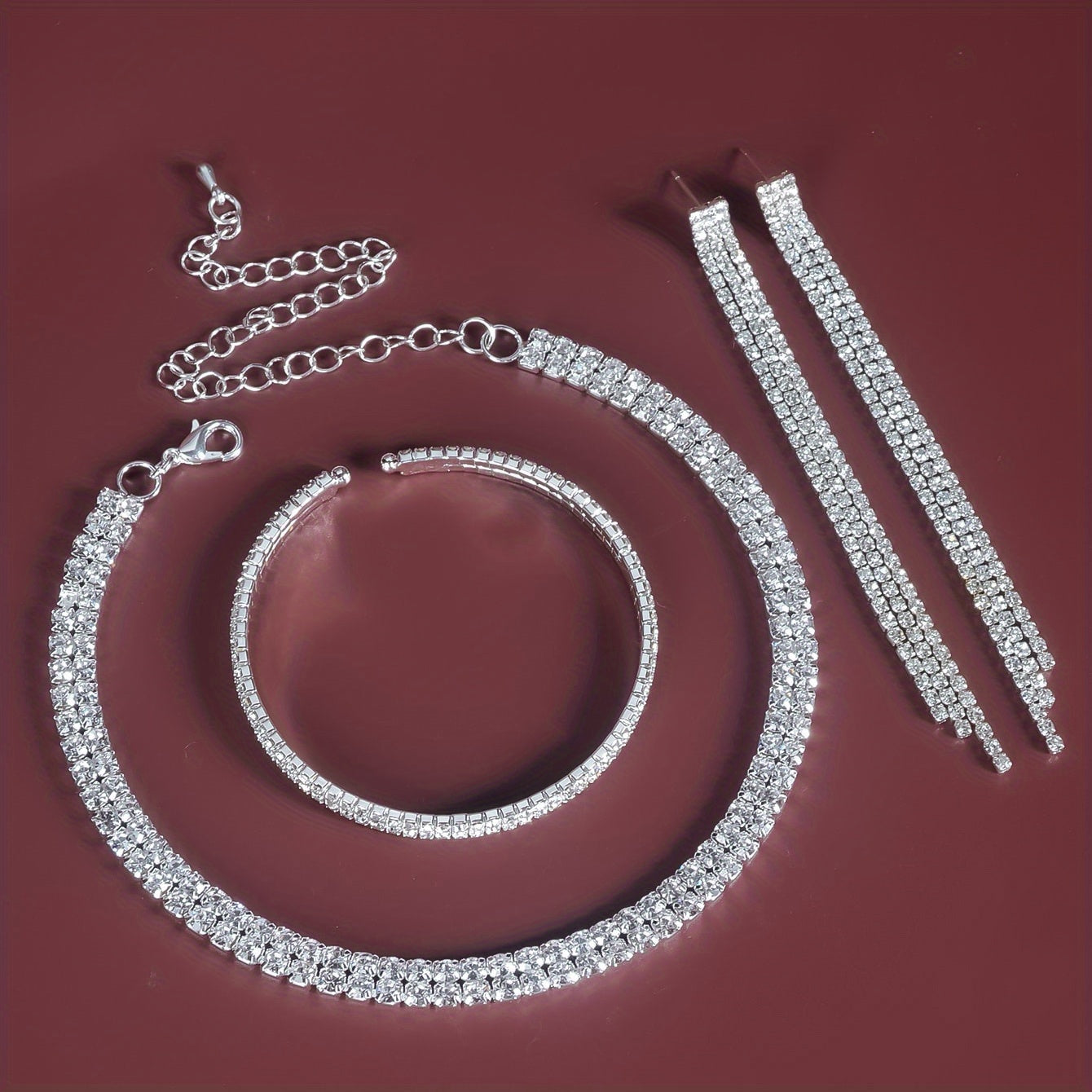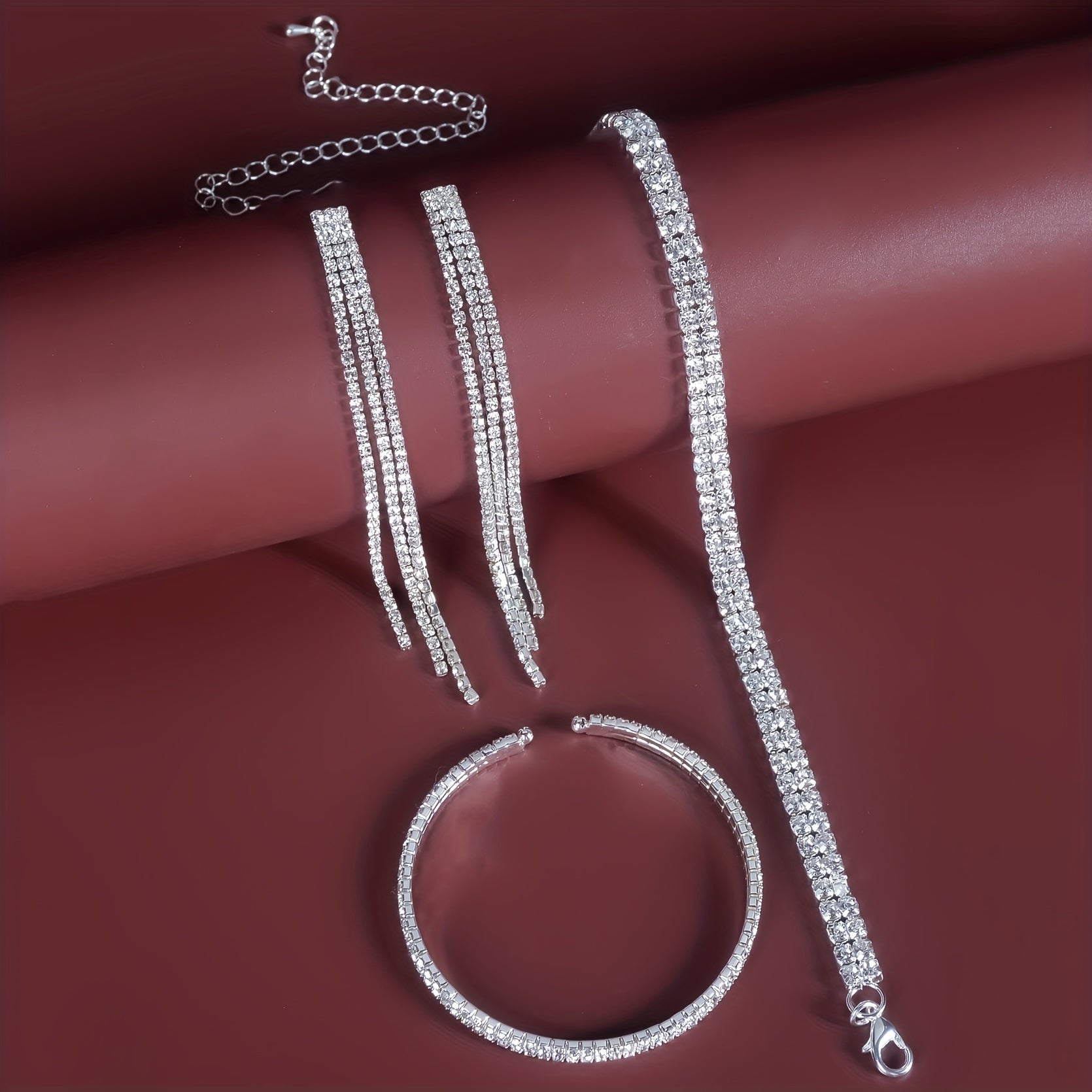 Elegant and timeless jewelry set featuring classic rhinestone tassel design. The set includes earrings, necklace, and cuff bracelet, all silver plated.