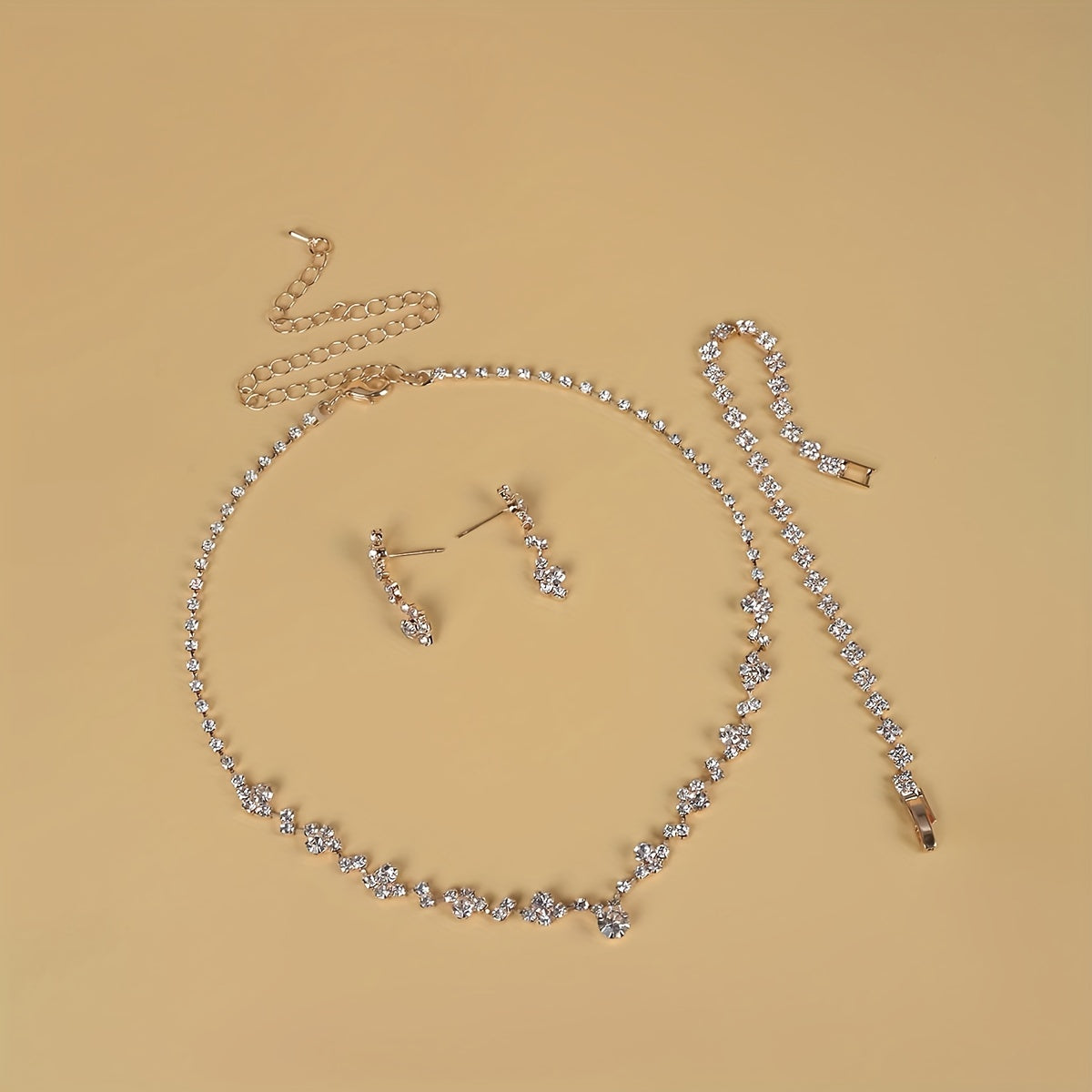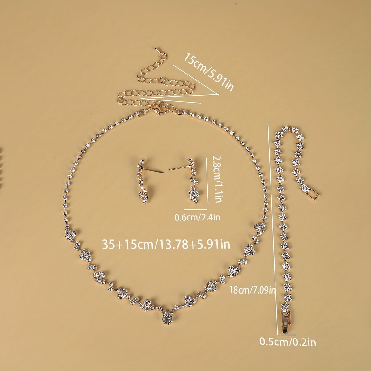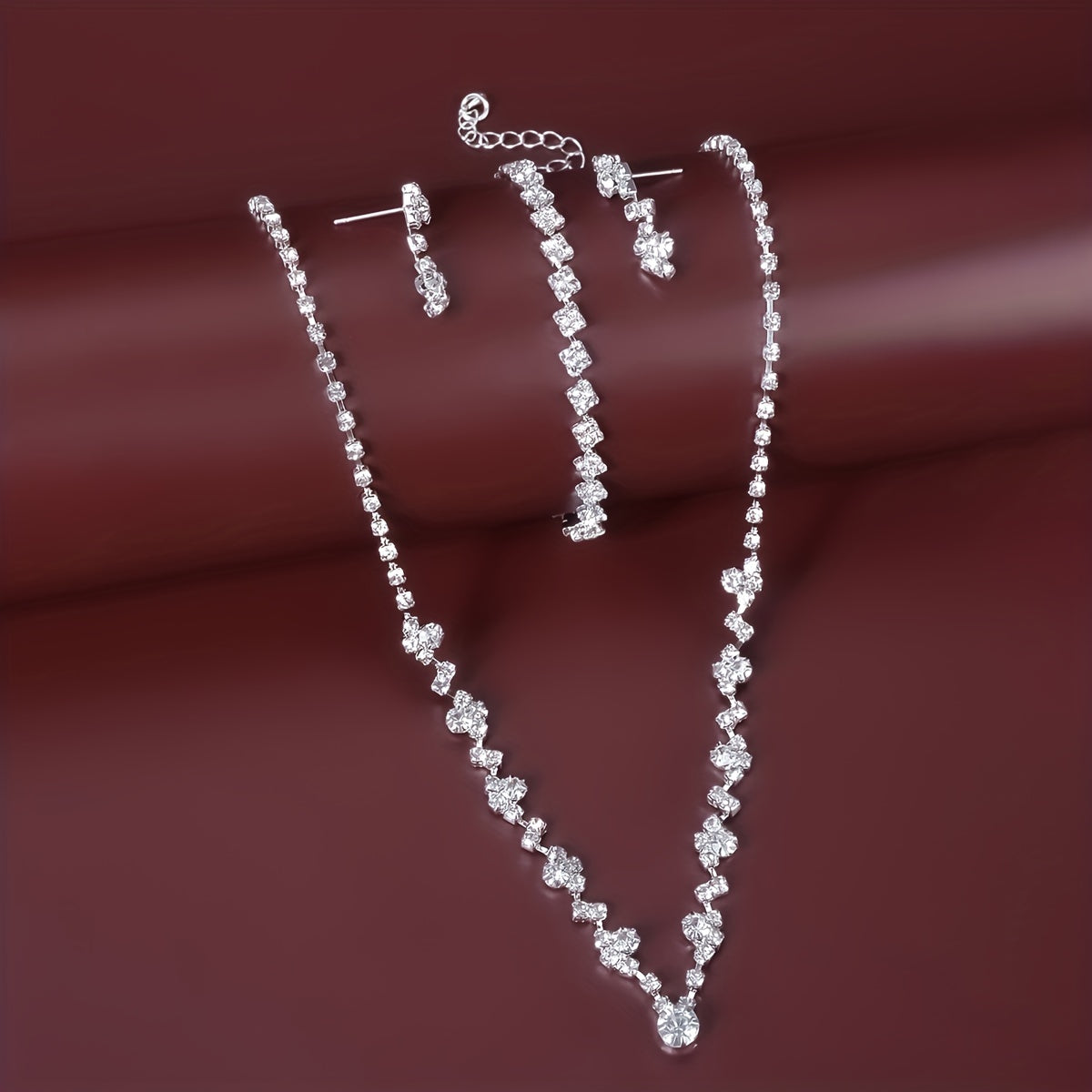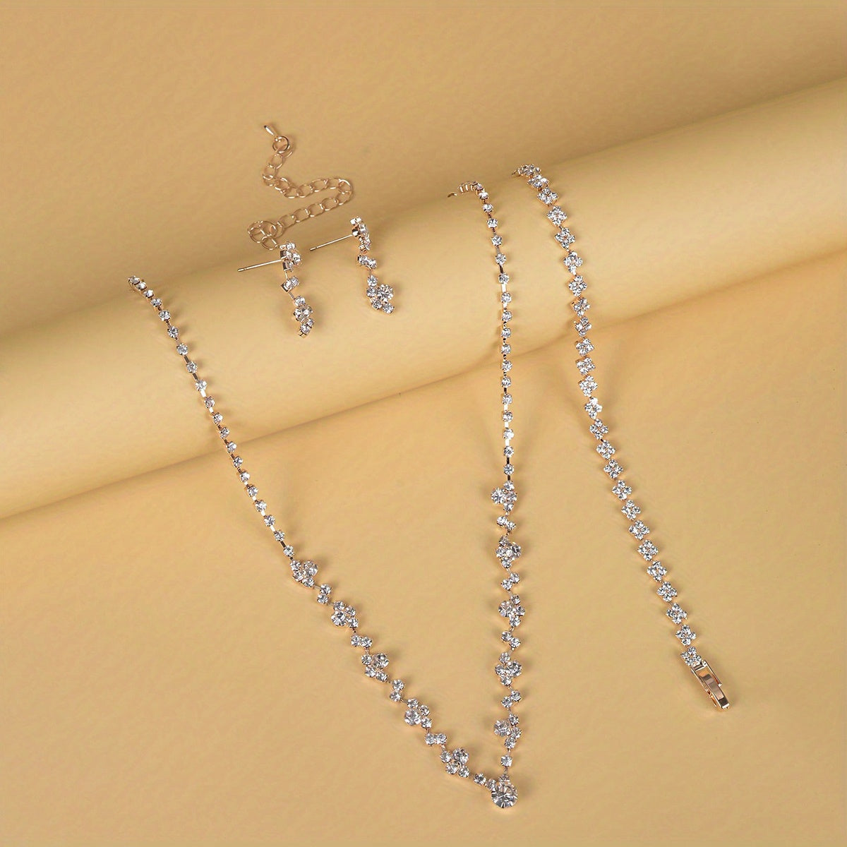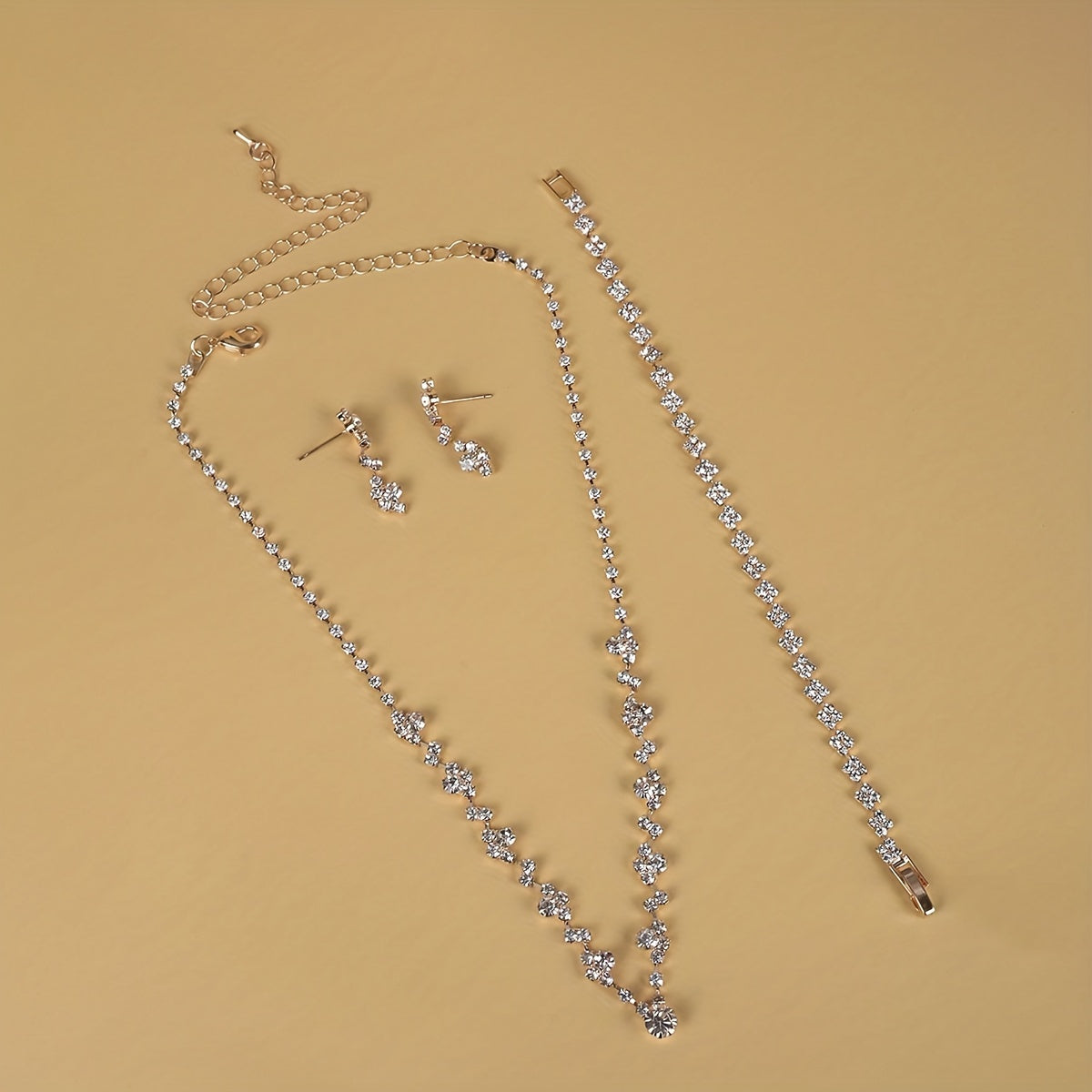 Complete your look with this elegant Rhinestones Jewelry Set featuring a pendant necklace, dangle earrings, and a chain bracelet. Perfect for weddings, dinners, and special occasions.