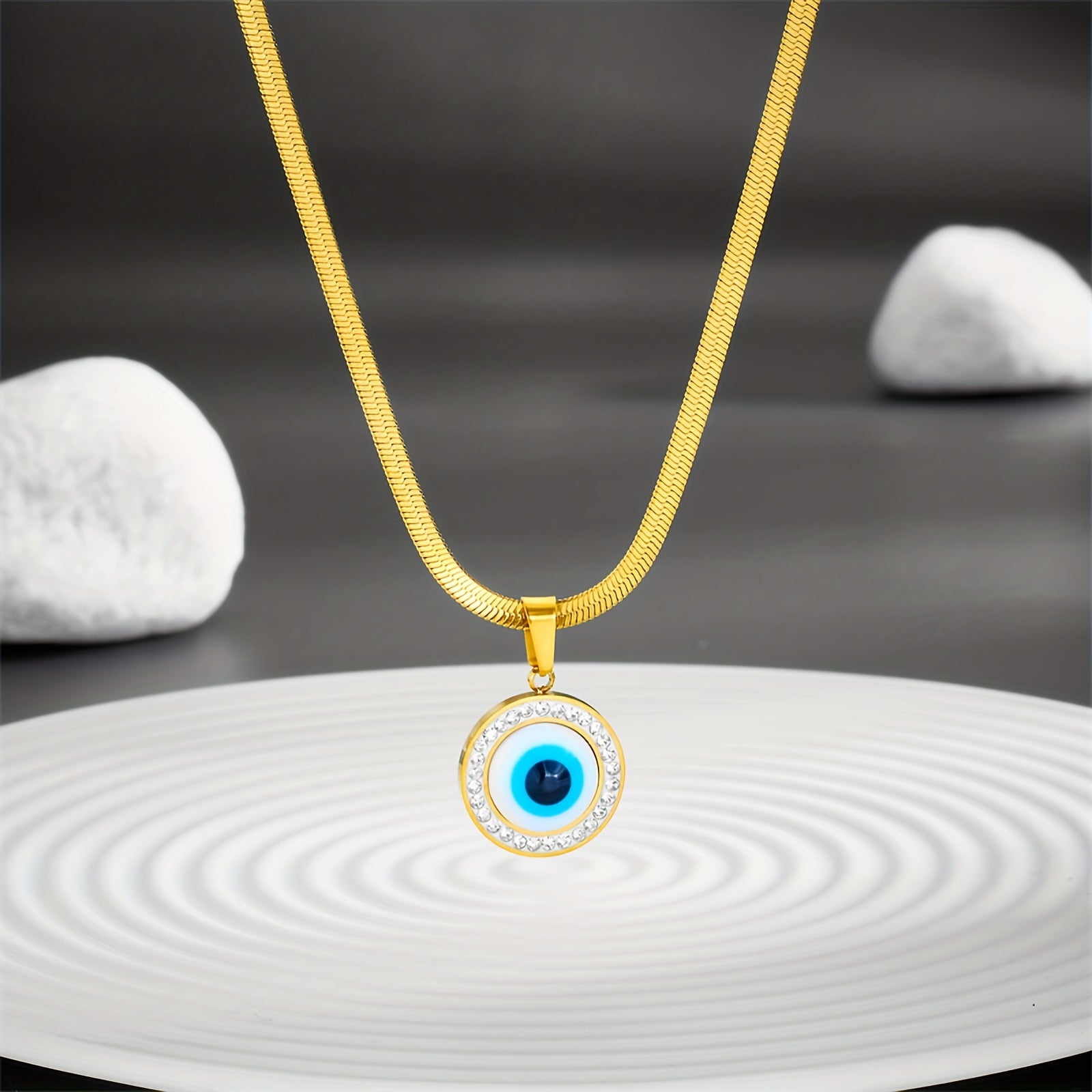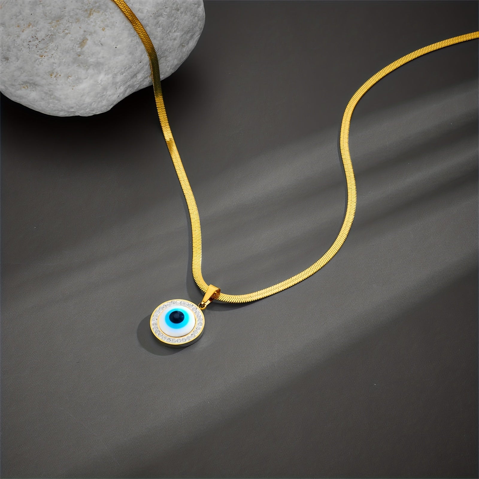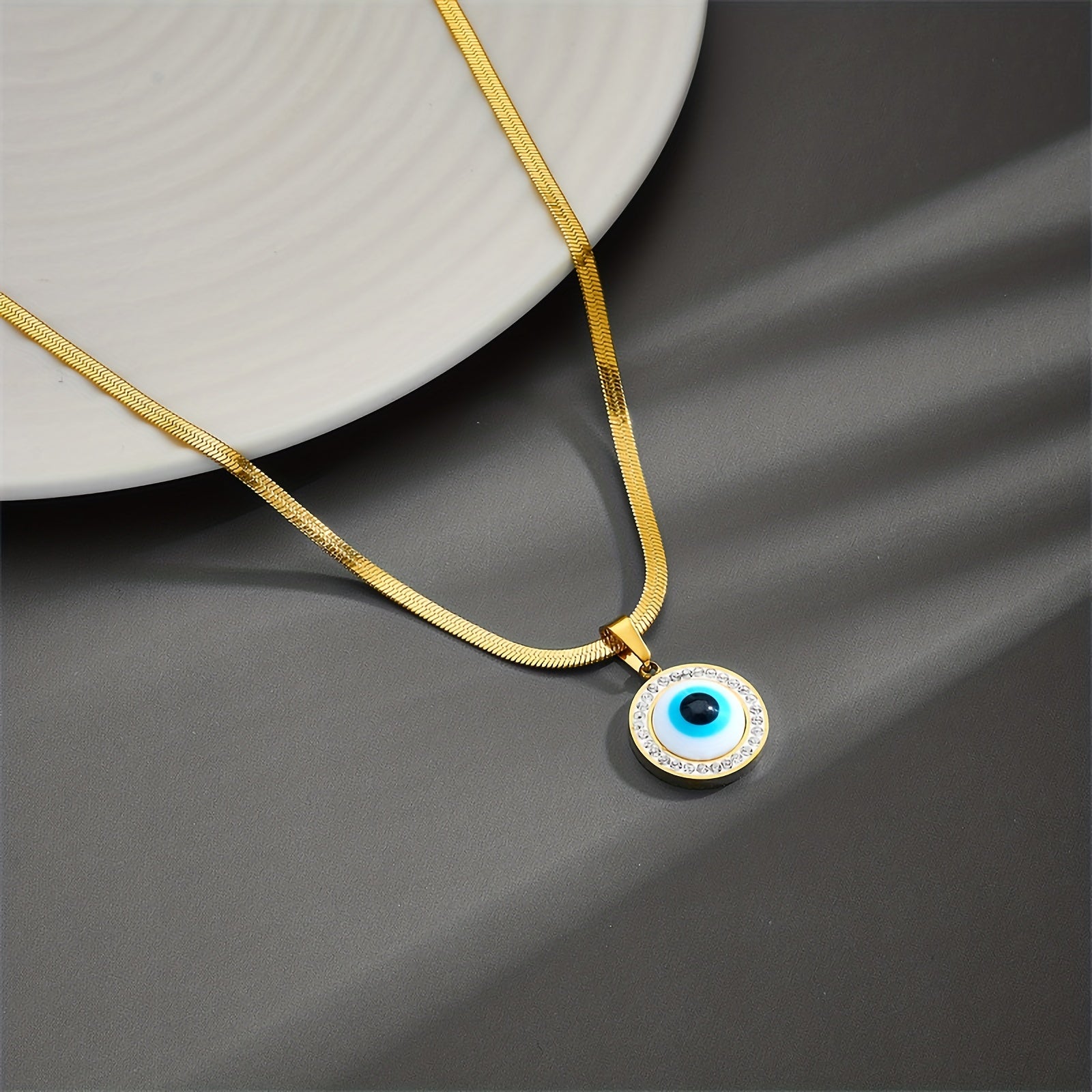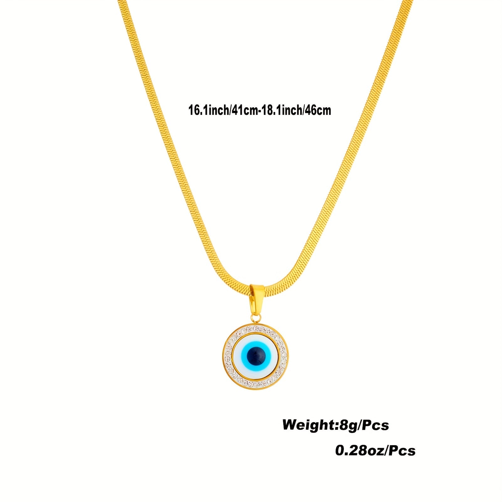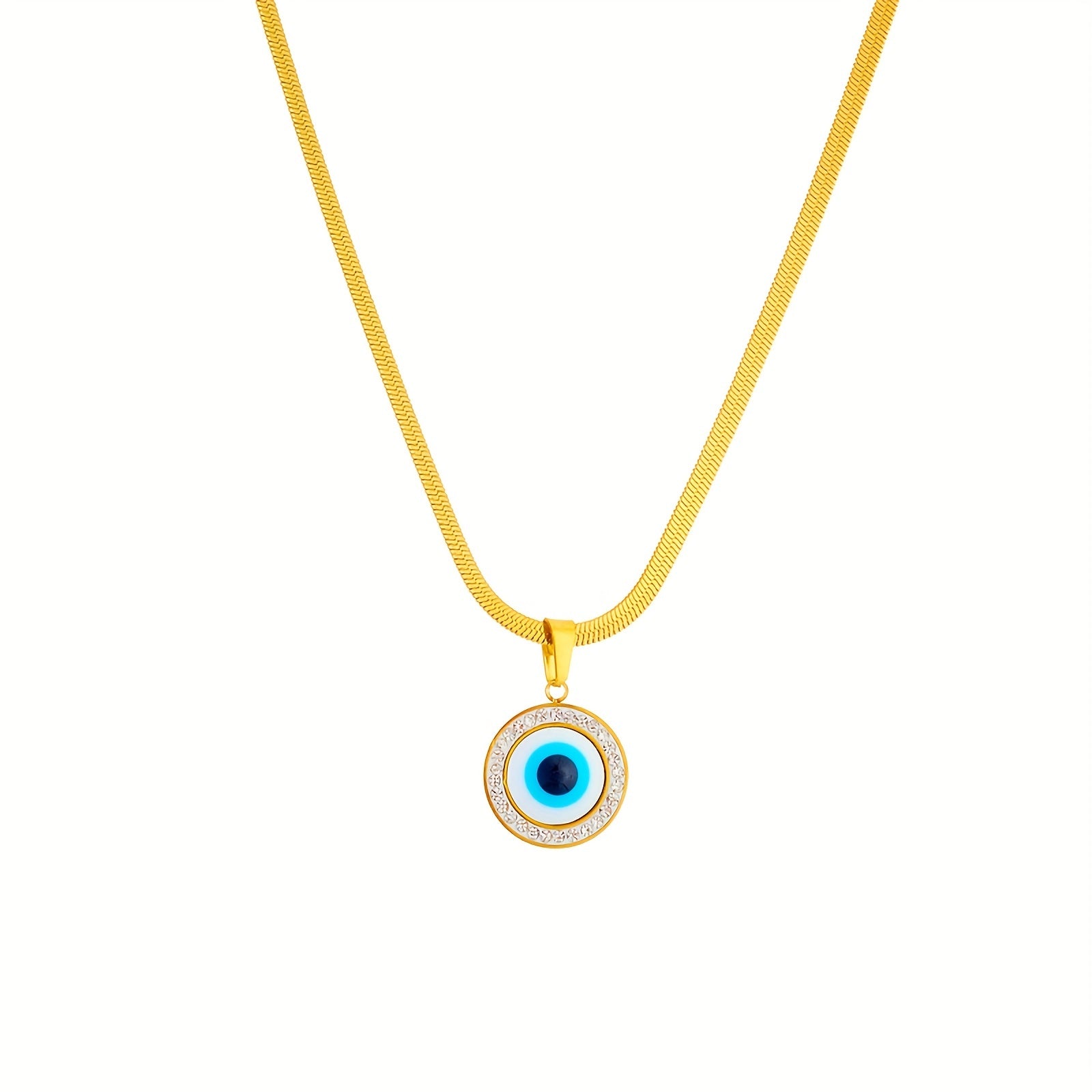 Add a touch of personality to your outfit with this stylish round evil eye pendant necklace. Made of 316 stainless steel plated with 18K gold, this necklace is perfect for daily wear or special occasions.