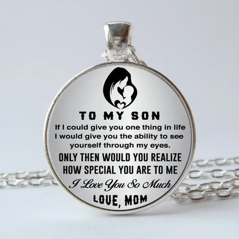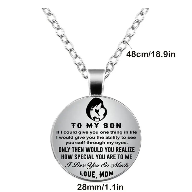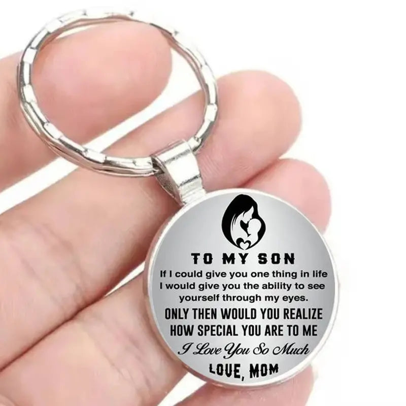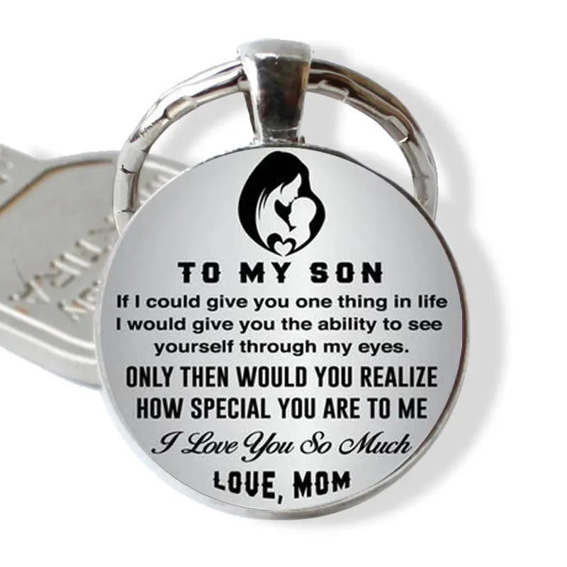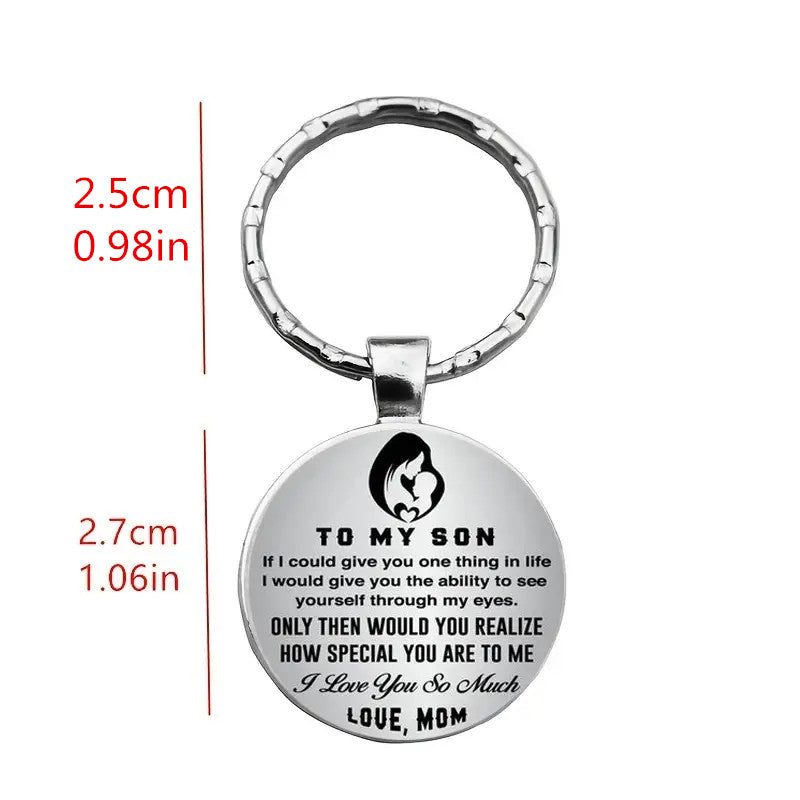 Give your son an unforgettable gift with this round-shaped keychain necklace pendant featuring a letter from a mother's heart.