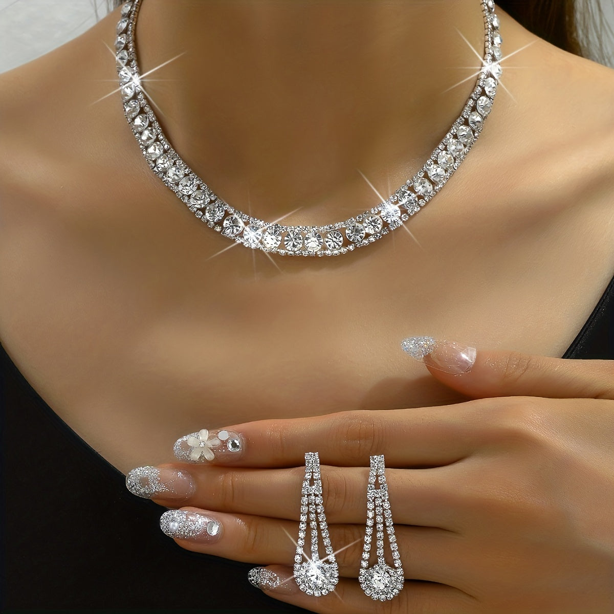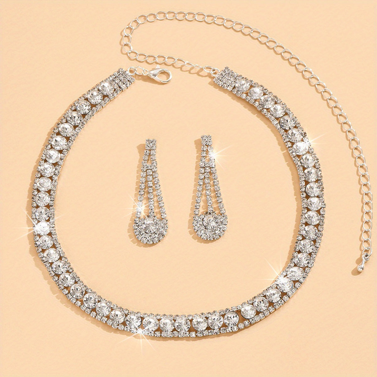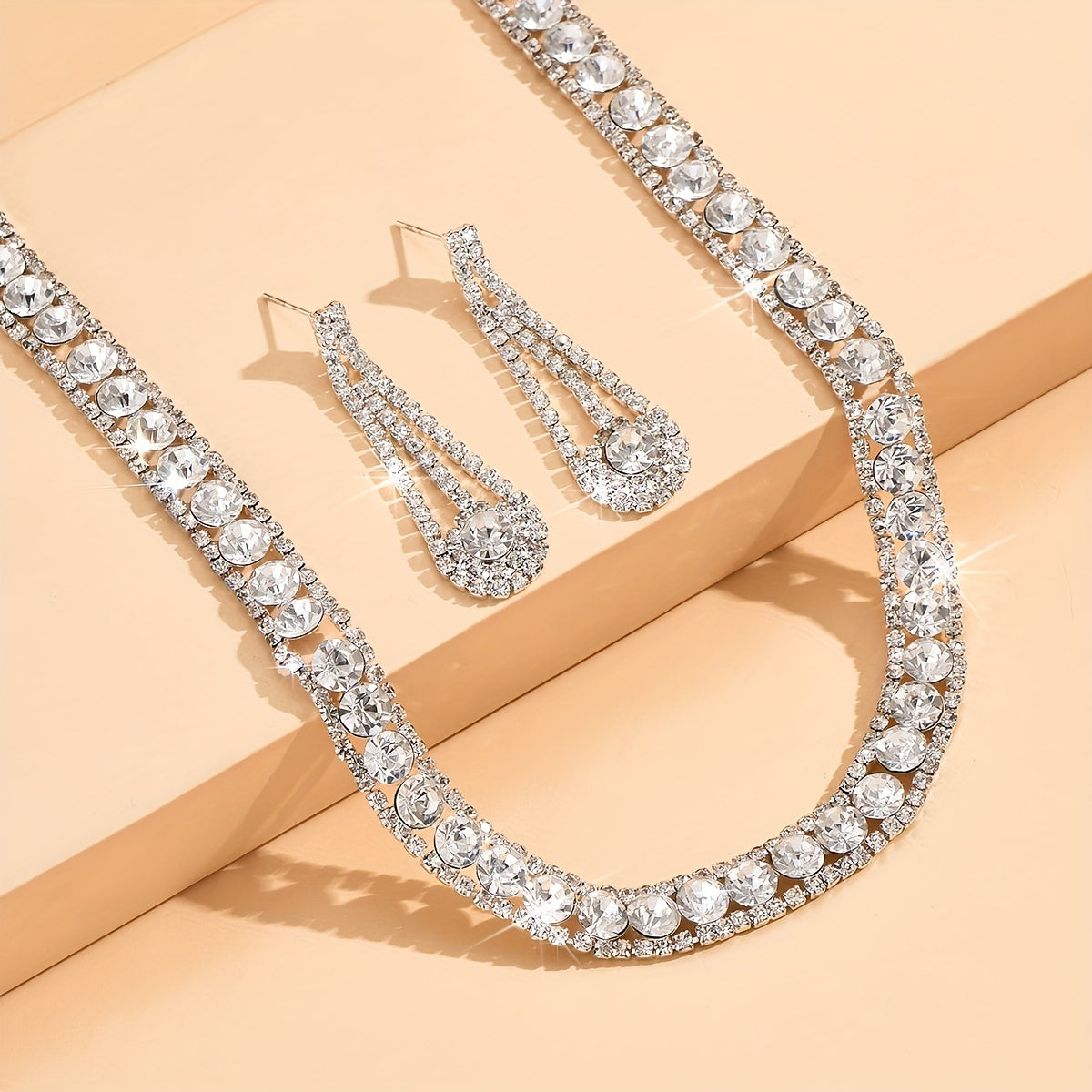 Complete your wedding look with this elegant silver plated jewelry set featuring inlaid rhinestones. Perfect for evening parties and cocktail events.